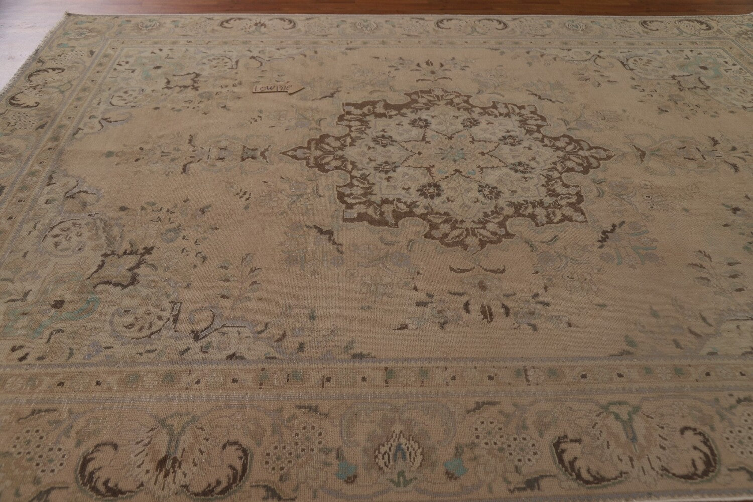 A Beautiful Genuine Persia ( Persia ) Tabriz rug is Hand Knotted by skillful weavers in Persia ( Persia ) with 100% Wool Material. This rug is in Very Good ( Low Pile ) condition. dimensions are 10' 8'' X 7' 7'' in foot and 325 X 231 in centimeter. the primary color is Beige & Ivories.