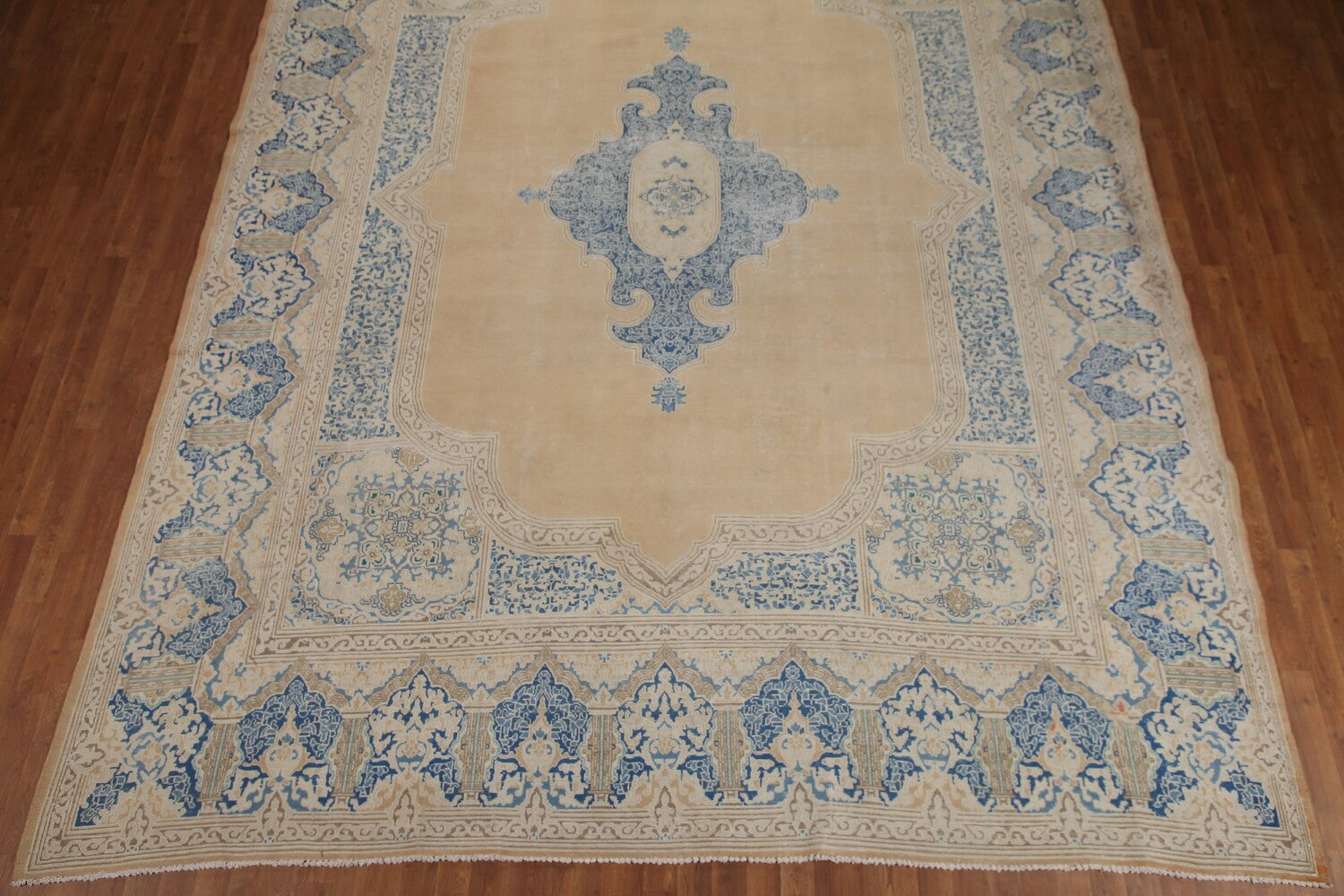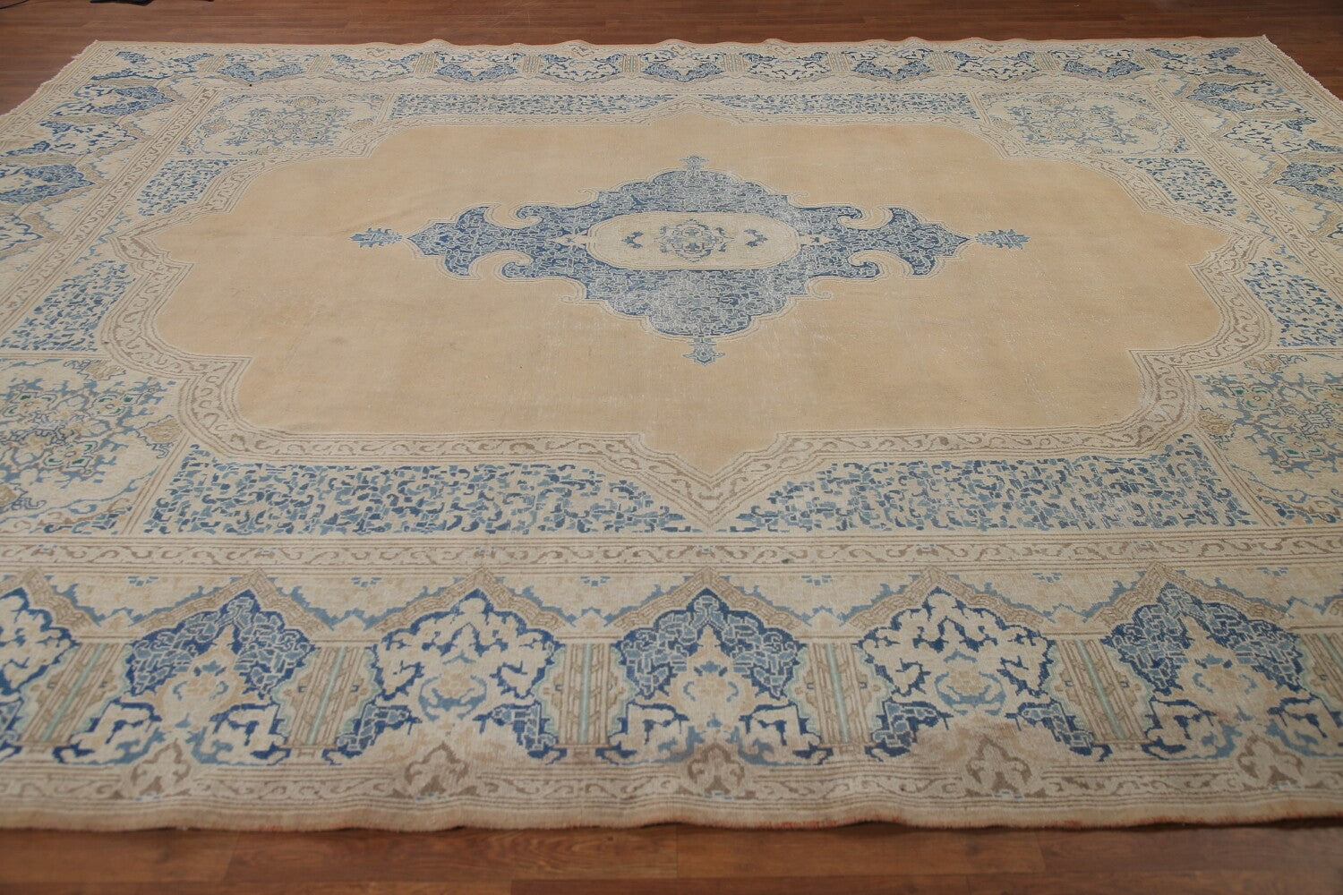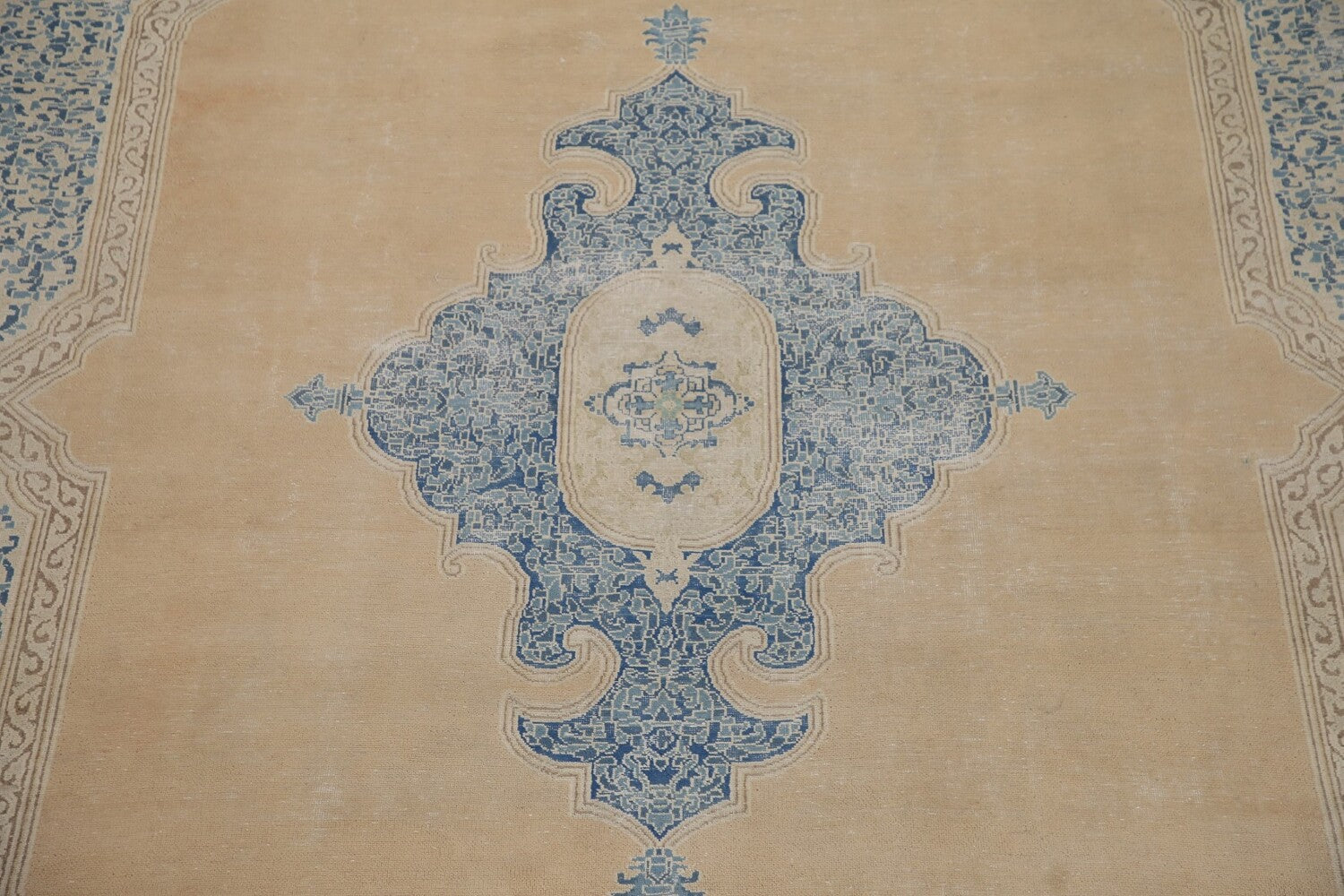 A Beautiful Genuine Persia ( Persia ) Kerman rug is Hand Knotted by skillful weavers in Persia ( Persia ) with 100% Wool Material. This rug is in Very Good (Evenly Low Pile-Repairs) condition. dimensions are 13' 7'' X 10' 5'' in foot and 414 X 318 in centimeter. the primary color is Peach.