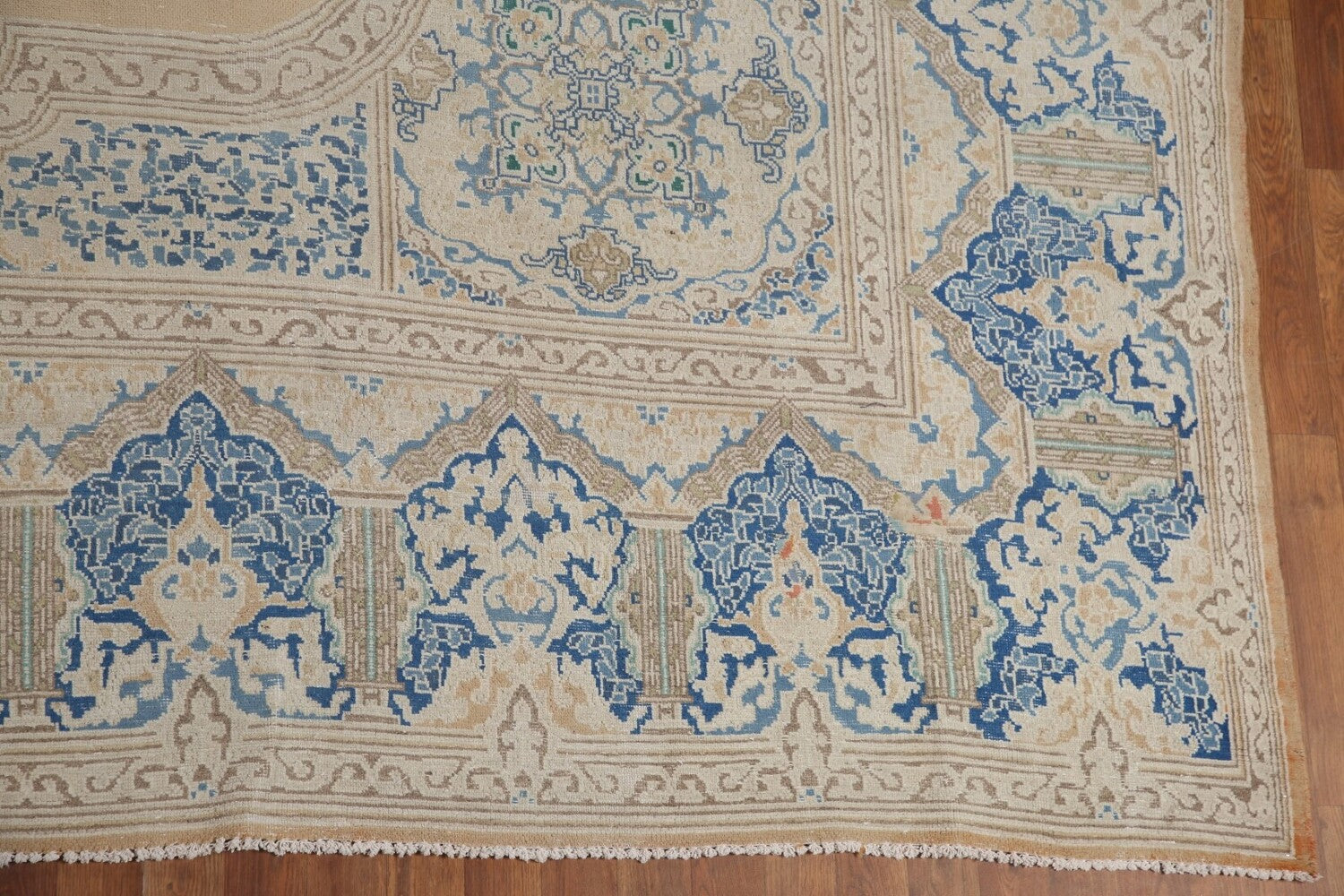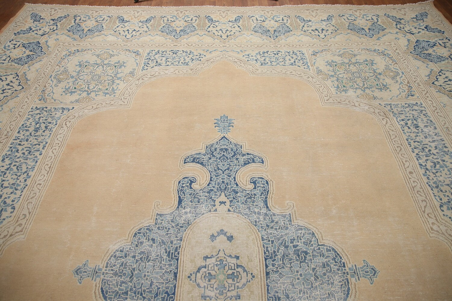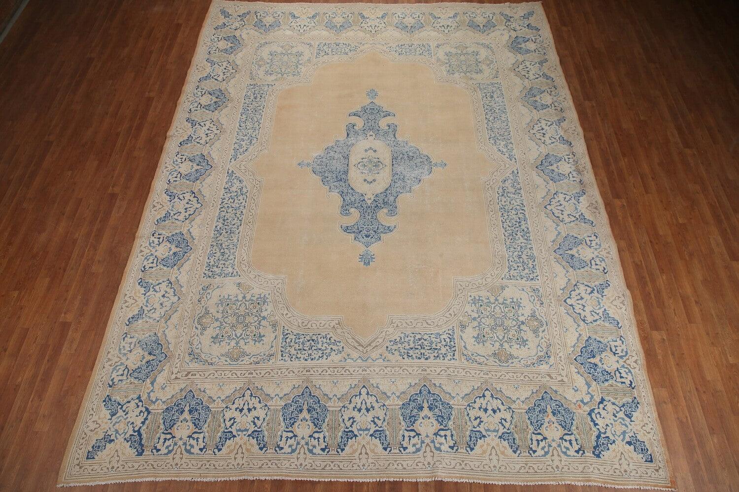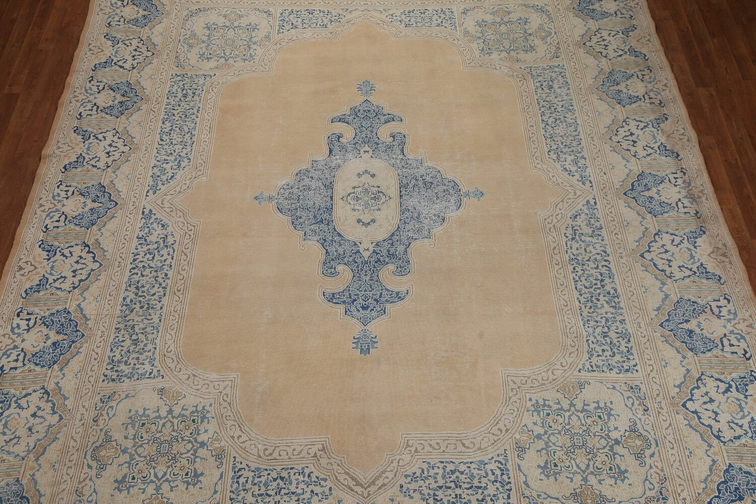 A Beautiful Genuine Persia ( Persia ) Kerman rug is Hand Knotted by skillful weavers in Persia ( Persia ) with 100% Wool Material. This rug is in Very Good (Evenly Low Pile-Repairs) condition. dimensions are 13' 7'' X 10' 5'' in foot and 414 X 318 in centimeter. the primary color is Peach.