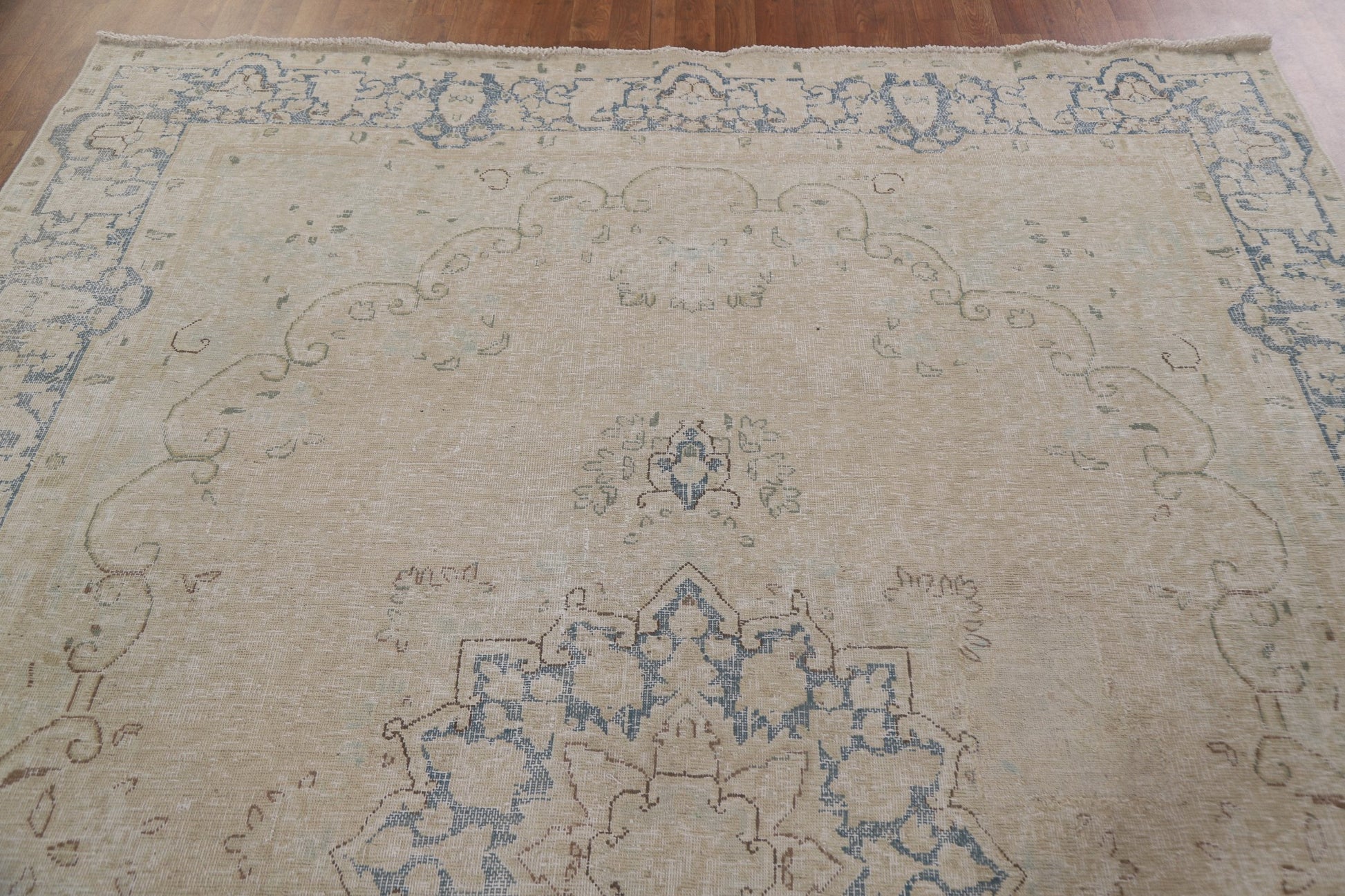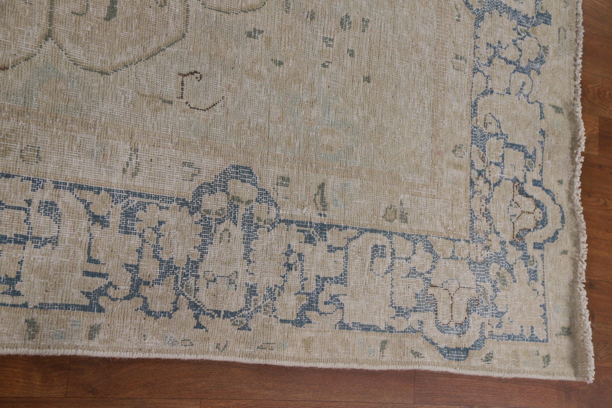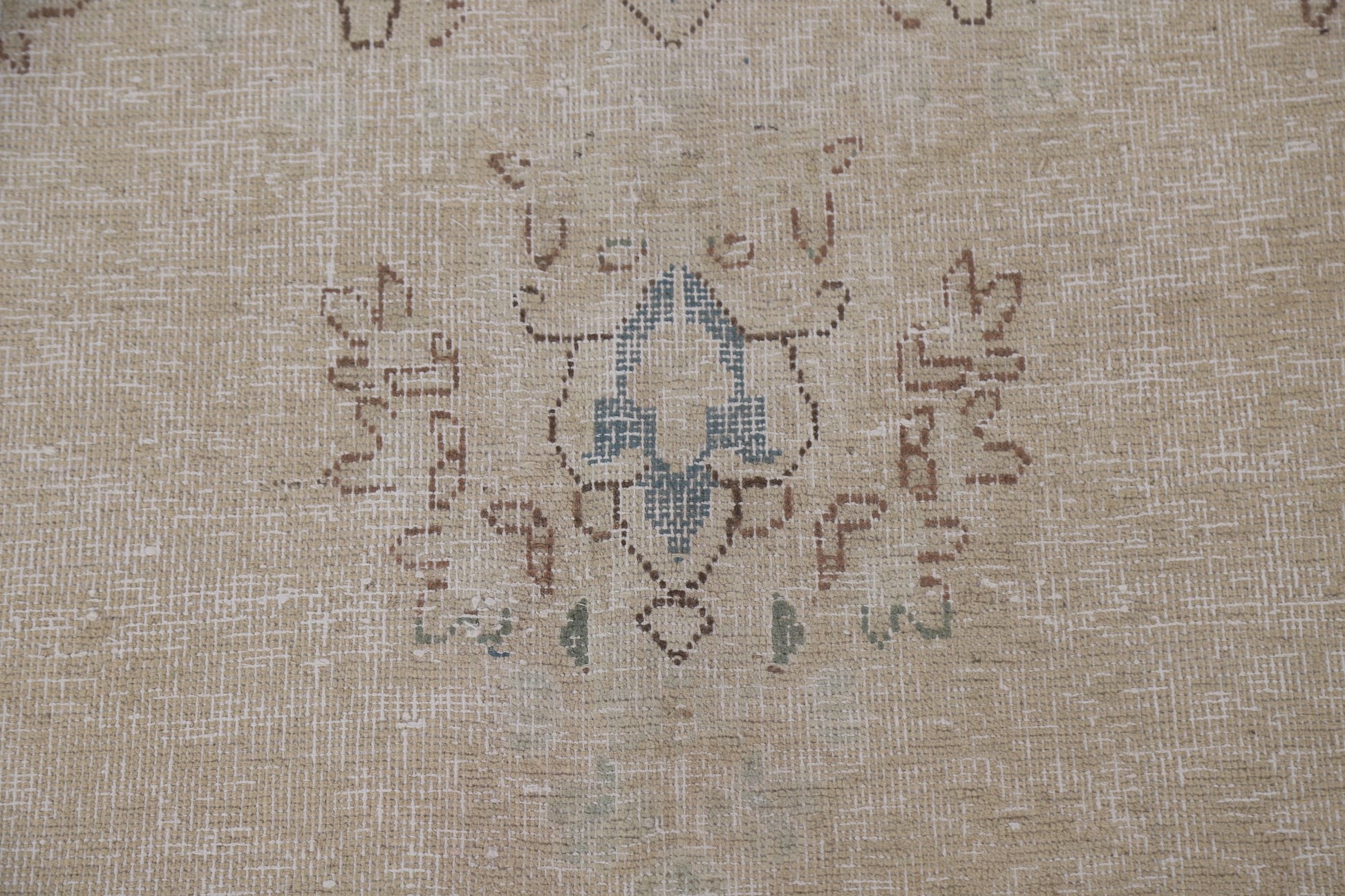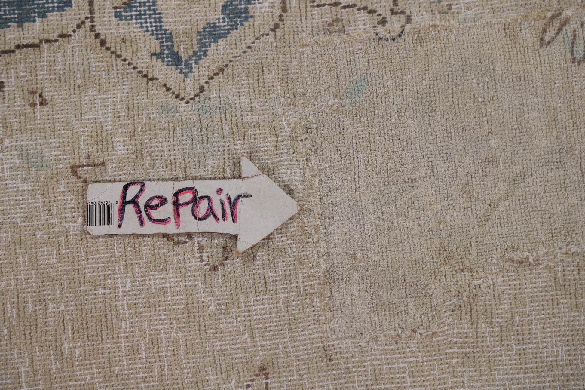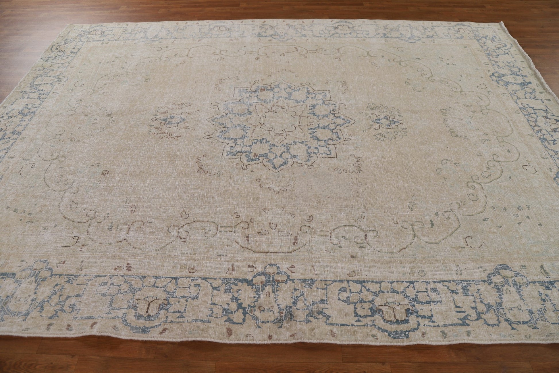 A Beautiful Genuine Persia ( Persia ) Kerman rug is Hand Knotted by skillful weavers in Persia ( Persia ) with 100% Wool Material. This rug is in Very Good (Evenly Low Pile-Repair) condition. dimensions are 10' 8'' X 7' 10'' in foot and 325 X 239 in centimeter. the primary color is Beige & Ivories.