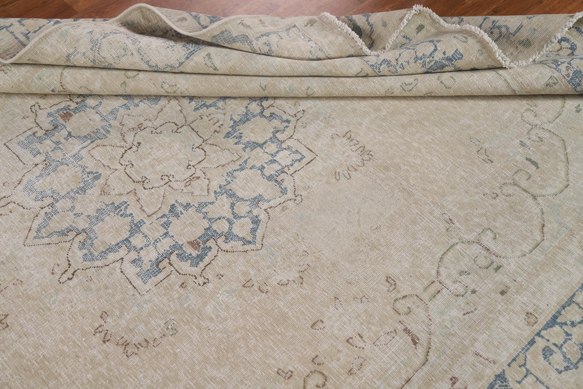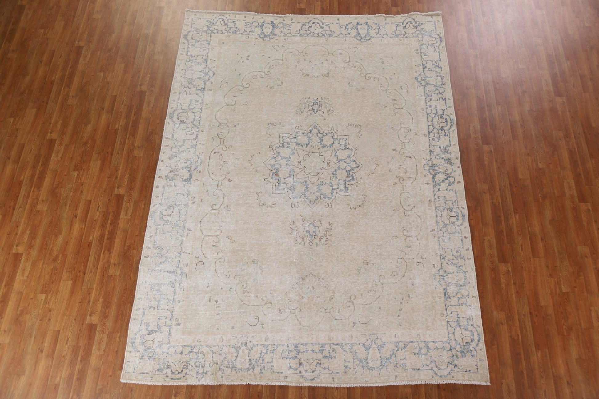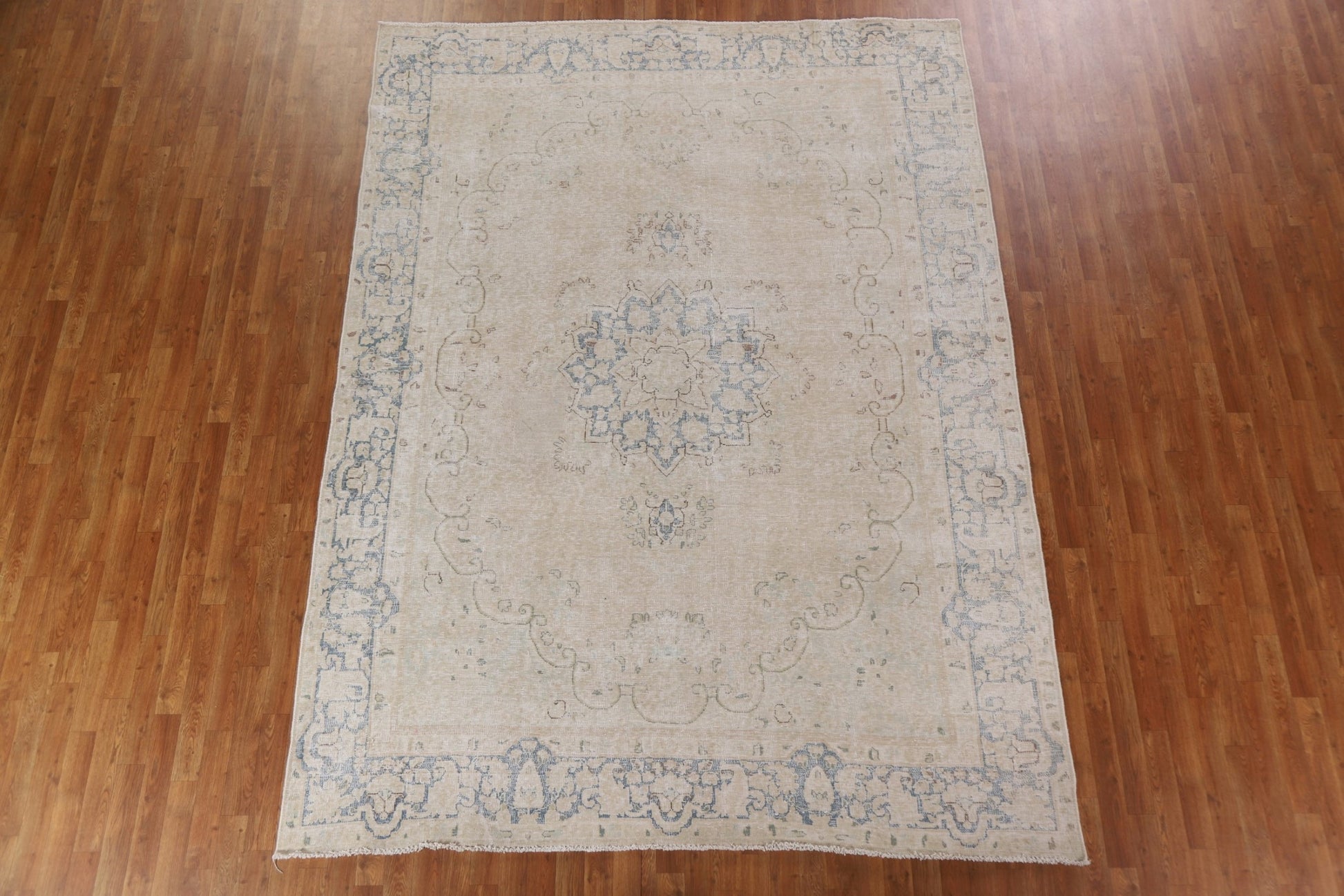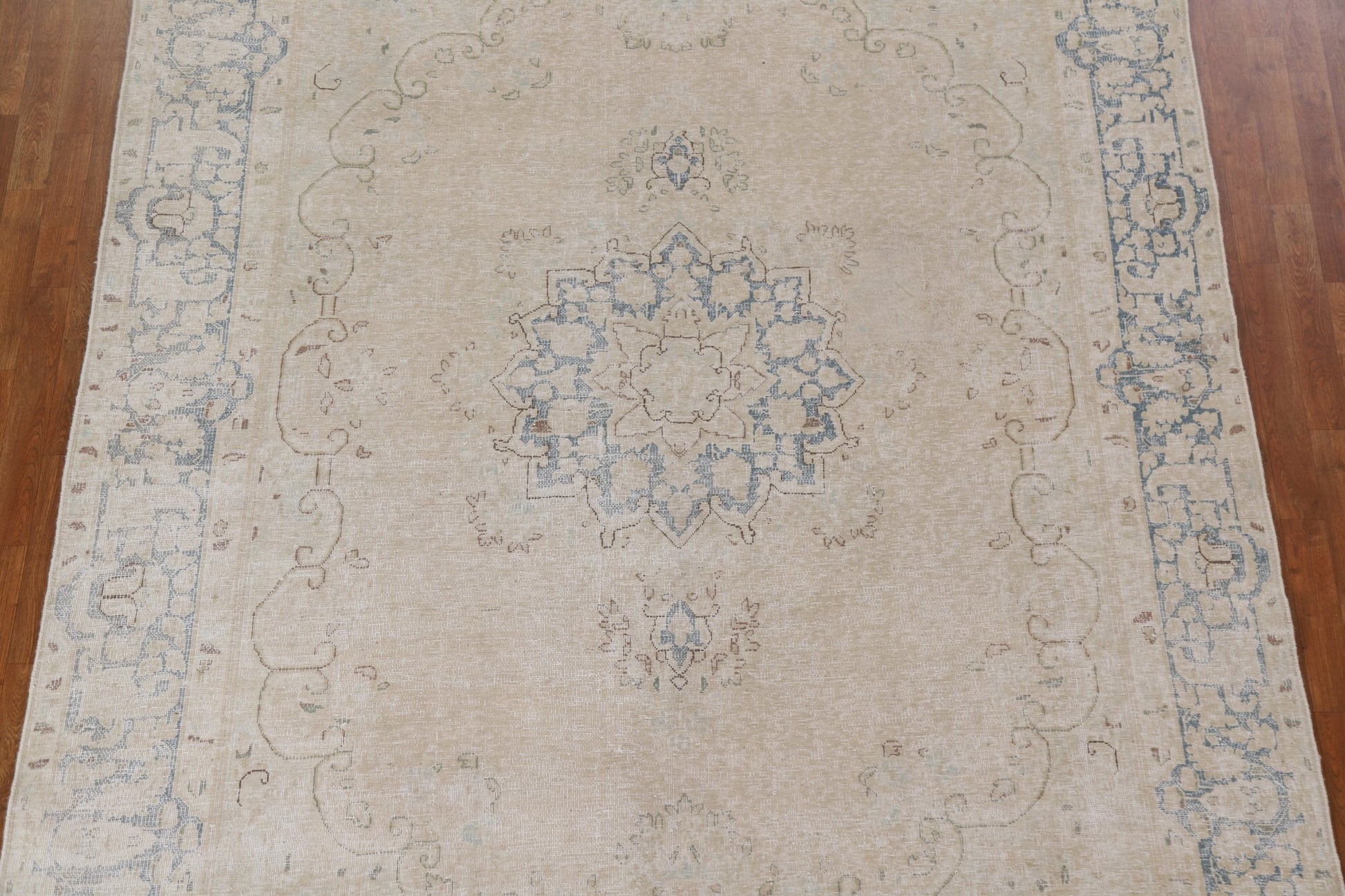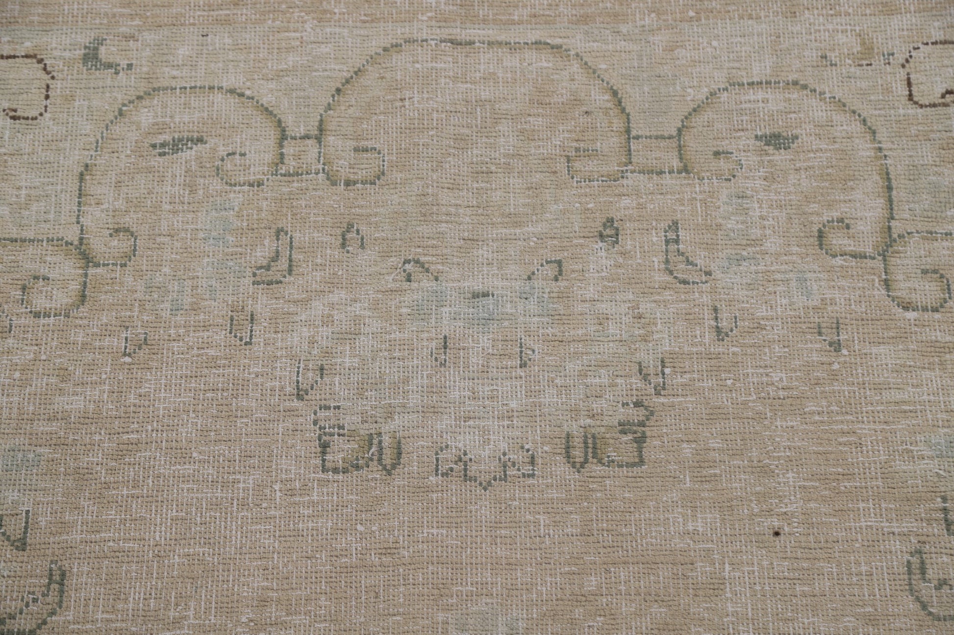 A Beautiful Genuine Persia ( Persia ) Kerman rug is Hand Knotted by skillful weavers in Persia ( Persia ) with 100% Wool Material. This rug is in Very Good (Evenly Low Pile-Repair) condition. dimensions are 10' 8'' X 7' 10'' in foot and 325 X 239 in centimeter. the primary color is Beige & Ivories.