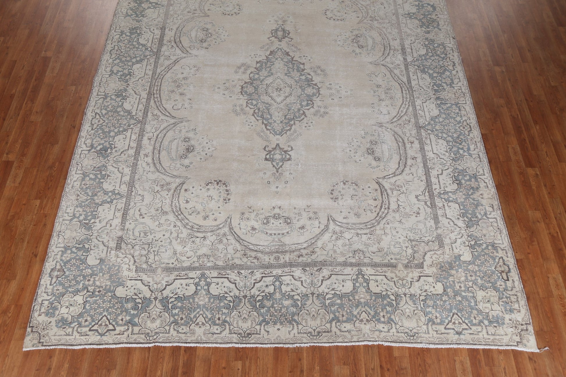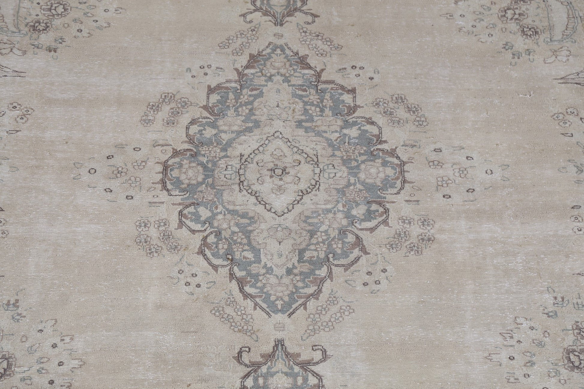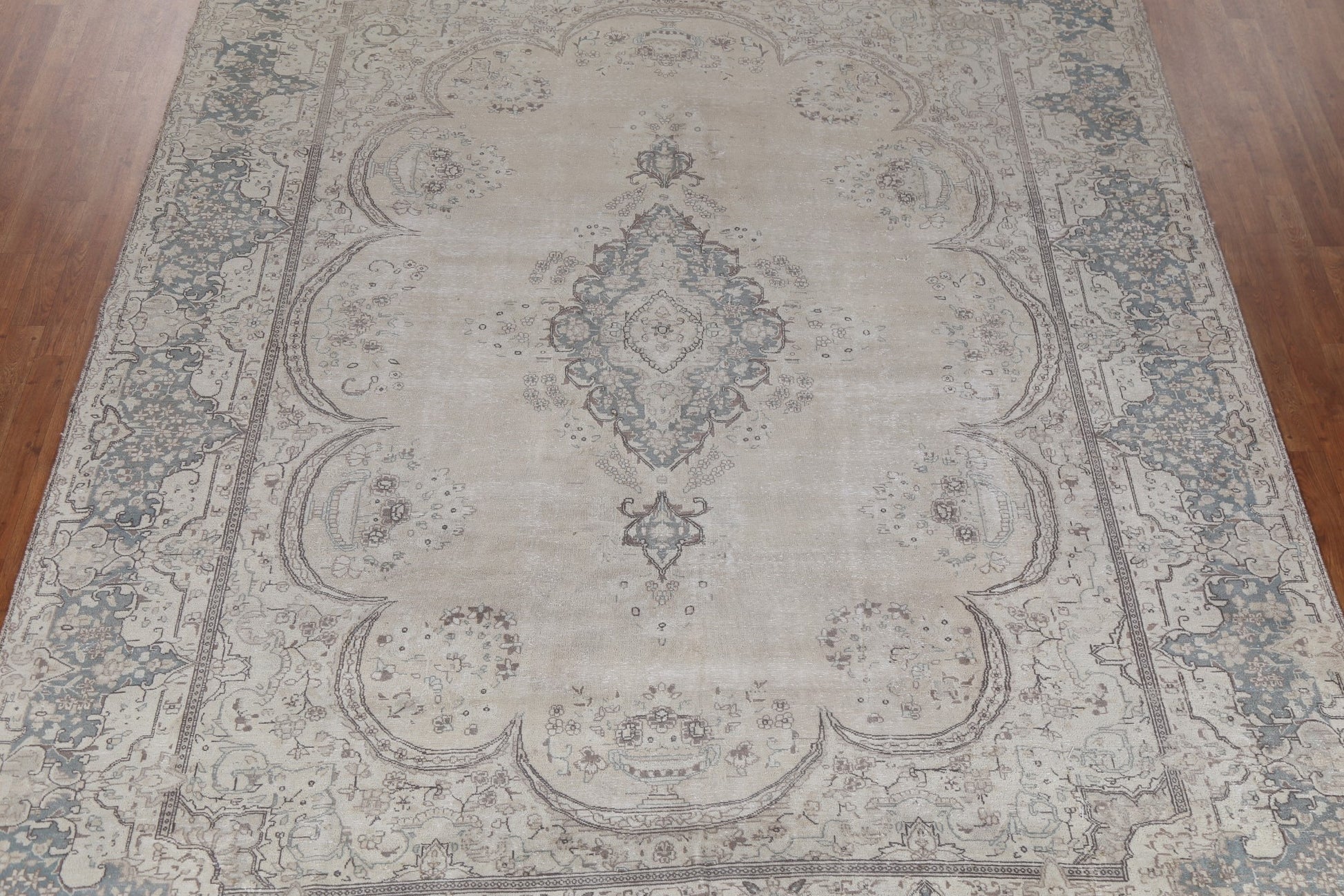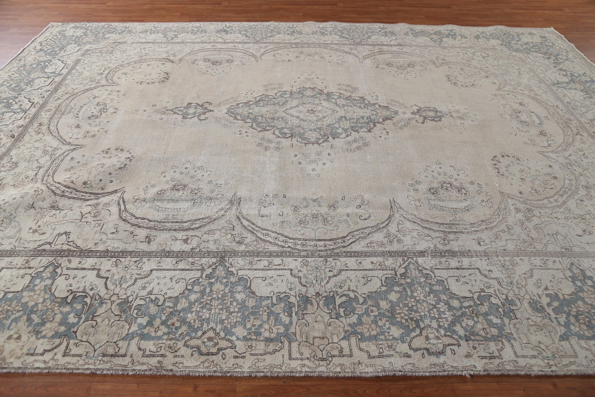 A Beautiful Genuine Persia ( Persia ) Kerman rug is Hand Knotted by skillful weavers in Persia ( Persia ) with 100% Wool Material. This rug is in Very Good (Evenly Low Pile-Repair) condition. dimensions are 12' 8'' X 9' 5'' in foot and 386 X 287 in centimeter. the primary color is Beige & Ivories.