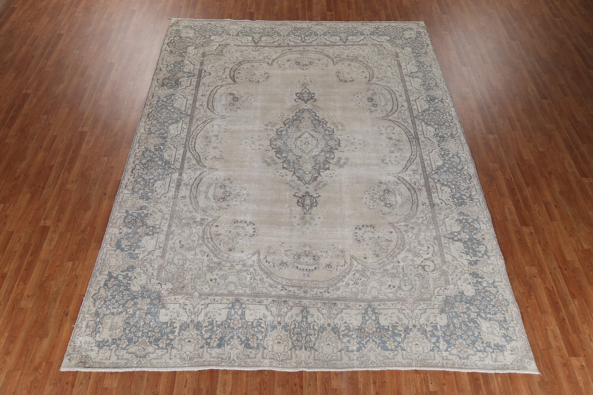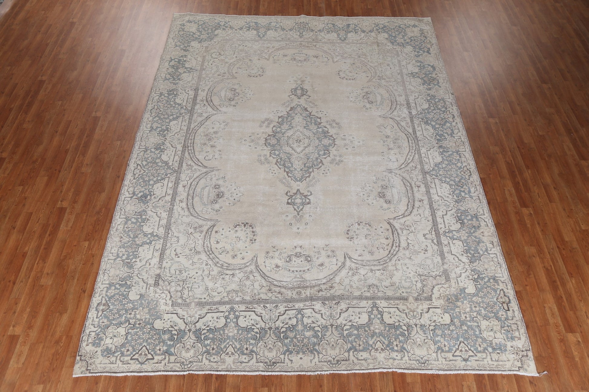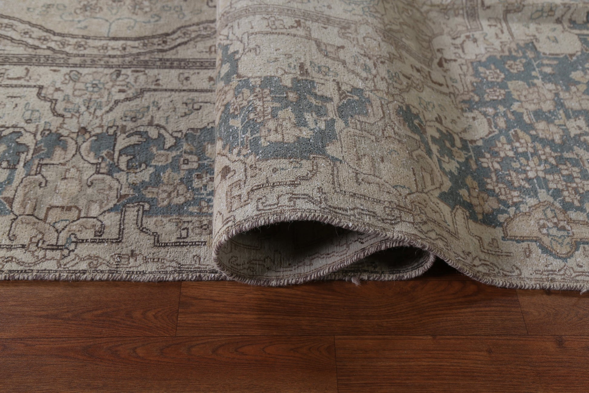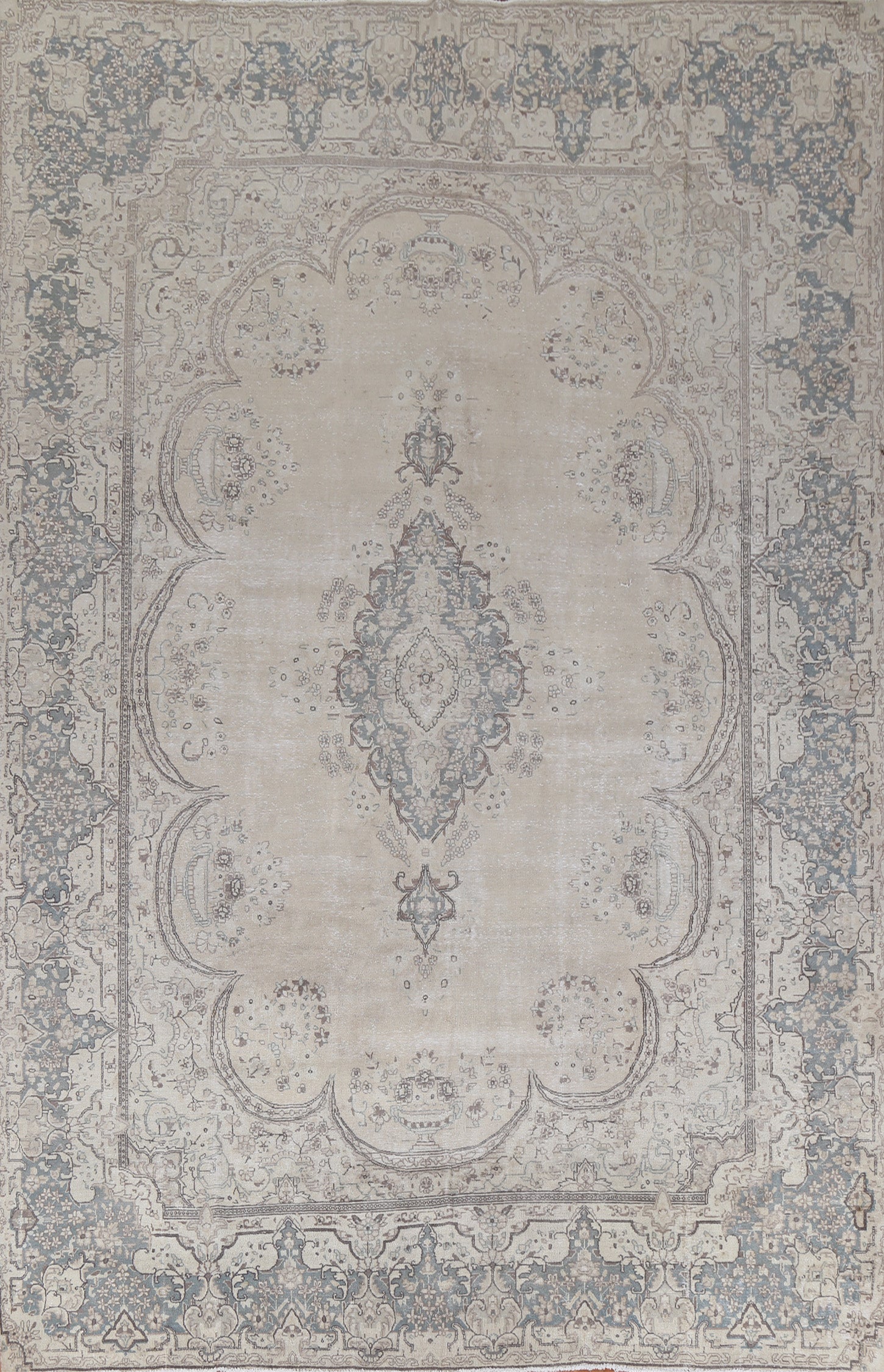 A Beautiful Genuine Persia ( Persia ) Kerman rug is Hand Knotted by skillful weavers in Persia ( Persia ) with 100% Wool Material. This rug is in Very Good (Evenly Low Pile-Repair) condition. dimensions are 12' 8'' X 9' 5'' in foot and 386 X 287 in centimeter. the primary color is Beige & Ivories.