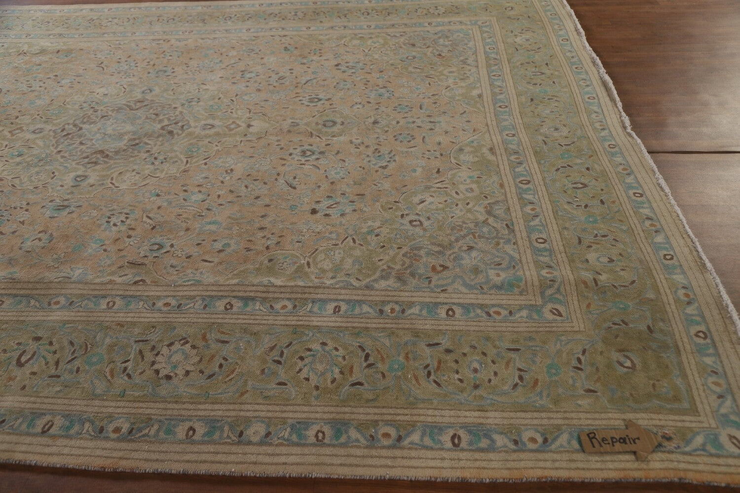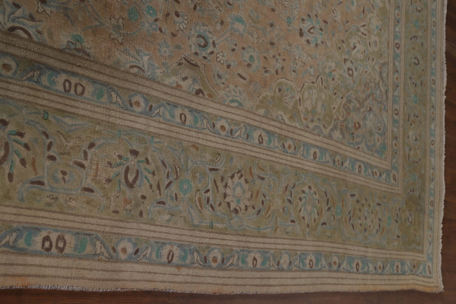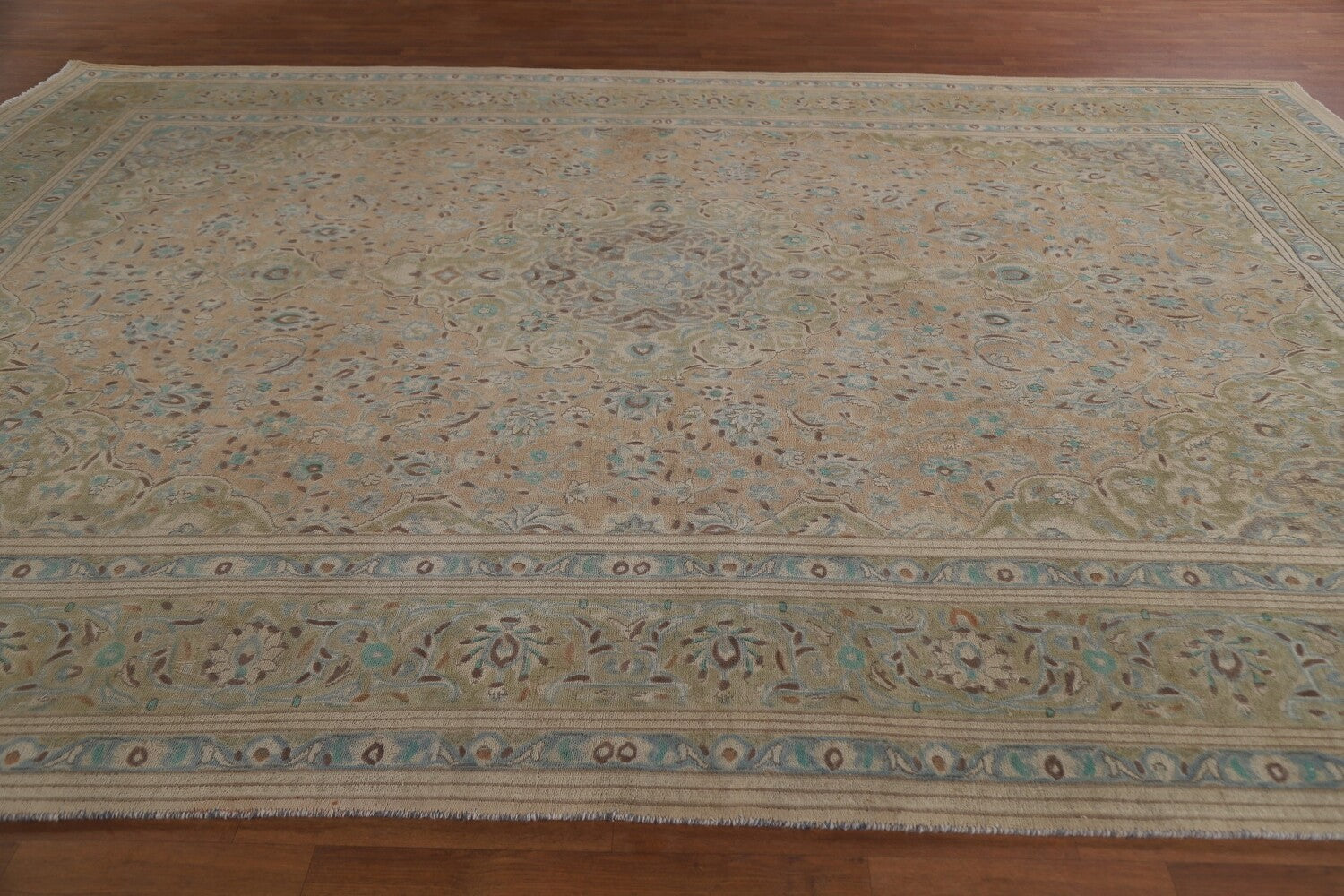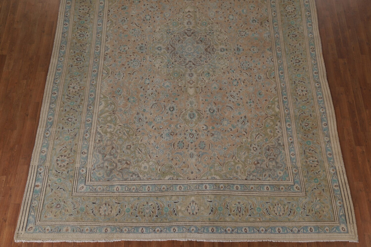 A Beautiful Genuine Persia ( Persia ) Mashad rug is Hand Knotted by skillful weavers in Persia ( Persia ) with 100% Wool Material. This rug is in Very Good (Evenly Low Pile-Repair) condition. dimensions are 12' 8'' X 9' 6'' in foot and 386 X 290 in centimeter. the primary color is Coral.