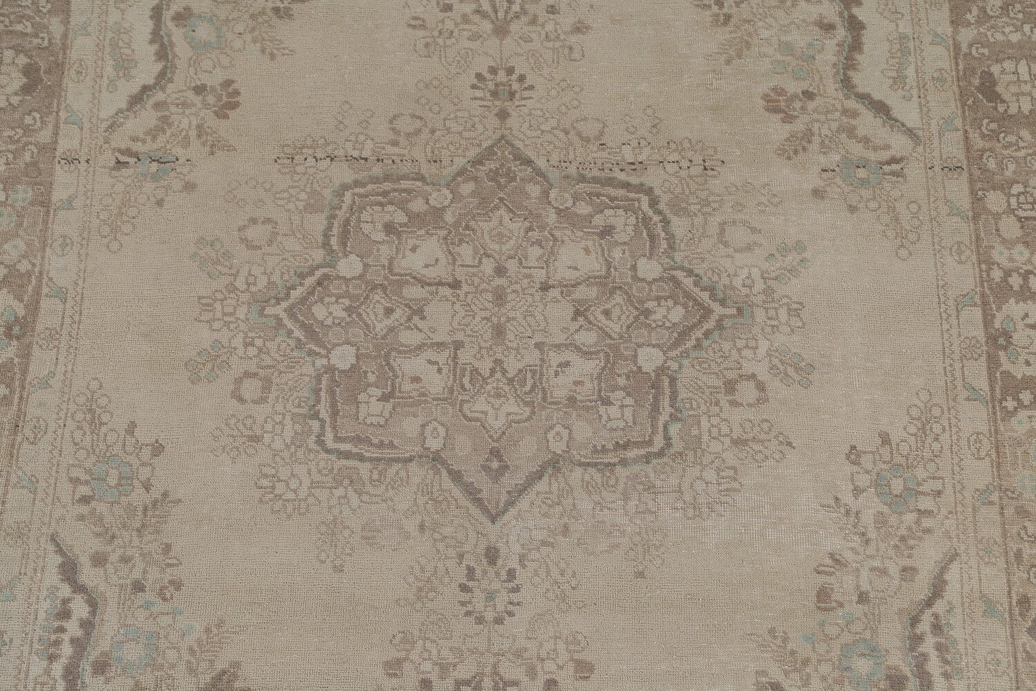 A Beautiful Genuine Persia ( Persia ) Tabriz rug is Hand Knotted by skillful weavers in Persia ( Persia ) with 100% Wool Material. This rug is in Very Good (Evenly Low Pile) condition. dimensions are 9' 9'' X 6' 3'' in foot and 297 X 191 in centimeter. the primary color is Beige & Ivories.