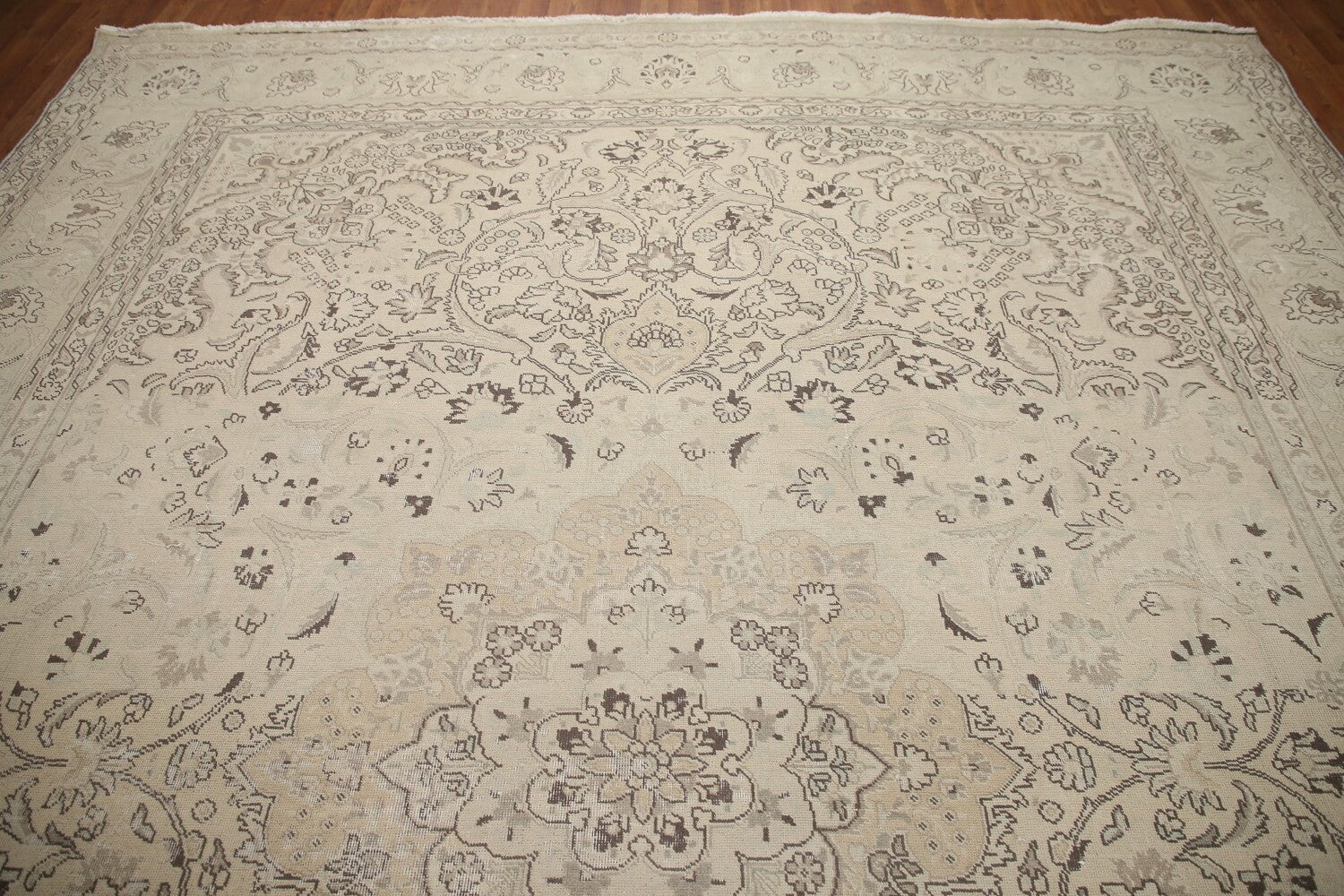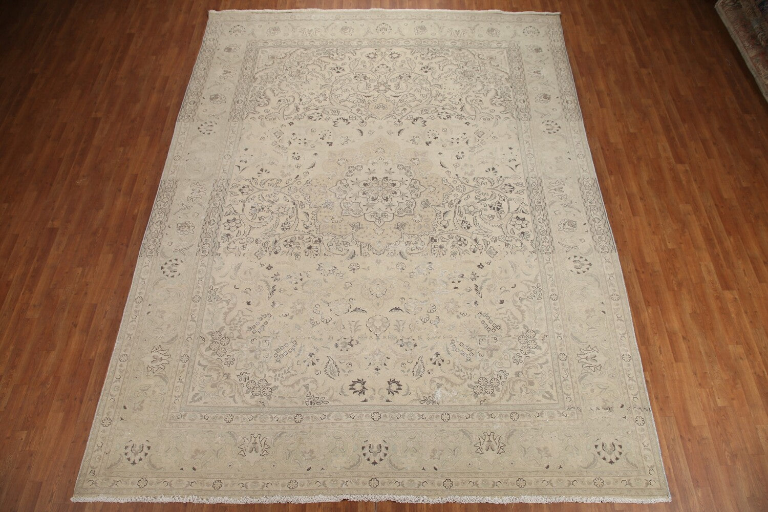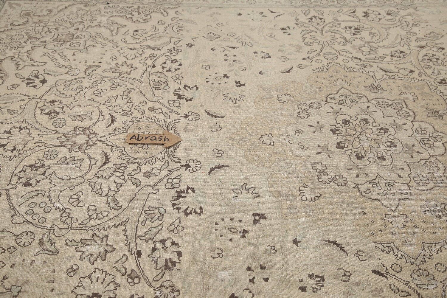 A Beautiful Genuine Persia ( Persia ) Tabriz rug is Hand Knotted by skillful weavers in Persia ( Persia ) with 100% Wool Material. This rug is in Very Good (Evenly Low Pile-Abrash) condition. dimensions are 12' 8'' X 9' 9'' in foot and 386 X 297 in centimeter. the primary color is Beige & Ivories.