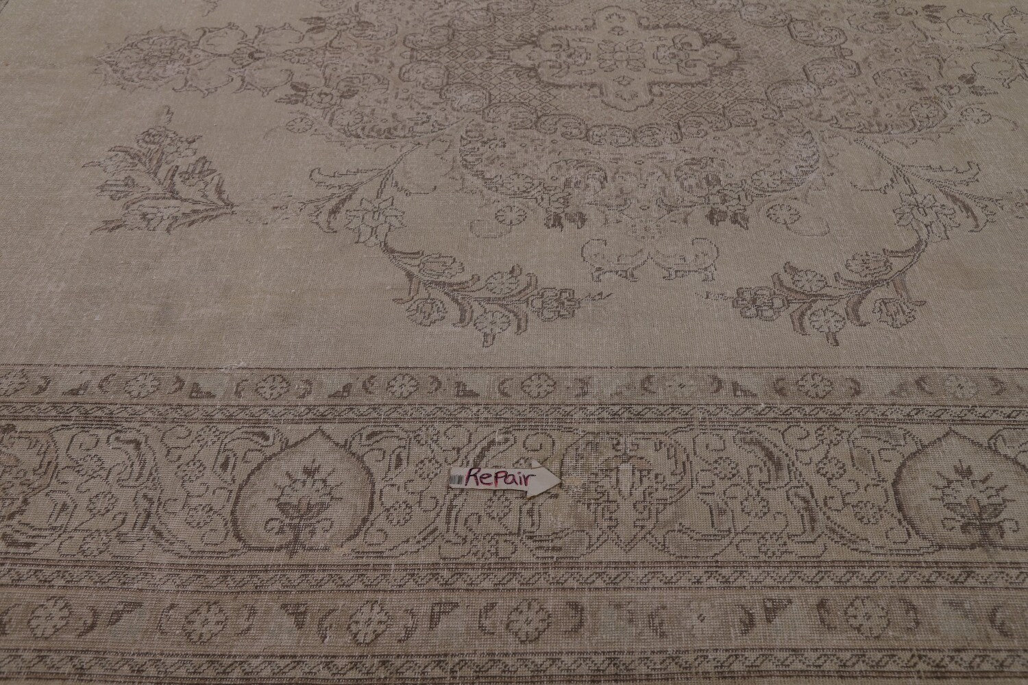 A Beautiful Genuine Persia ( Persia ) Tabriz rug is Hand Knotted by skillful weavers in Persia ( Persia ) with 100% Wool Material. This rug is in Very Good (Evenly Low Pile-Repair) condition. dimensions are 12' 8'' X 10' 0'' in foot and 386 X 305 in centimeter. the primary color is Beige & Ivories.