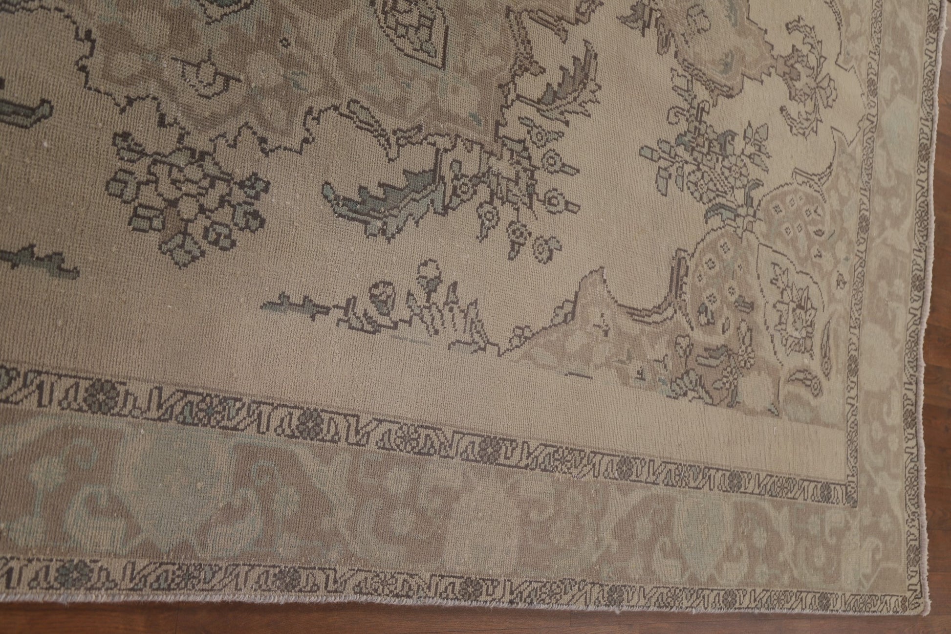 A Beautiful Genuine Persia ( Persia ) Tabriz rug is Hand Knotted by skillful weavers in Persia ( Persia ) with 100% Wool Material. This rug is in Very Good(Evenly Low Pile-Small Repair) condition. dimensions are 10' 1'' X 6' 3'' in foot and 307 X 191 in centimeter. the primary color is Beige & Ivories.