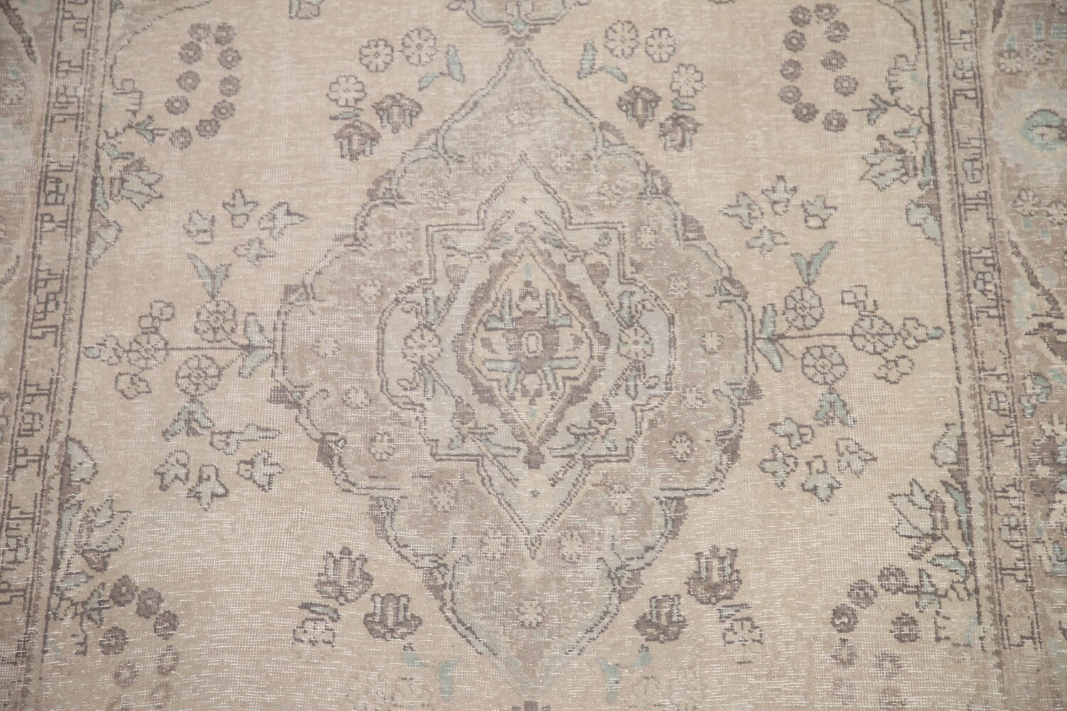 A Beautiful Genuine Persia ( Persia ) Tabriz rug is Hand Knotted by skillful weavers in Persia ( Persia ) with 100% Wool Material. This rug is in Very Good (Evenly Low Pile-Uneven) condition. dimensions are 9' 11'' X 6' 2'' in foot and 302 X 188 in centimeter. the primary color is Beige & Ivories.