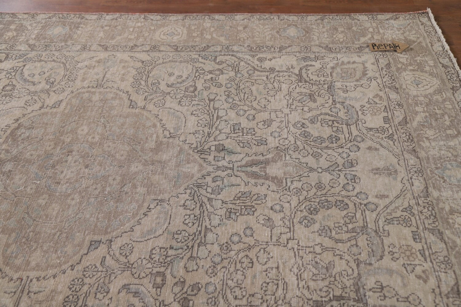 A Beautiful Genuine Persia ( Persia ) Tabriz rug is Hand Knotted by skillful weavers in Persia ( Persia ) with 100% Wool Material. This rug is in Very Good (Evenly Low Pile-Repair) condition. dimensions are 9' 3'' X 6' 4'' in foot and 282 X 193 in centimeter. the primary color is Beige & Ivories.