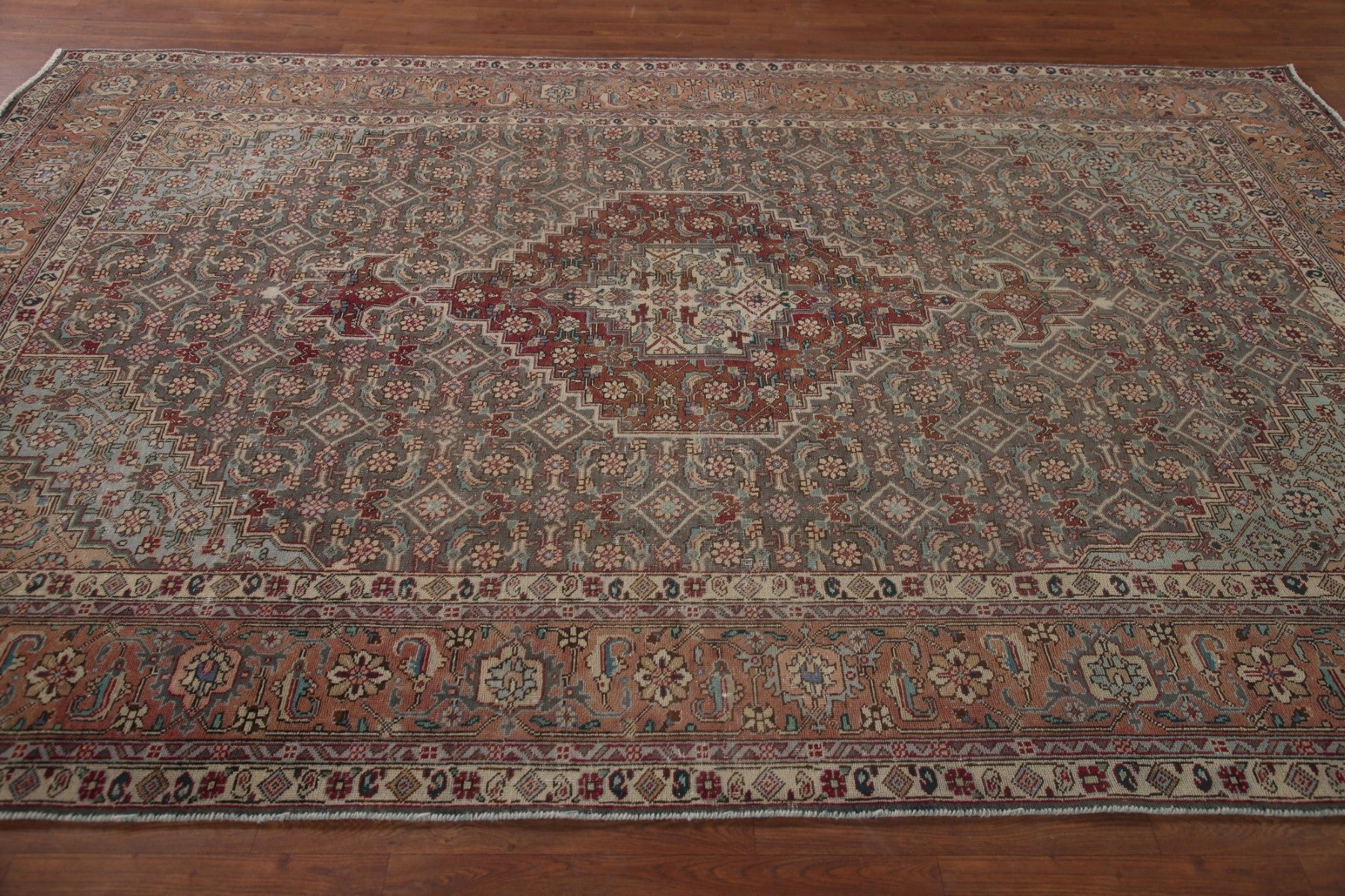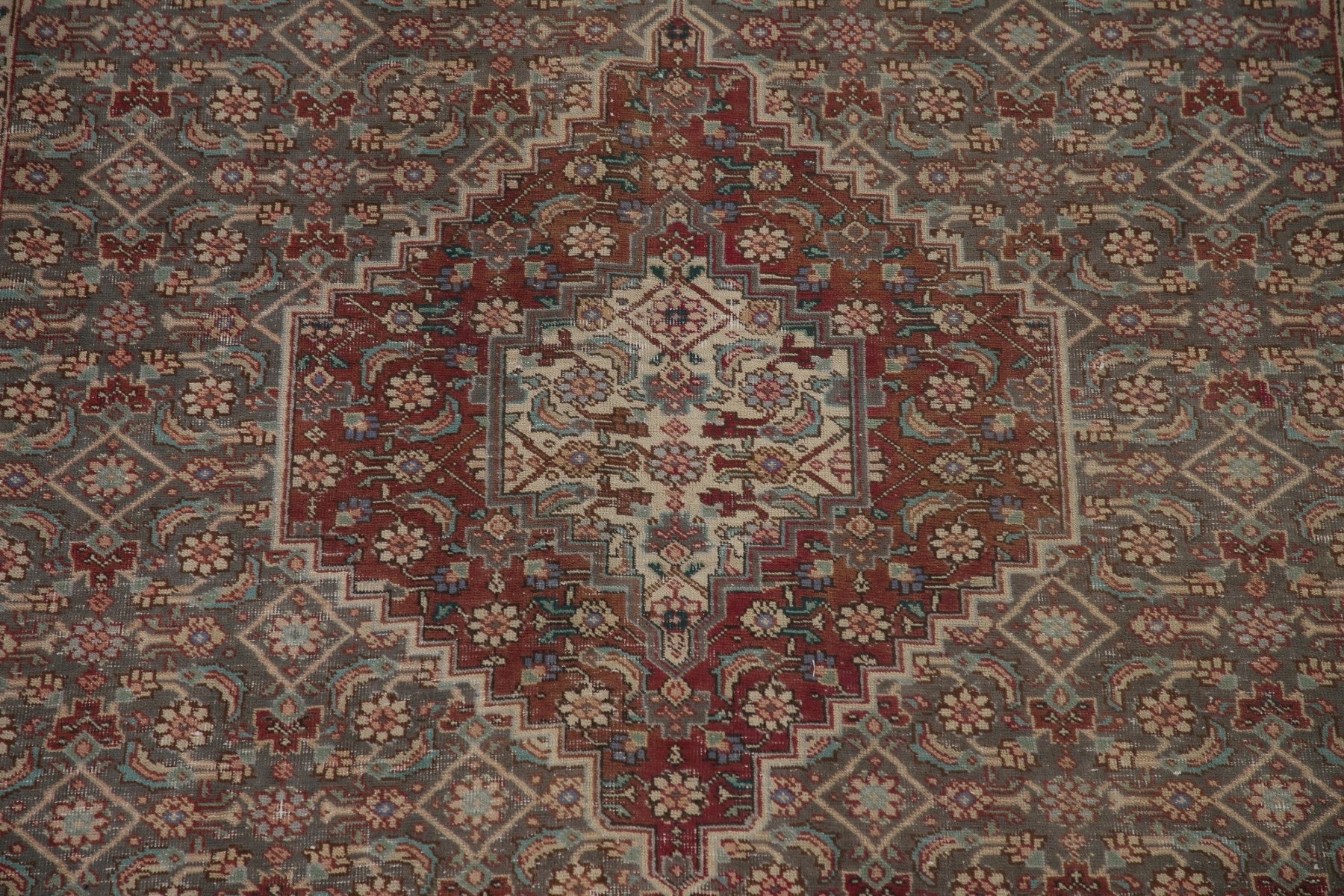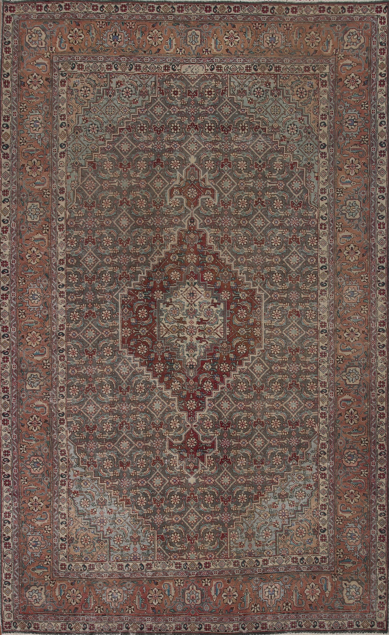 A Beautiful Genuine Persia ( Persia ) Tabriz rug is Hand Knotted by skillful weavers in Persia ( Persia ) with 100% Wool Material. This rug is in Very Good (Evenly Low Pile) condition. dimensions are 9' 7'' X 6' 6'' in foot and 292 X 198 in centimeter. the primary color is Greys & Charcoal.
