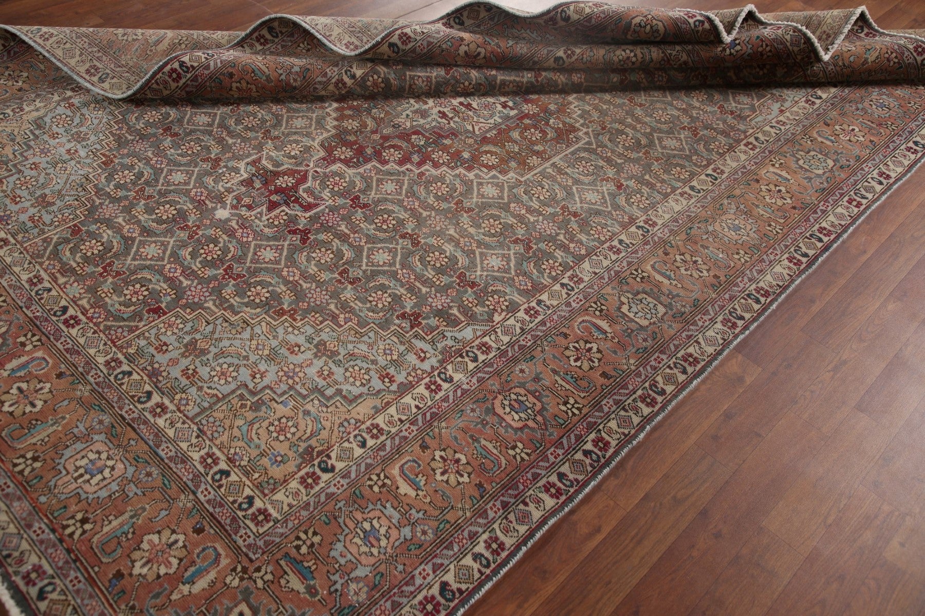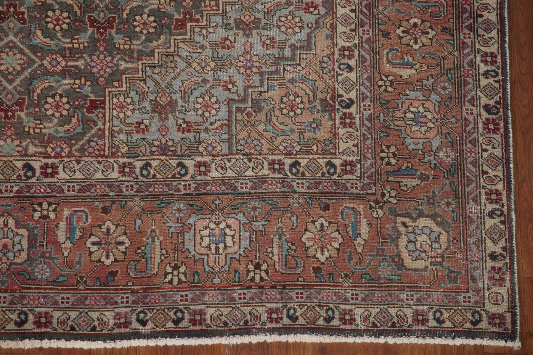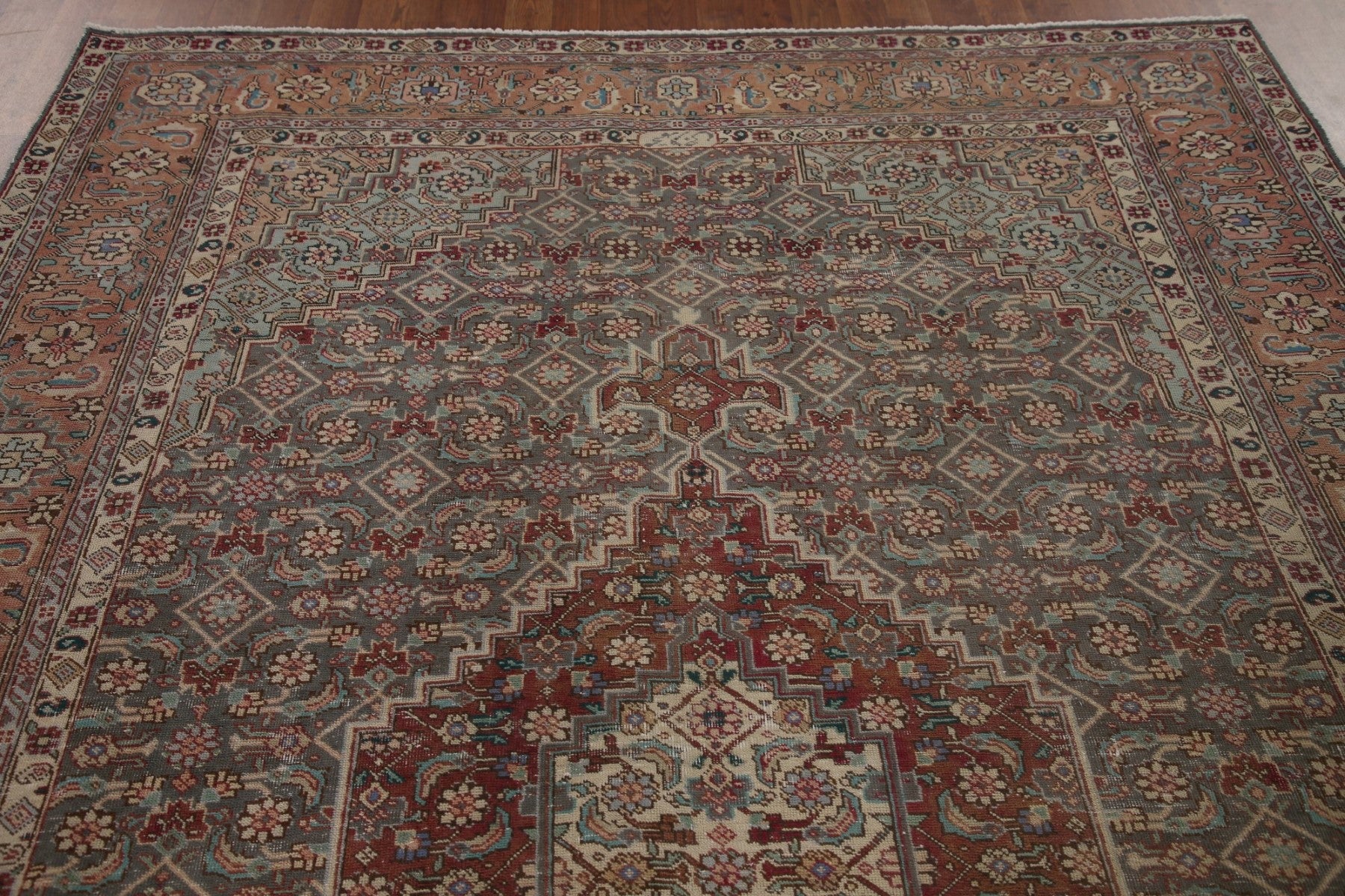 A Beautiful Genuine Persia ( Persia ) Tabriz rug is Hand Knotted by skillful weavers in Persia ( Persia ) with 100% Wool Material. This rug is in Very Good (Evenly Low Pile) condition. dimensions are 9' 7'' X 6' 6'' in foot and 292 X 198 in centimeter. the primary color is Greys & Charcoal.