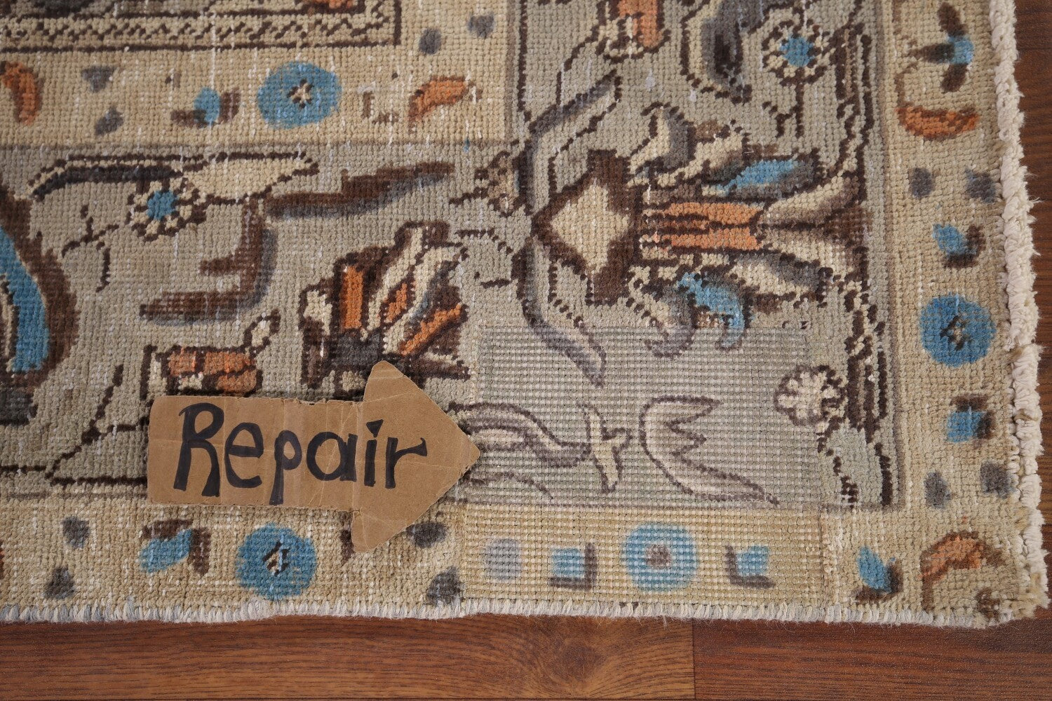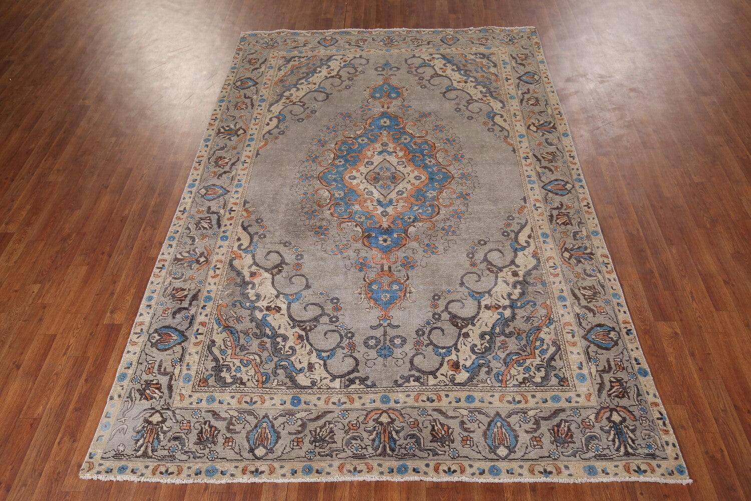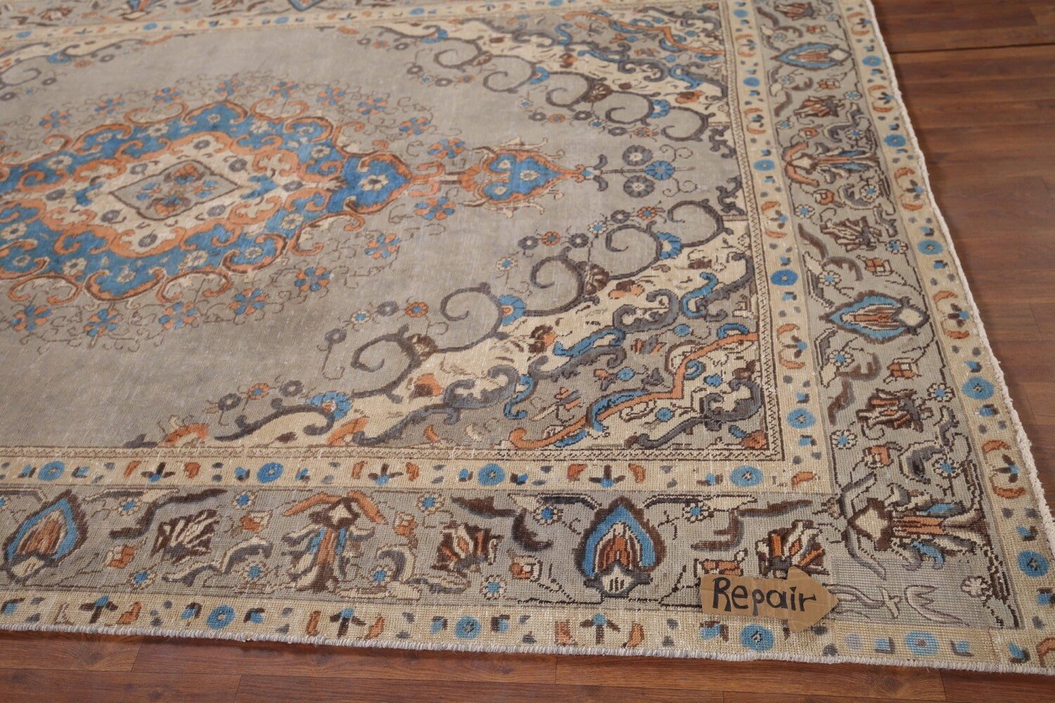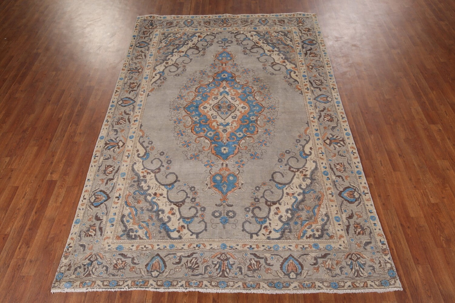 A Beautiful Genuine Persia ( Persia ) Tabriz rug is Hand Knotted by skillful weavers in Persia ( Persia ) with 100% Wool Material. This rug is in Very Good ( Evenly Low Pile-Repair) condition. dimensions are 9' 7'' X 6' 6'' in foot and 292 X 198 in centimeter. the primary color is Greys & Charcoal.
