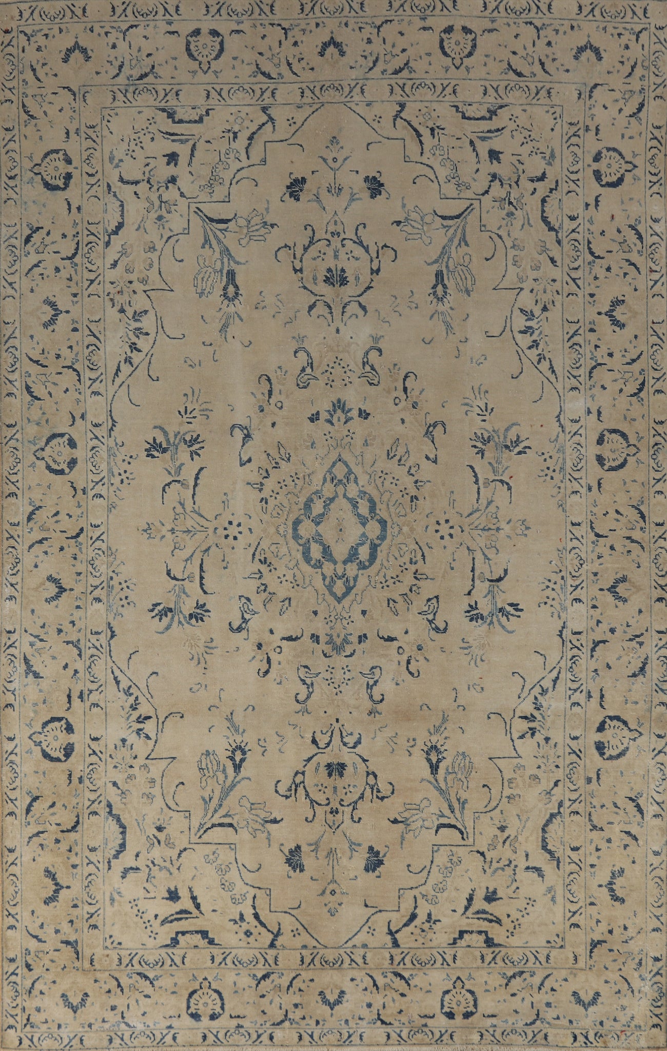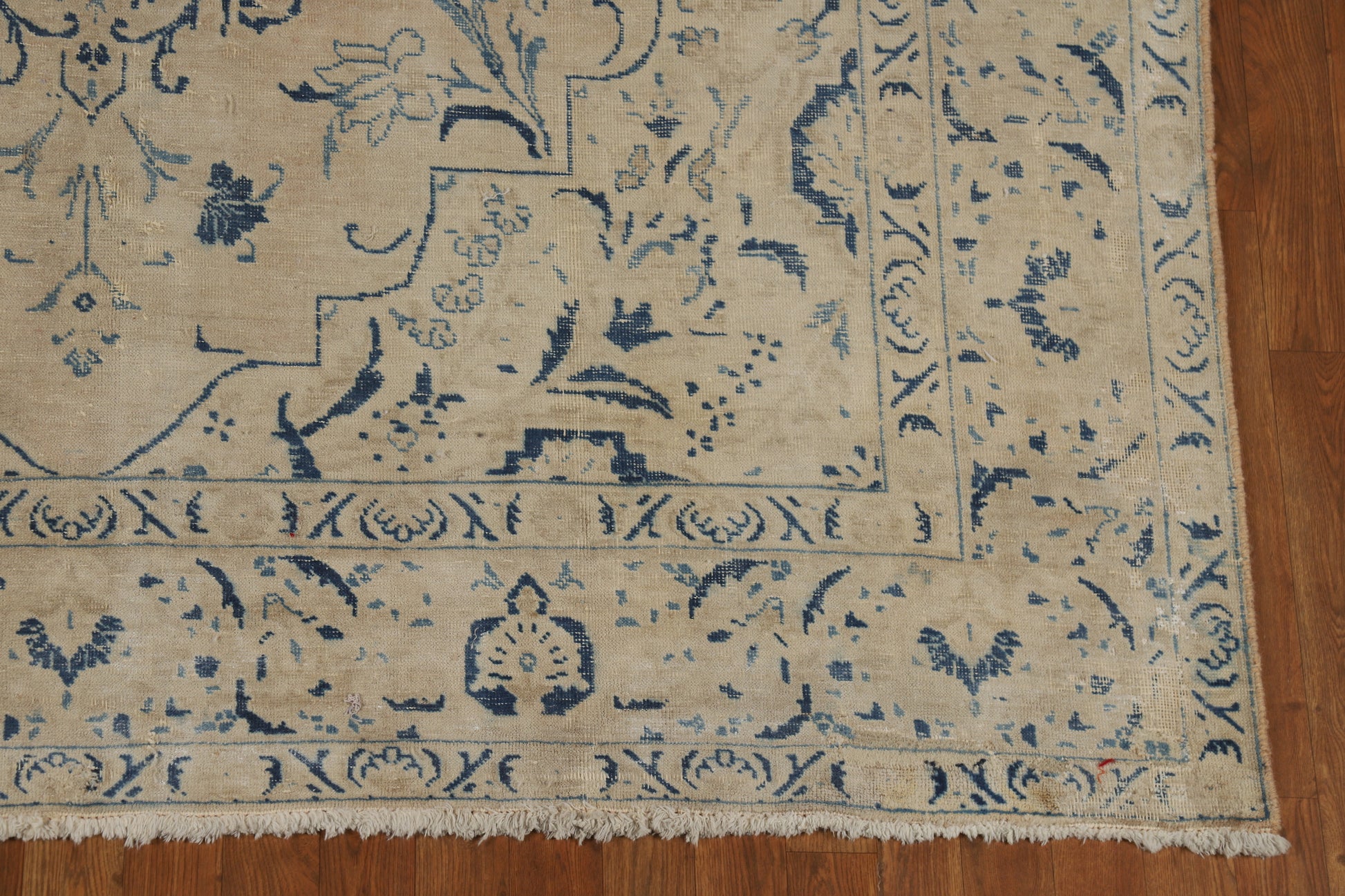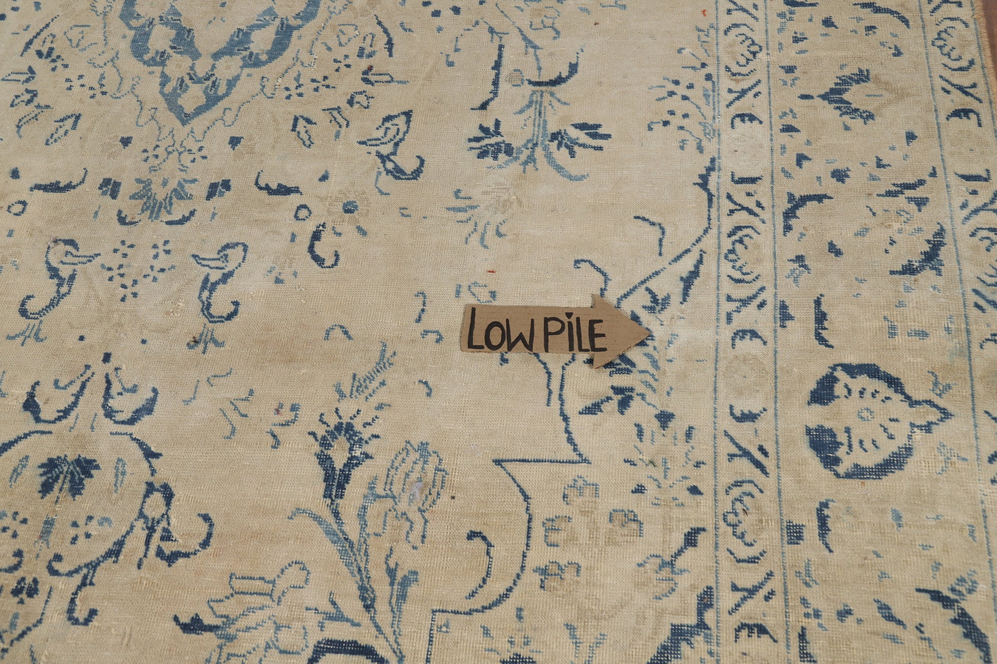 A Beautiful Genuine Persia ( Persia ) Tabriz rug is Hand Knotted by skillful weavers in Persia ( Persia ) with 100% Wool Material. This rug is in Good (Low Pile-Repair-Worn) condition. dimensions are 11' 2'' X 7' 3'' in foot and 340 X 221 in centimeter. the primary color is Beige & Ivories.