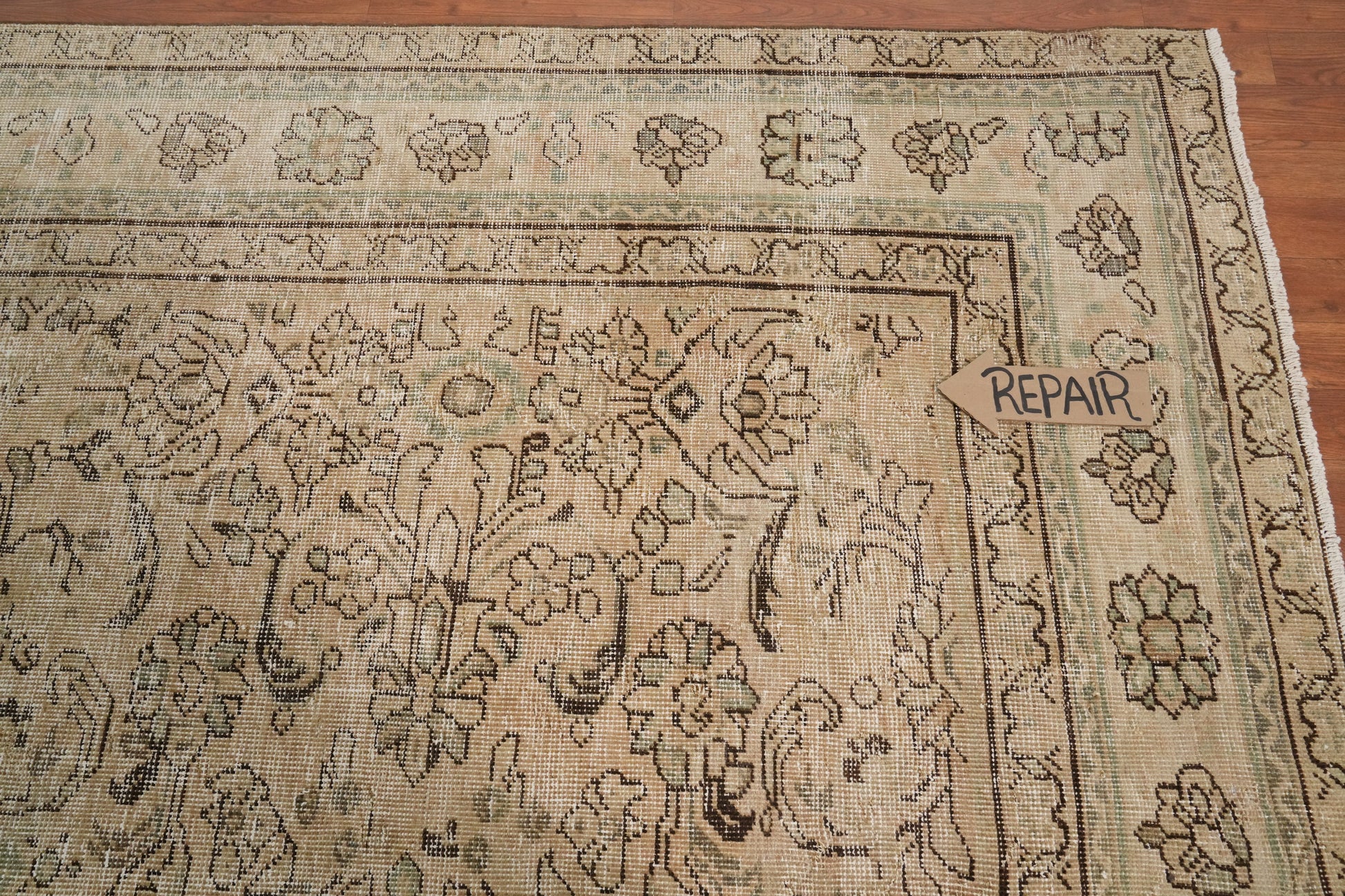 A Beautiful Genuine Persia ( Persia ) Tabriz rug is Hand Knotted by skillful weavers in Persia ( Persia ) with 100% Wool Material. This rug is in Very Good (Low Pile-Repair) condition. dimensions are 10' 9'' X 7' 0'' in foot and 328 X 213 in centimeter. the primary color is Beige & Ivories.