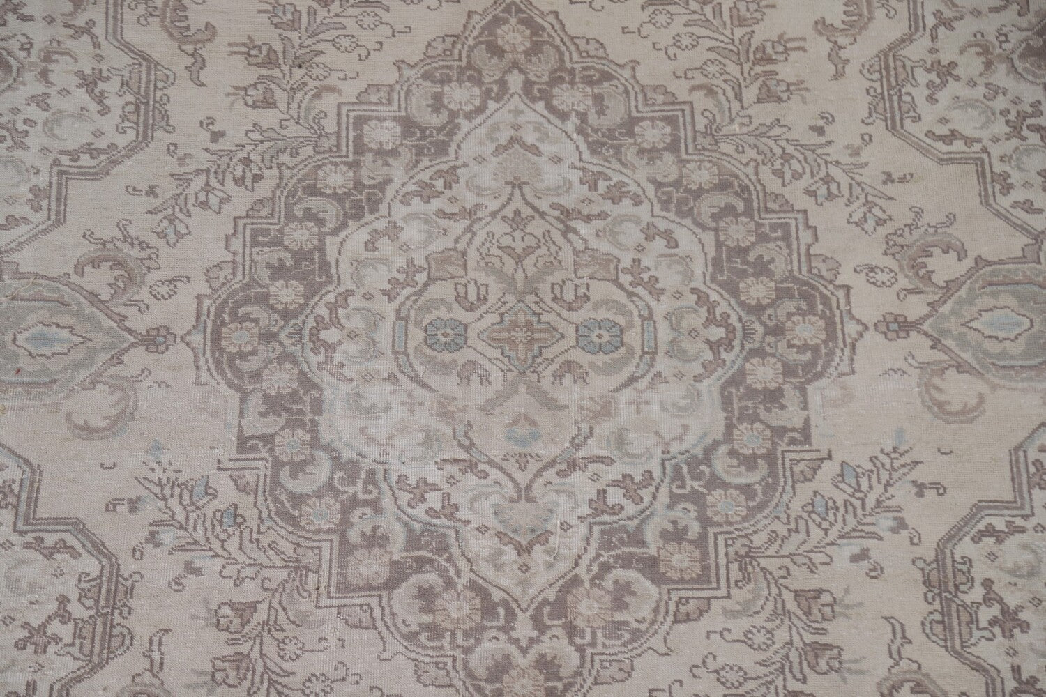 A Beautiful Genuine Persia ( Persia ) Tabriz rug is Hand Knotted by skillful weavers in Persia ( Persia ) with 100% Wool Material. This rug is in Very Good (Evenly Low Pile-Abrash) condition. dimensions are 10' 9'' X 7' 8'' in foot and 328 X 234 in centimeter. the primary color is Beige & Ivories.