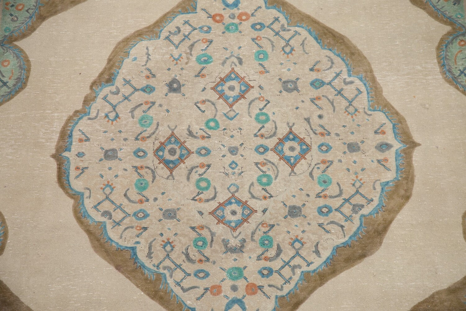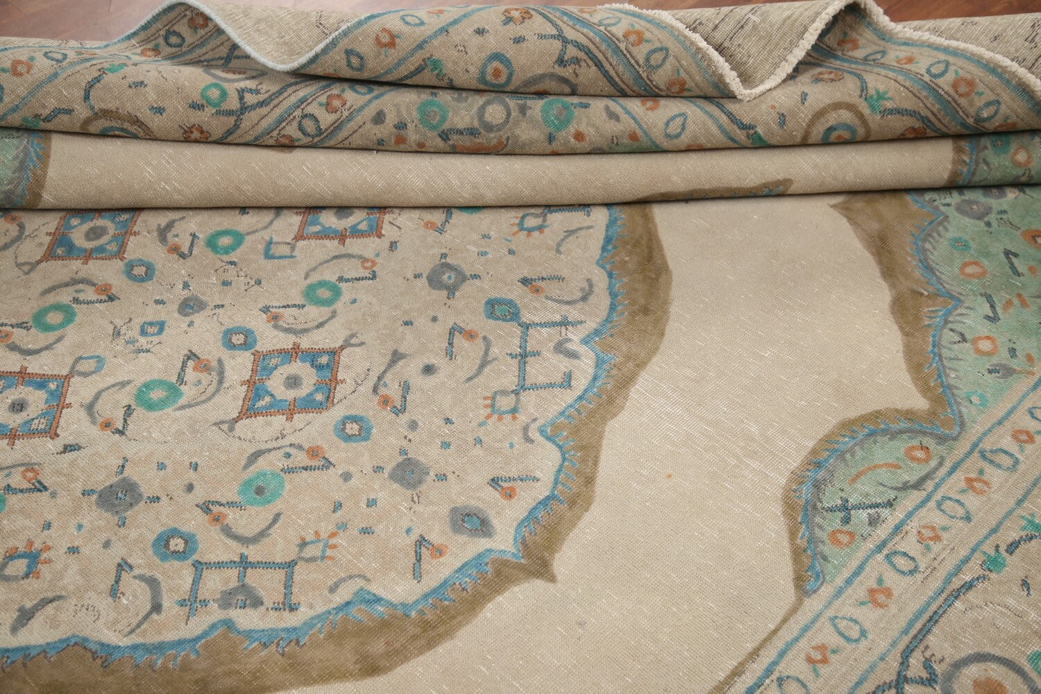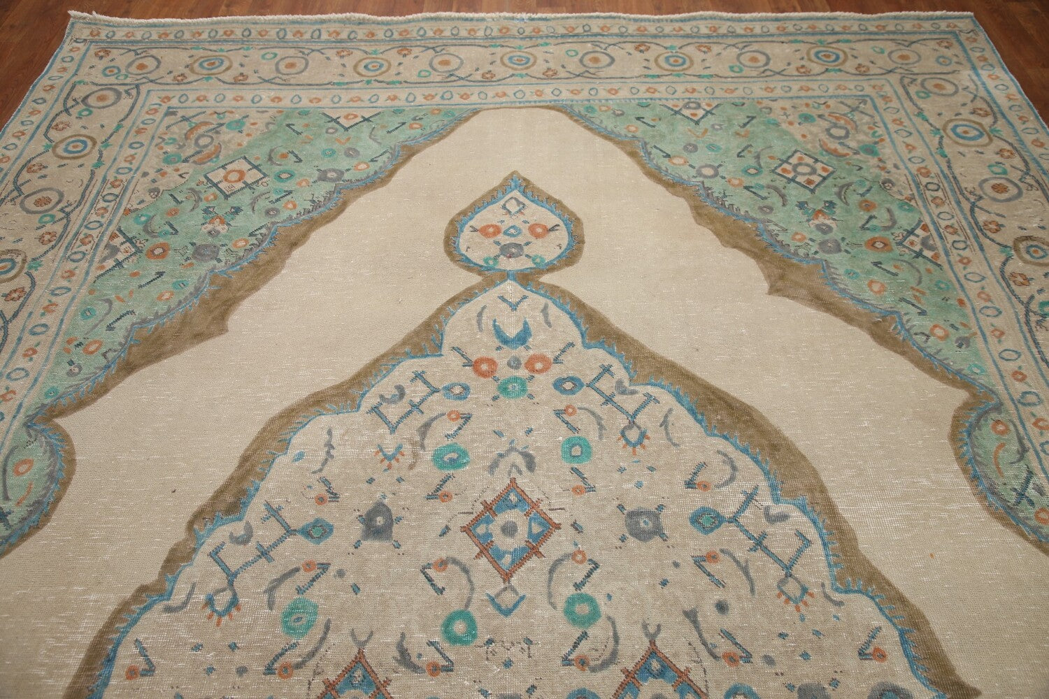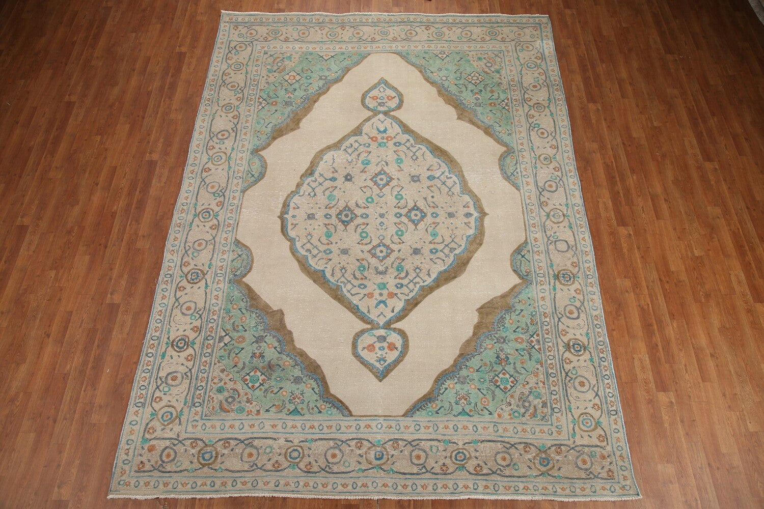 A Beautiful Genuine Persia ( Persia ) Tabriz rug is Hand Knotted by skillful weavers in Persia ( Persia ) with 100% Wool Material. This rug is in Very Good (Evenly Low Pile) condition. dimensions are 11' 2'' X 8' 3'' in foot and 340 X 251 in centimeter. the primary color is Beige & Ivories.