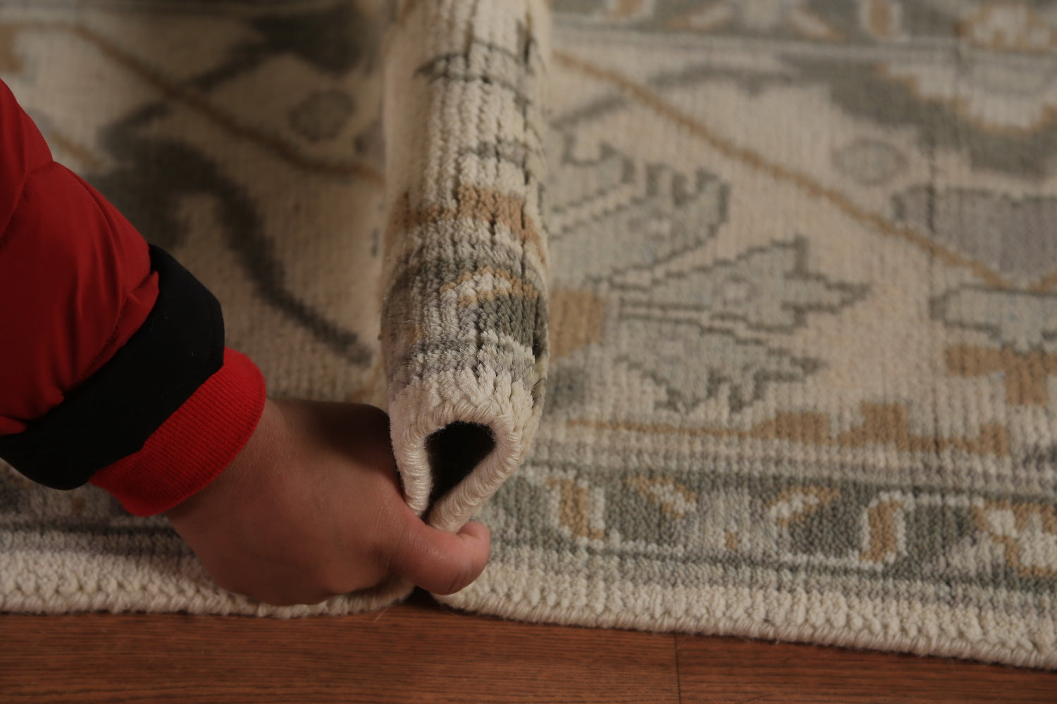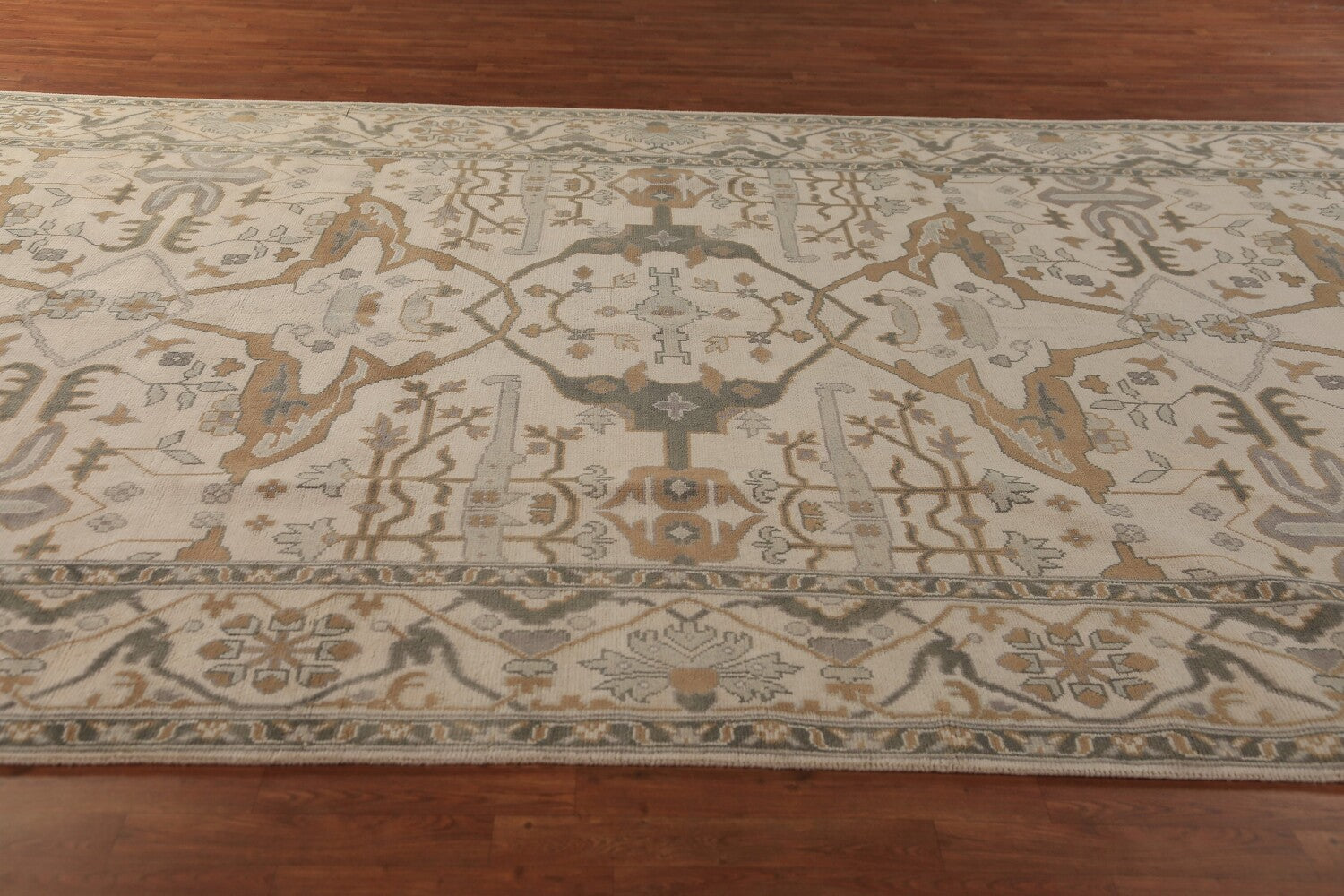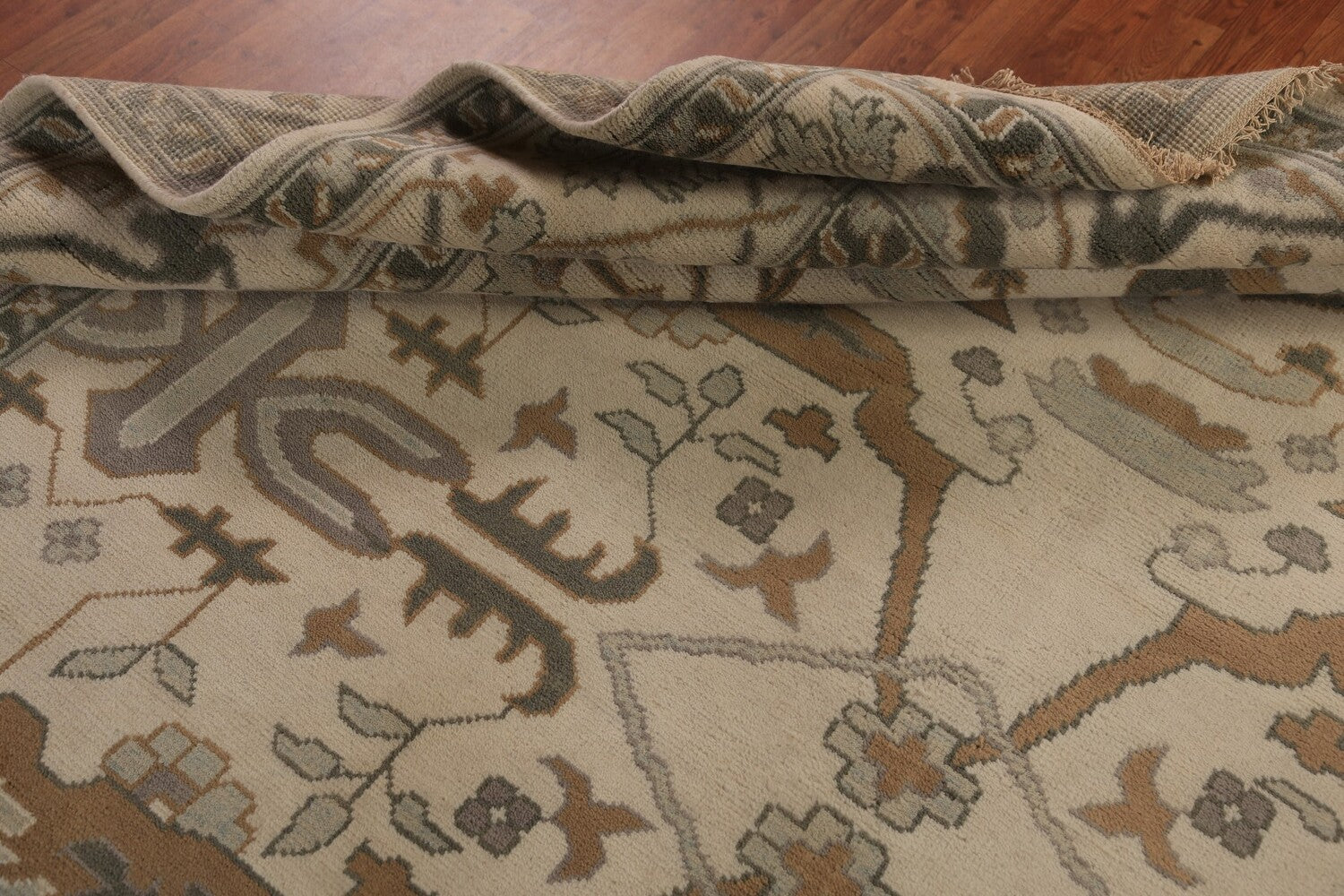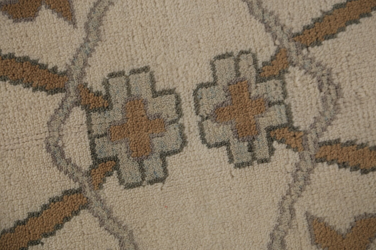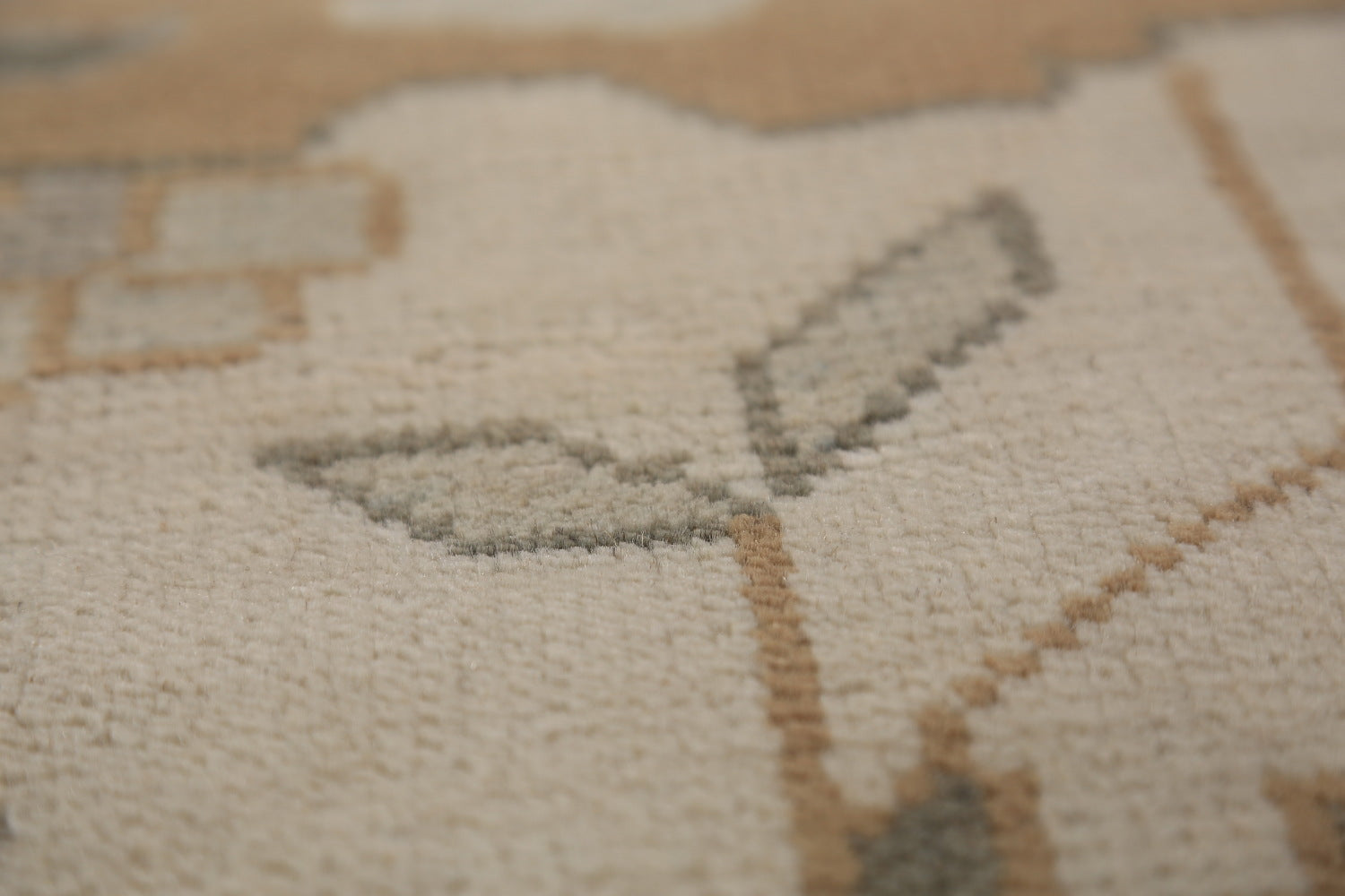 A Beautiful Genuine India Oushak rug is Hand Knotted by skillful weavers in India with 100% Wool Material. This rug is in New, First Quality condition. dimensions are 18' 1'' X 9' 0'' in foot and 551 X 274 in centimeter. the primary color is Beige & Ivories.