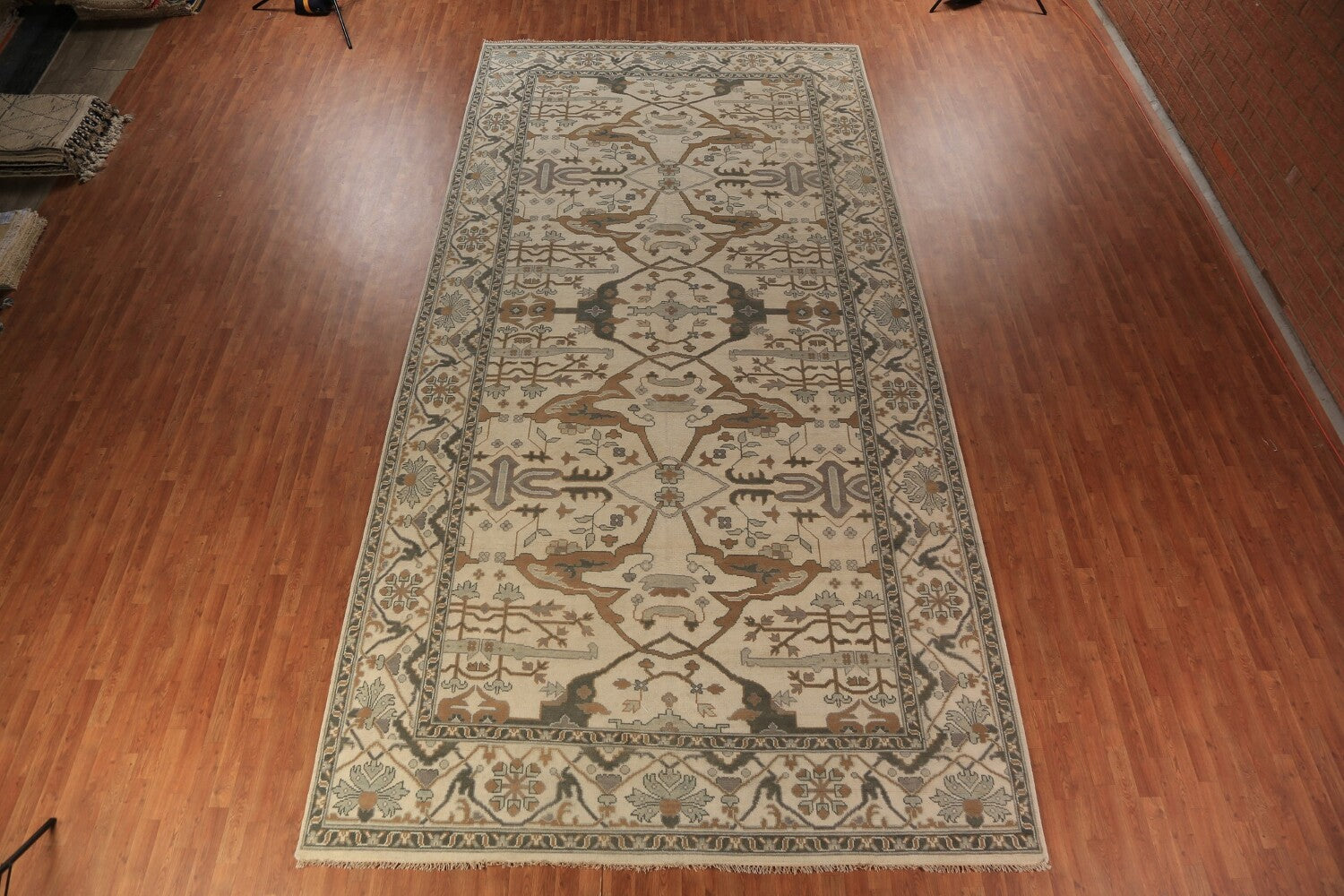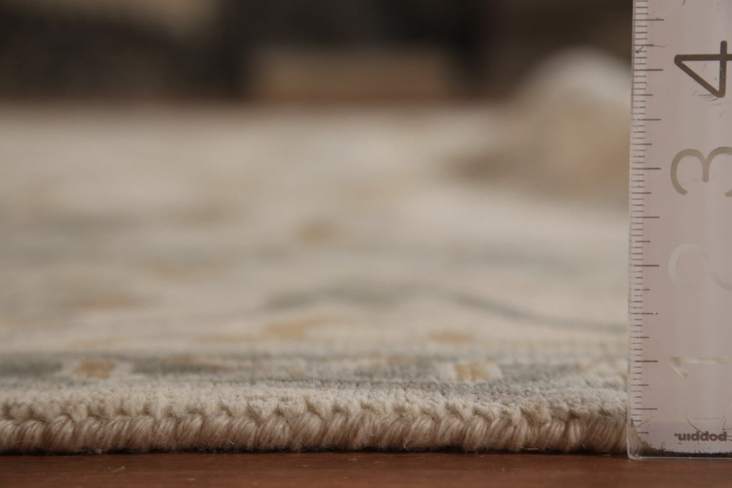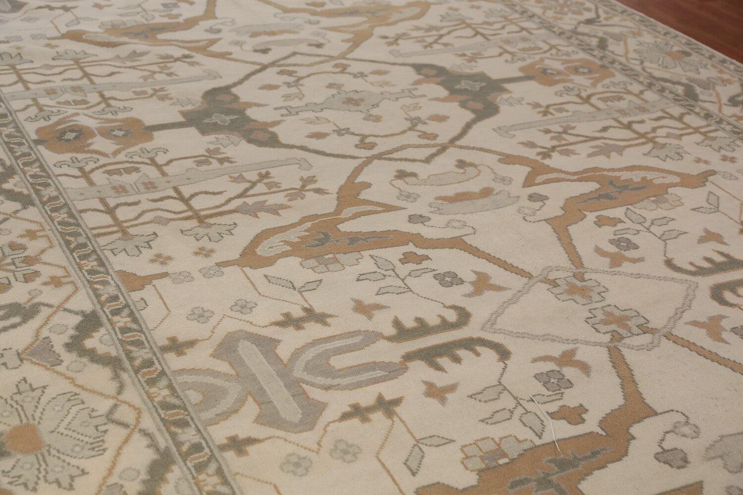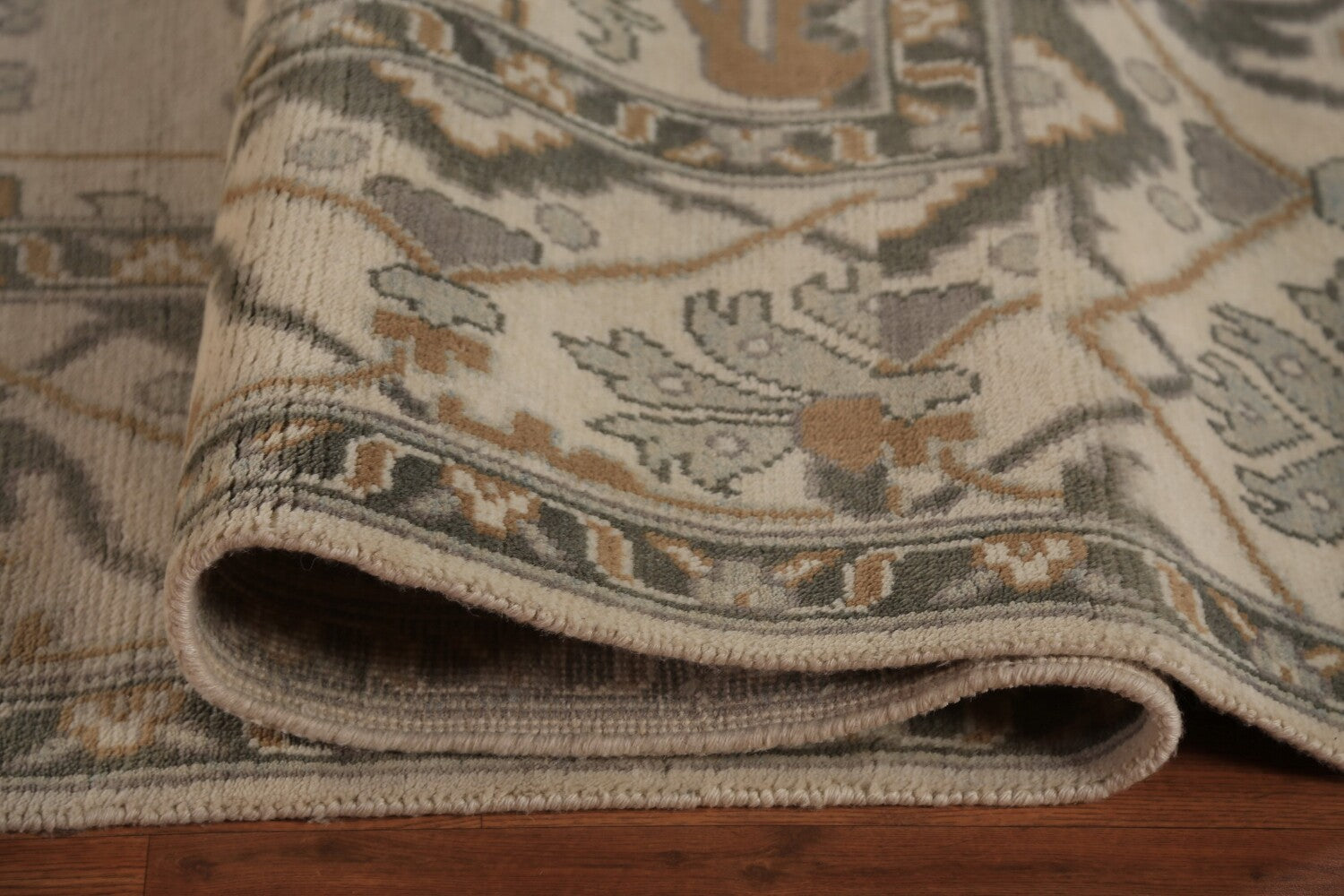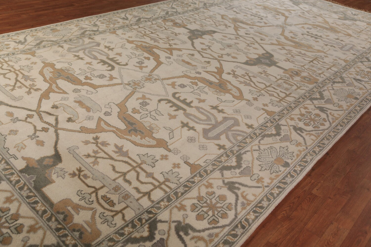 A Beautiful Genuine India Oushak rug is Hand Knotted by skillful weavers in India with 100% Wool Material. This rug is in New, First Quality condition. dimensions are 18' 1'' X 9' 0'' in foot and 551 X 274 in centimeter. the primary color is Beige & Ivories.