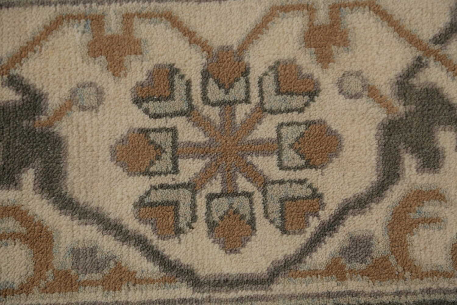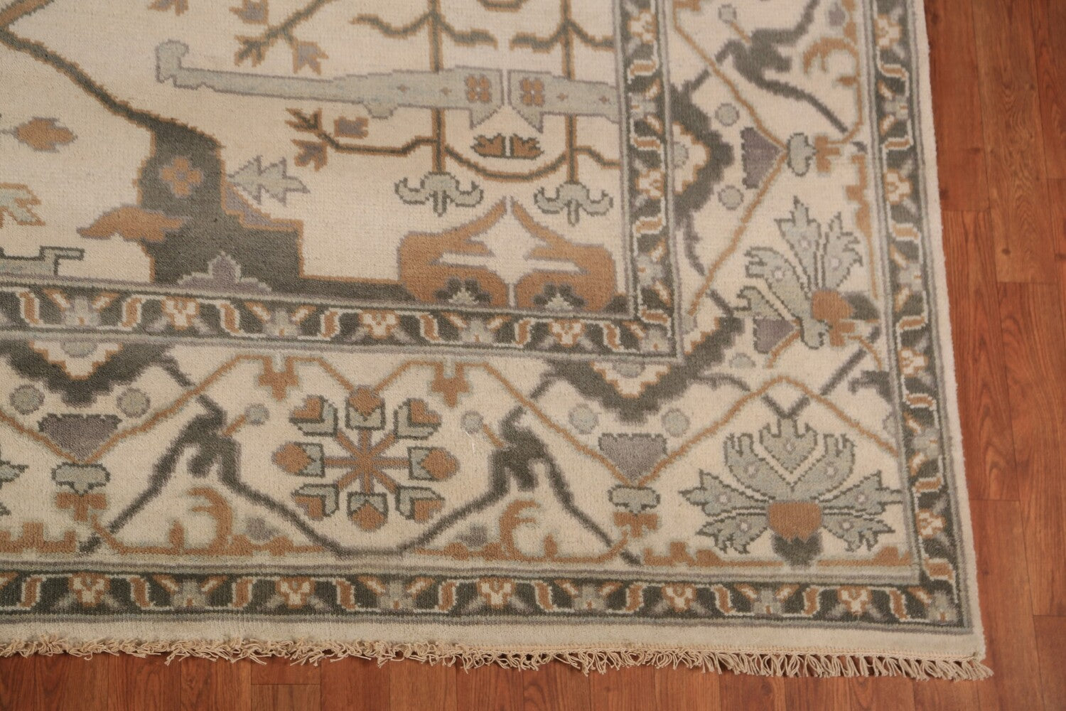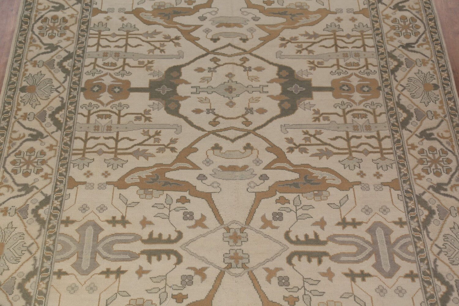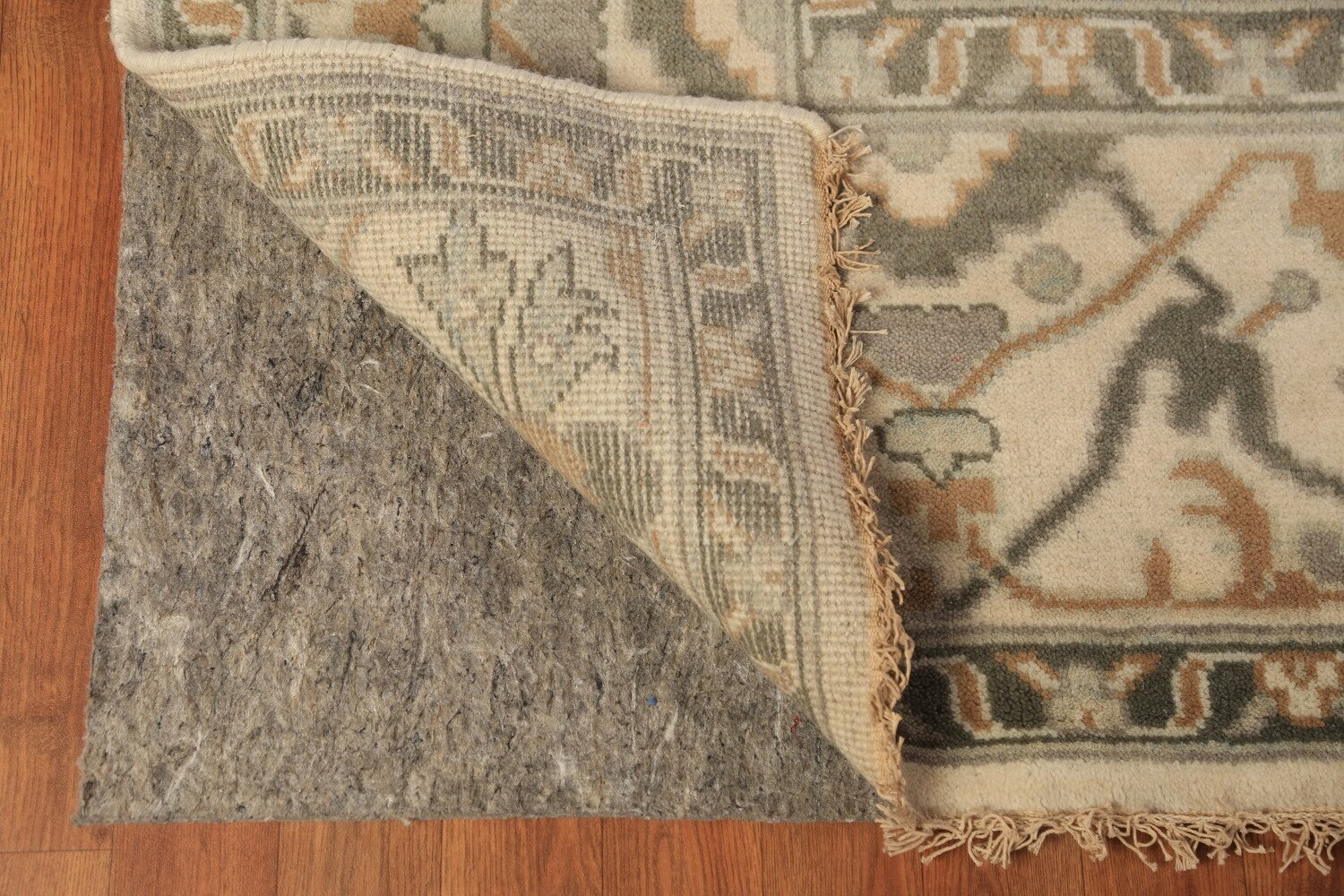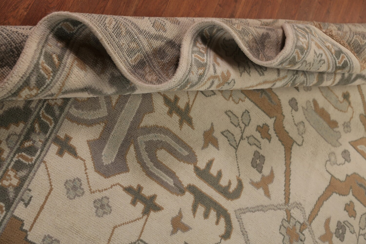 A Beautiful Genuine India Oushak rug is Hand Knotted by skillful weavers in India with 100% Wool Material. This rug is in New, First Quality condition. dimensions are 18' 1'' X 9' 0'' in foot and 551 X 274 in centimeter. the primary color is Beige & Ivories.