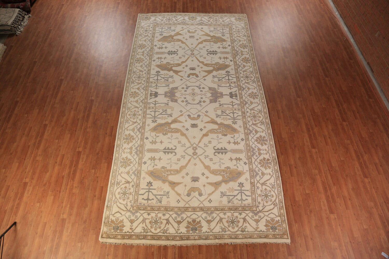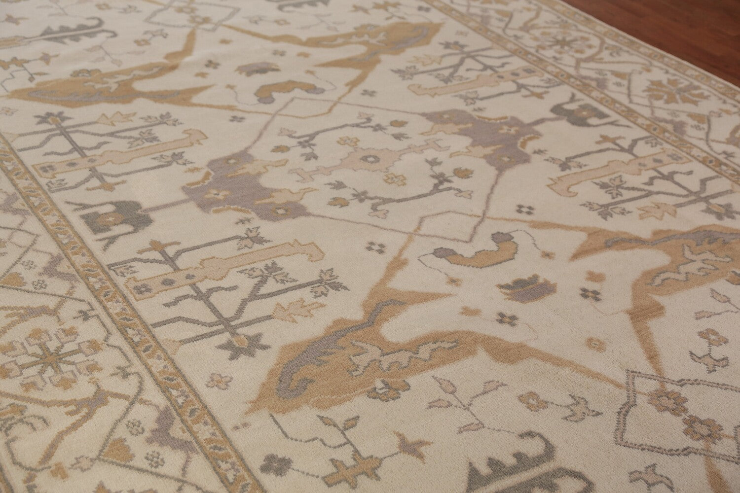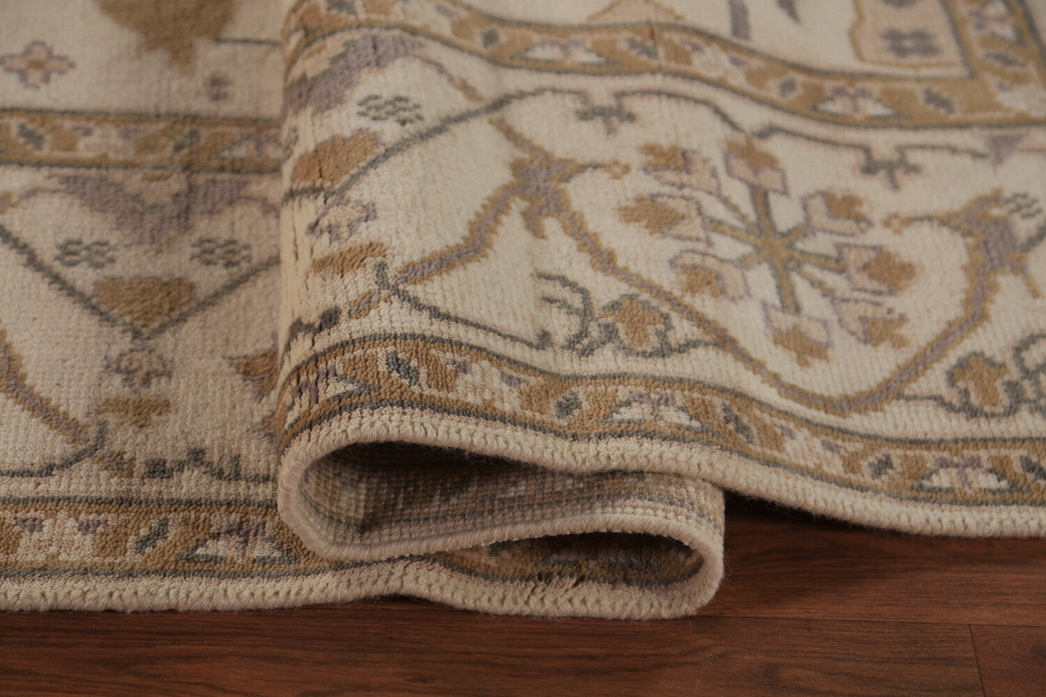 A Beautiful Genuine India Oushak rug is Hand Knotted by skillful weavers in India with 100% Wool Material. This rug is in New, First Quality condition. dimensions are 15' 8'' X 7' 11'' in foot and 478 X 241 in centimeter. the primary color is Beige & Ivories.