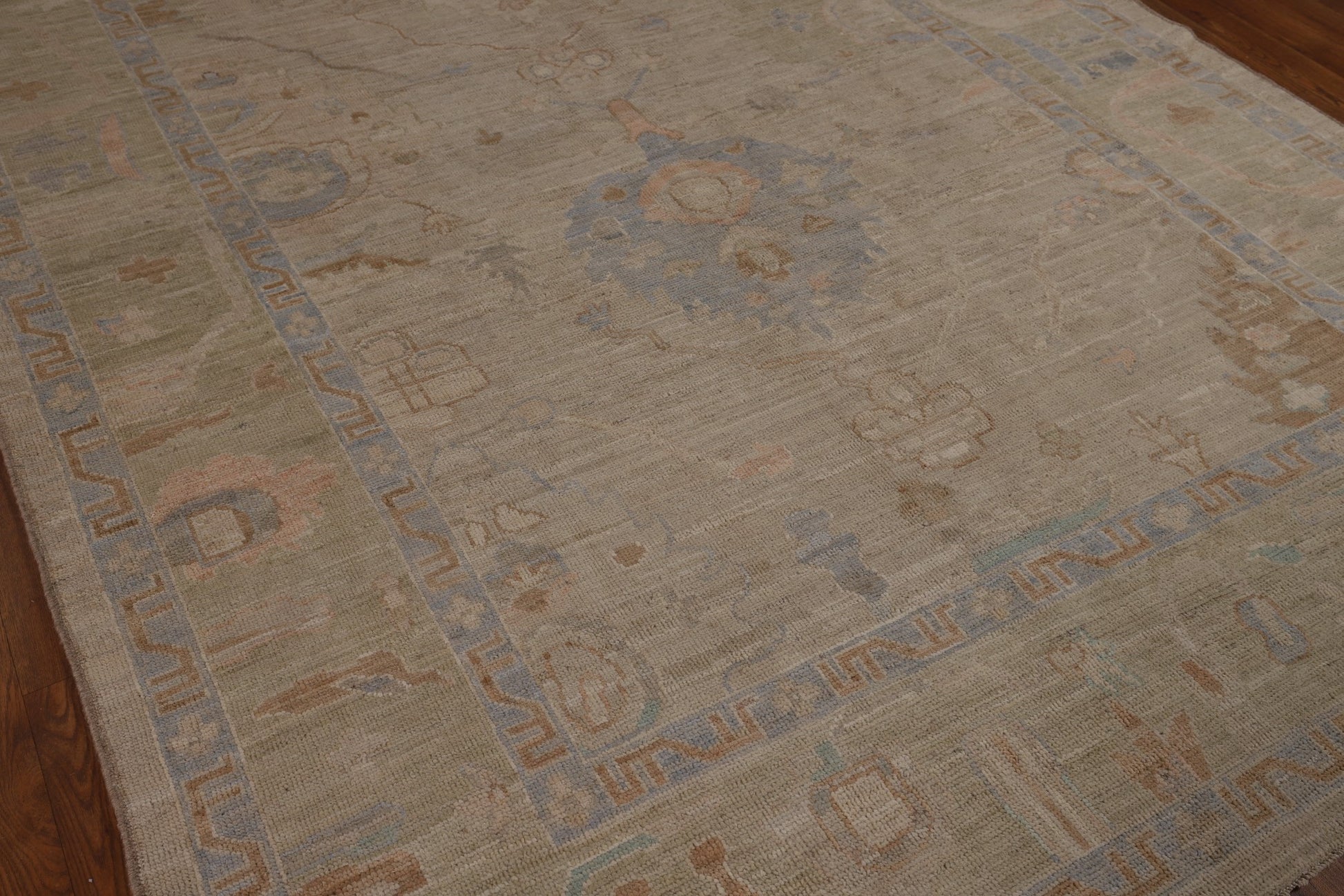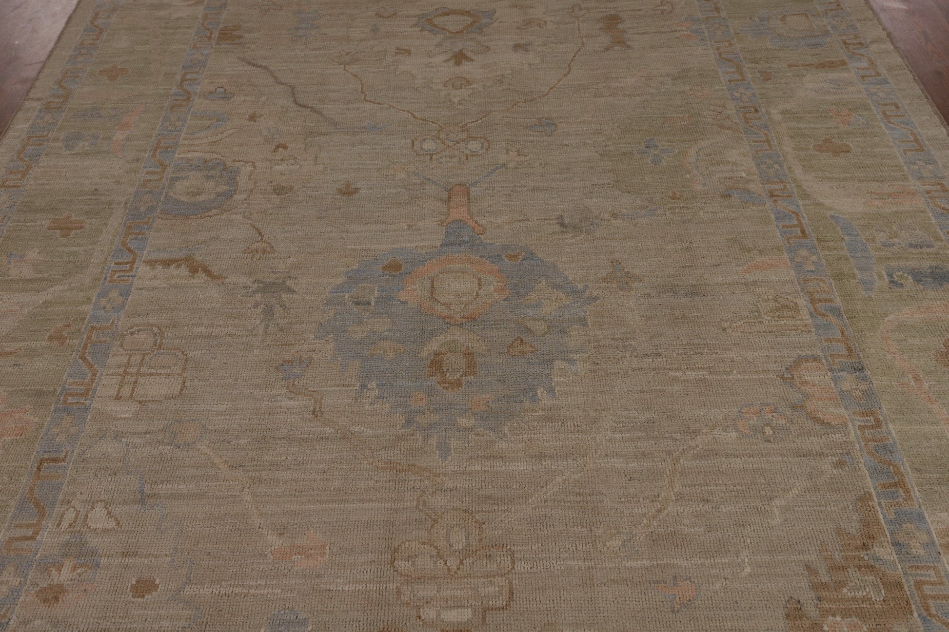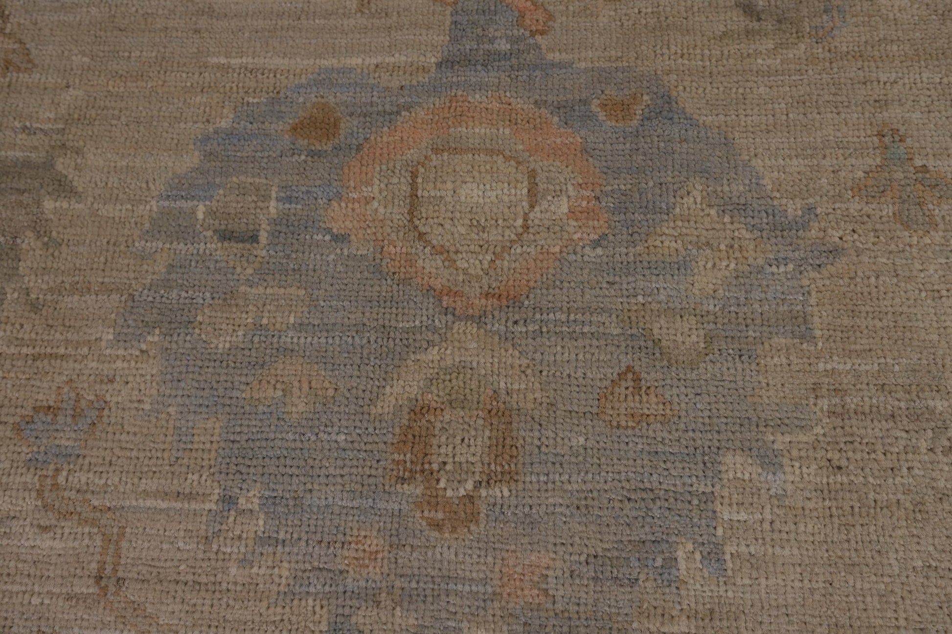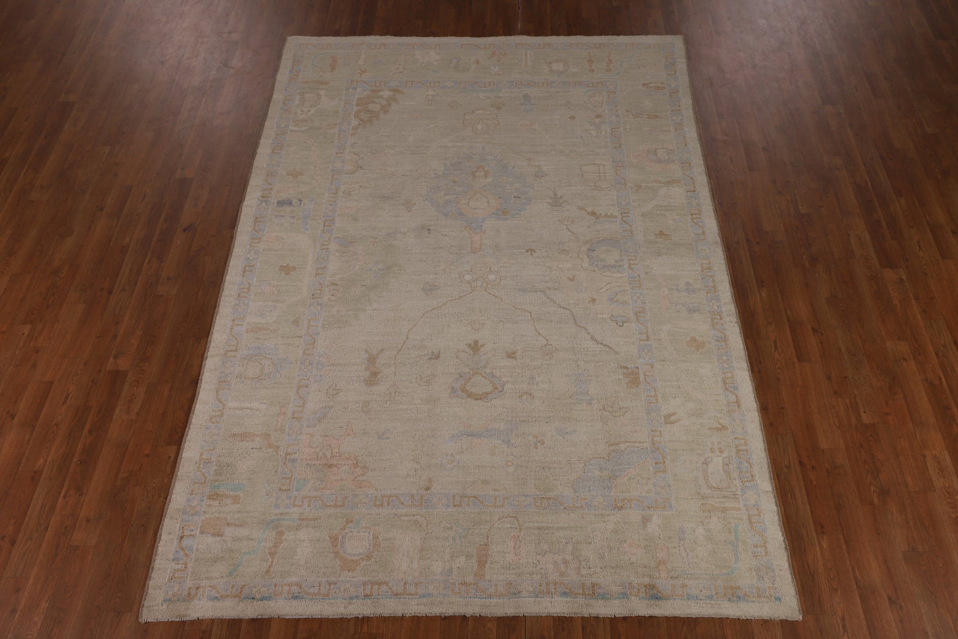 A Beautiful Genuine Turkey Oushak rug is Hand Knotted by skillful weavers in Turkey with 100% Wool Material. This rug is in New, First Quality condition. dimensions are 9' 6'' X 6' 7'' in foot and 290 X 201 in centimeter. the primary color is Beige & Ivories.