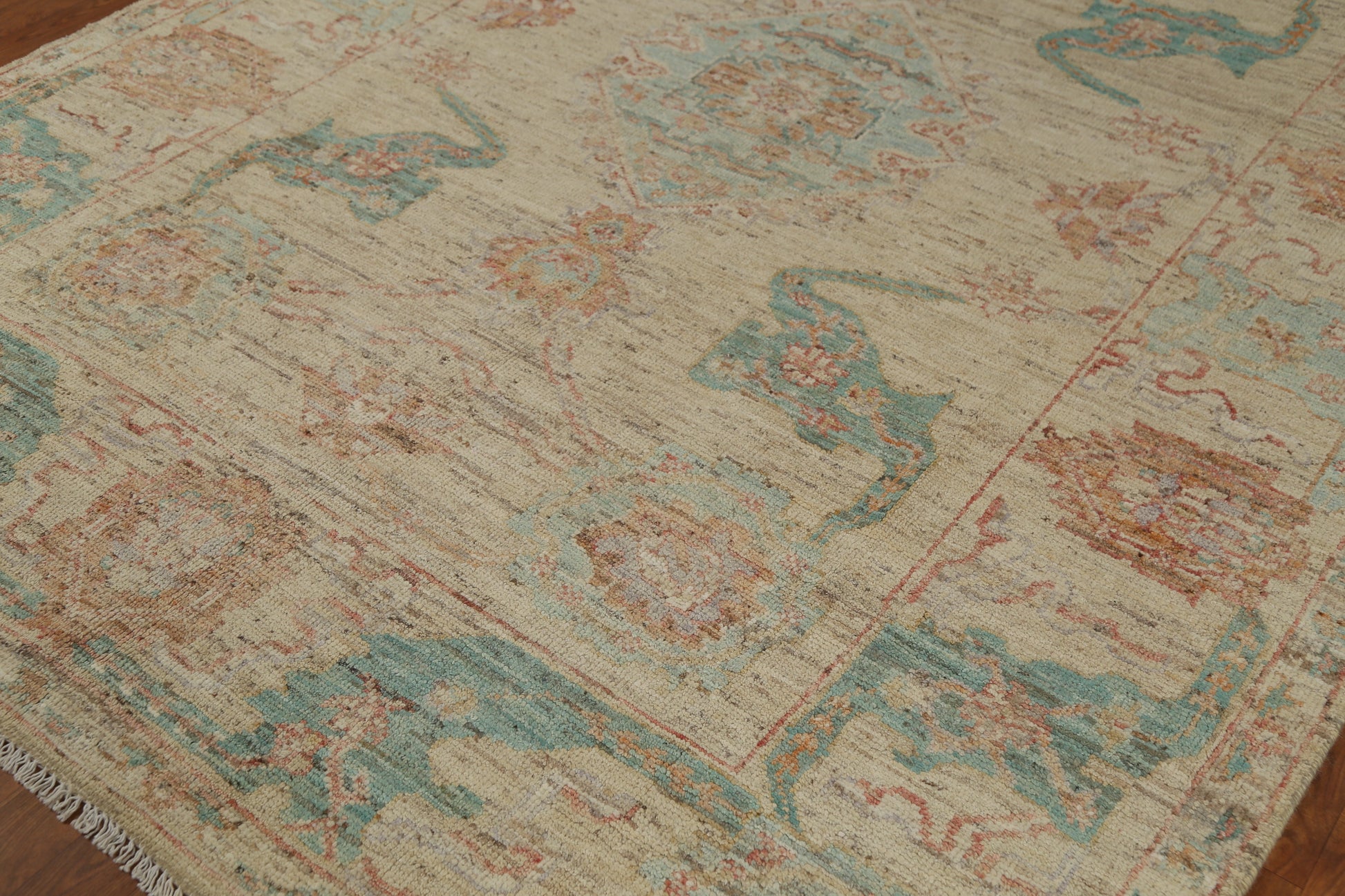 A Beautiful Genuine Turkey Oushak rug is Hand Knotted by skillful weavers in Turkey with 100% Wool Material. This rug is in New, First Quality condition. dimensions are 9' 6'' X 7' 0'' in foot and  290 X 213 in centimeter. the primary color is Beige & Ivories.