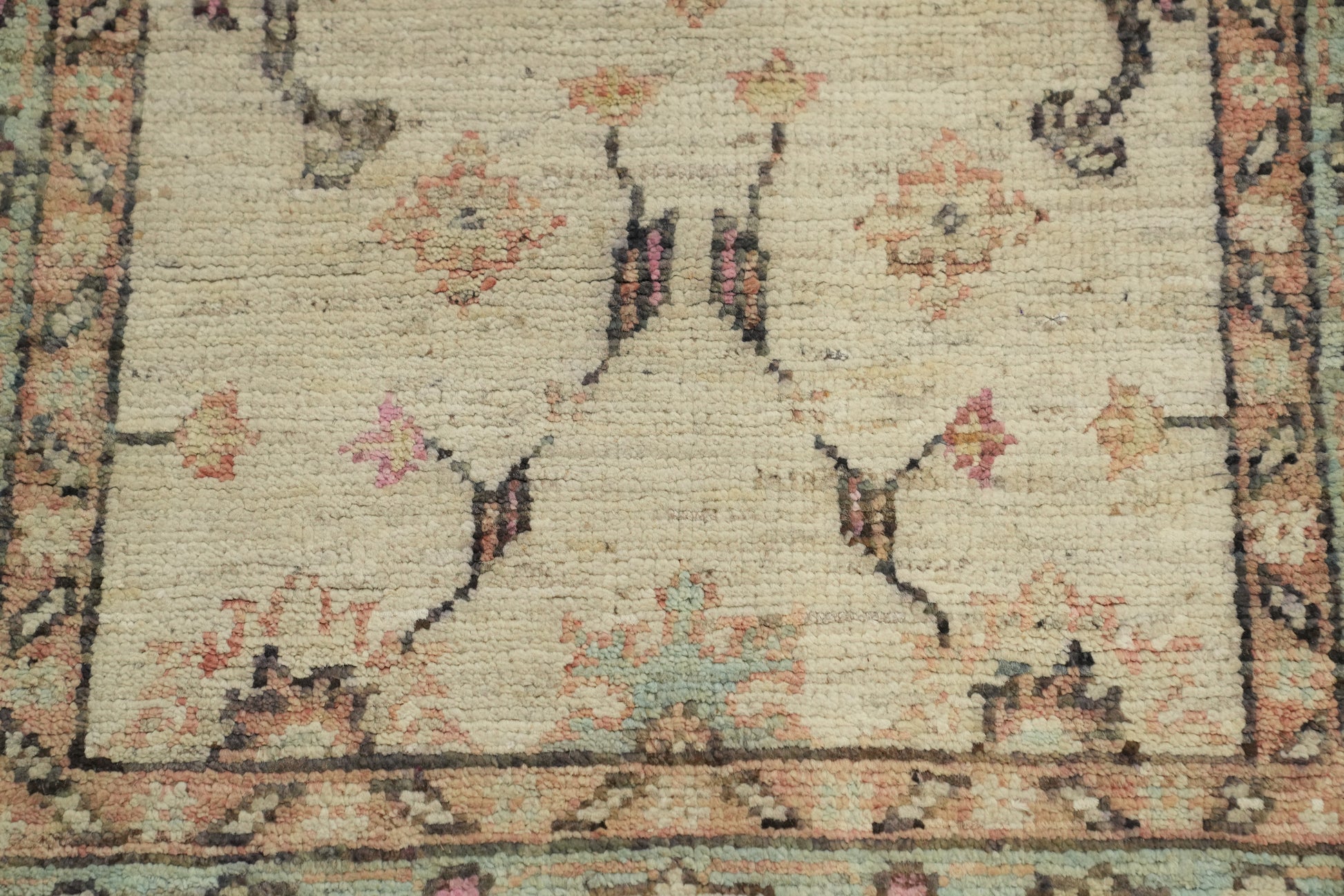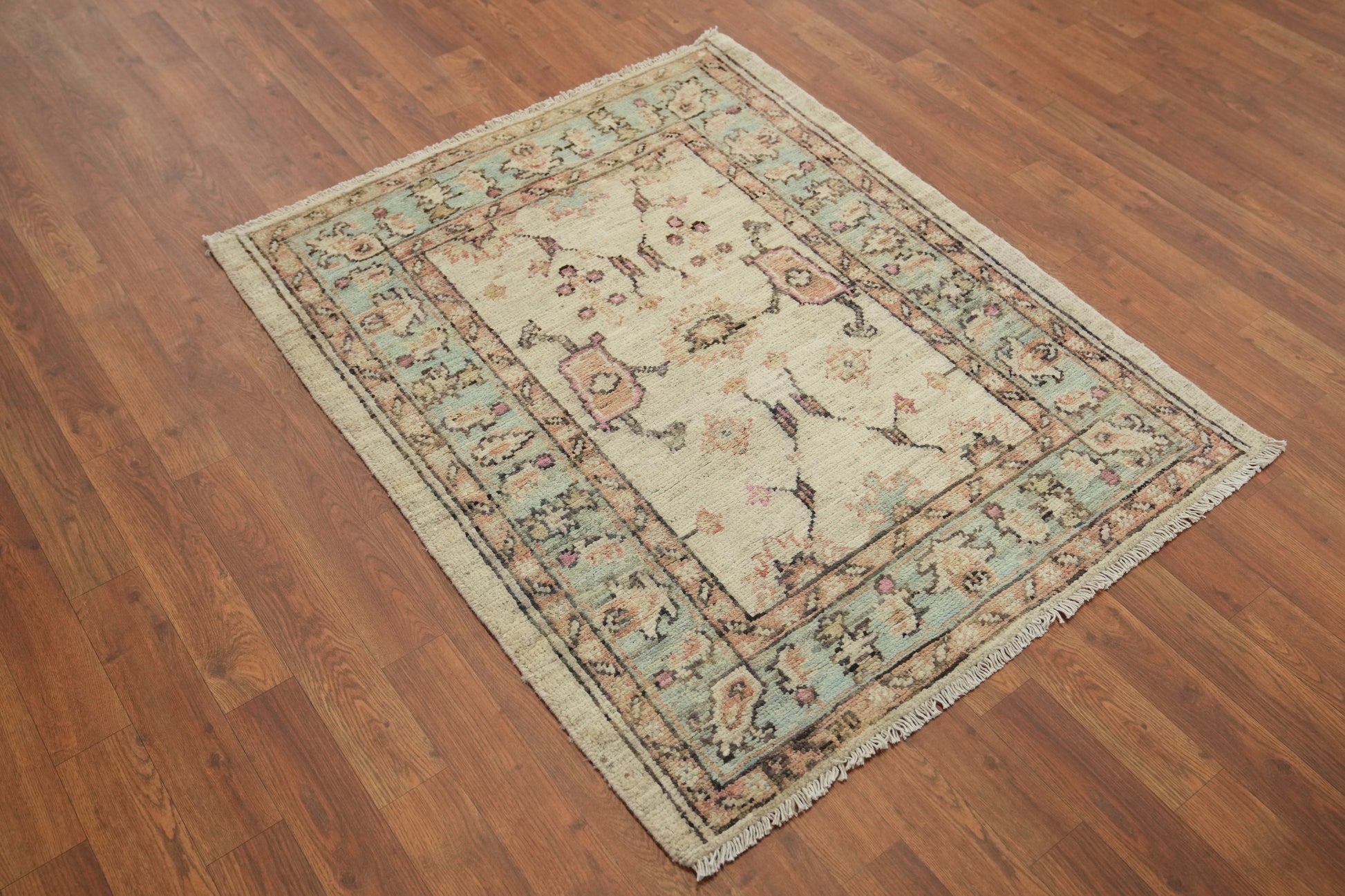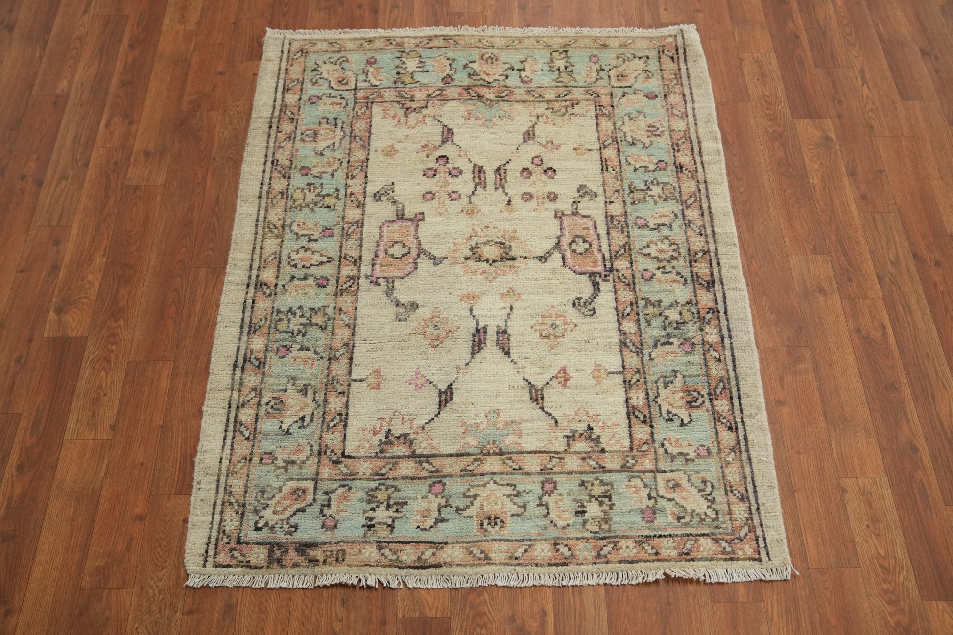 A Beautiful Genuine Turkey Oushak rug is Hand Knotted by skillful weavers in Turkey with 100% Wool Material. This rug is in New, First Quality condition. dimensions are 3' 11'' X 2' 9'' in foot and 119 X 84 in centimeter. the primary color is Beige & Ivories.
