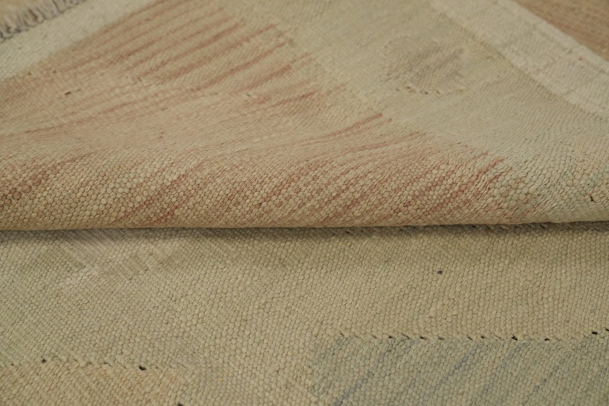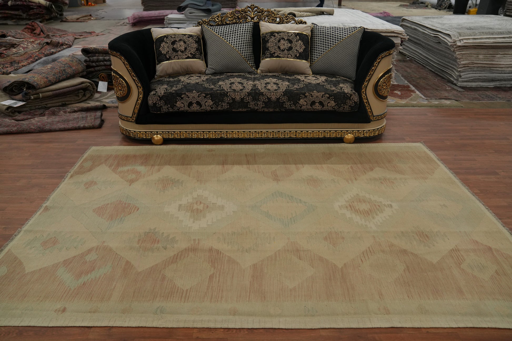 A Beautiful Genuine Pakistan Kilim rug is Hand Woven by skillful weavers in Pakistan with 100% Wool Material. This rug is in New, First Quality condition. dimensions are 9' 7'' X 6' 5'' in foot and 292 X 196 in centimeter. the primary color is Beige & Ivories.