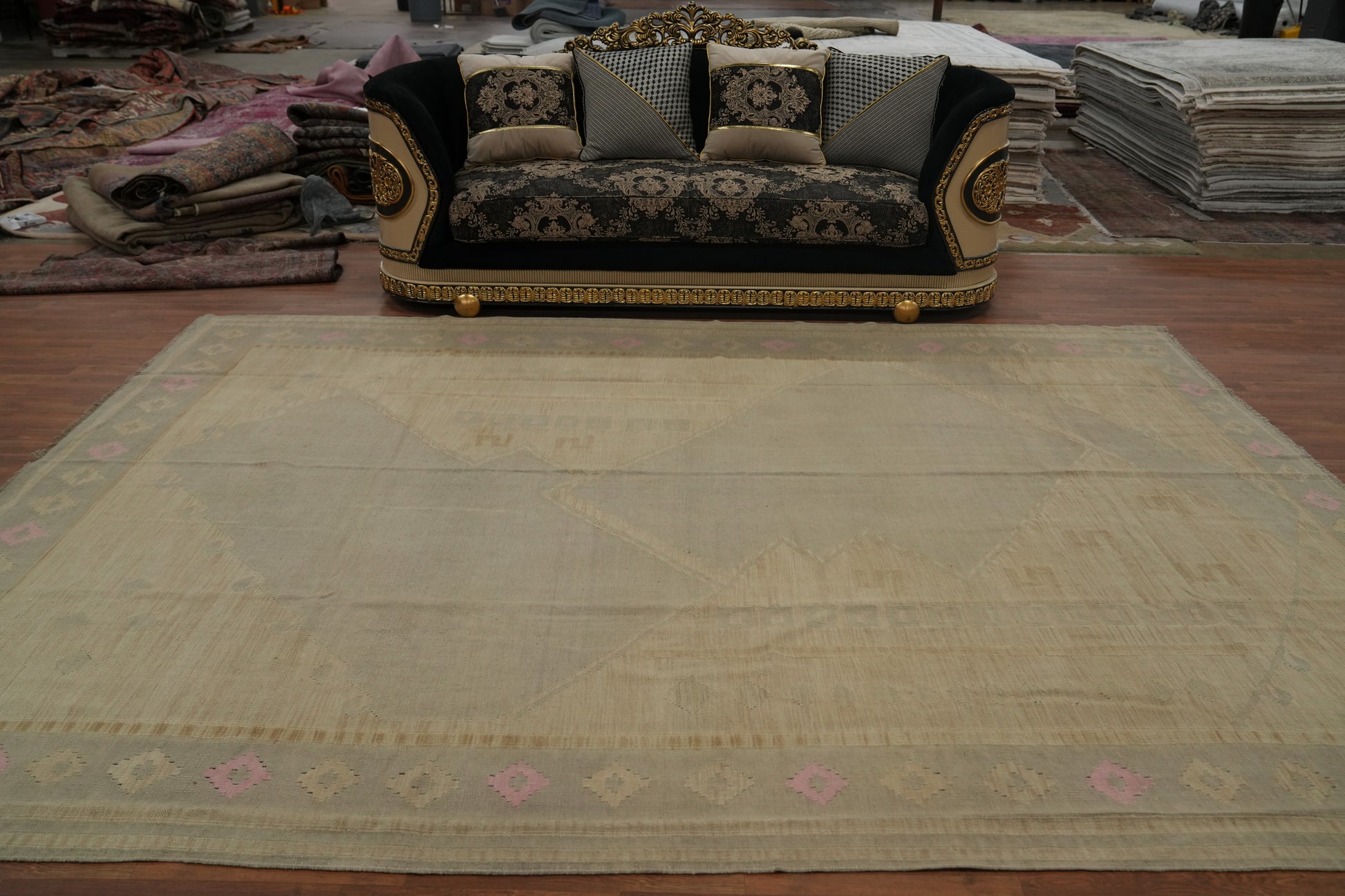 A Beautiful Genuine Pakistan Kilim rug is Hand Woven by skillful weavers in Pakistan with 100% Wool Material. This rug is in New, First Quality condition. dimensions are 12' 1'' X 8' 9'' in foot and 368 X 267 in centimeter. the primary color is Beige & Ivories.