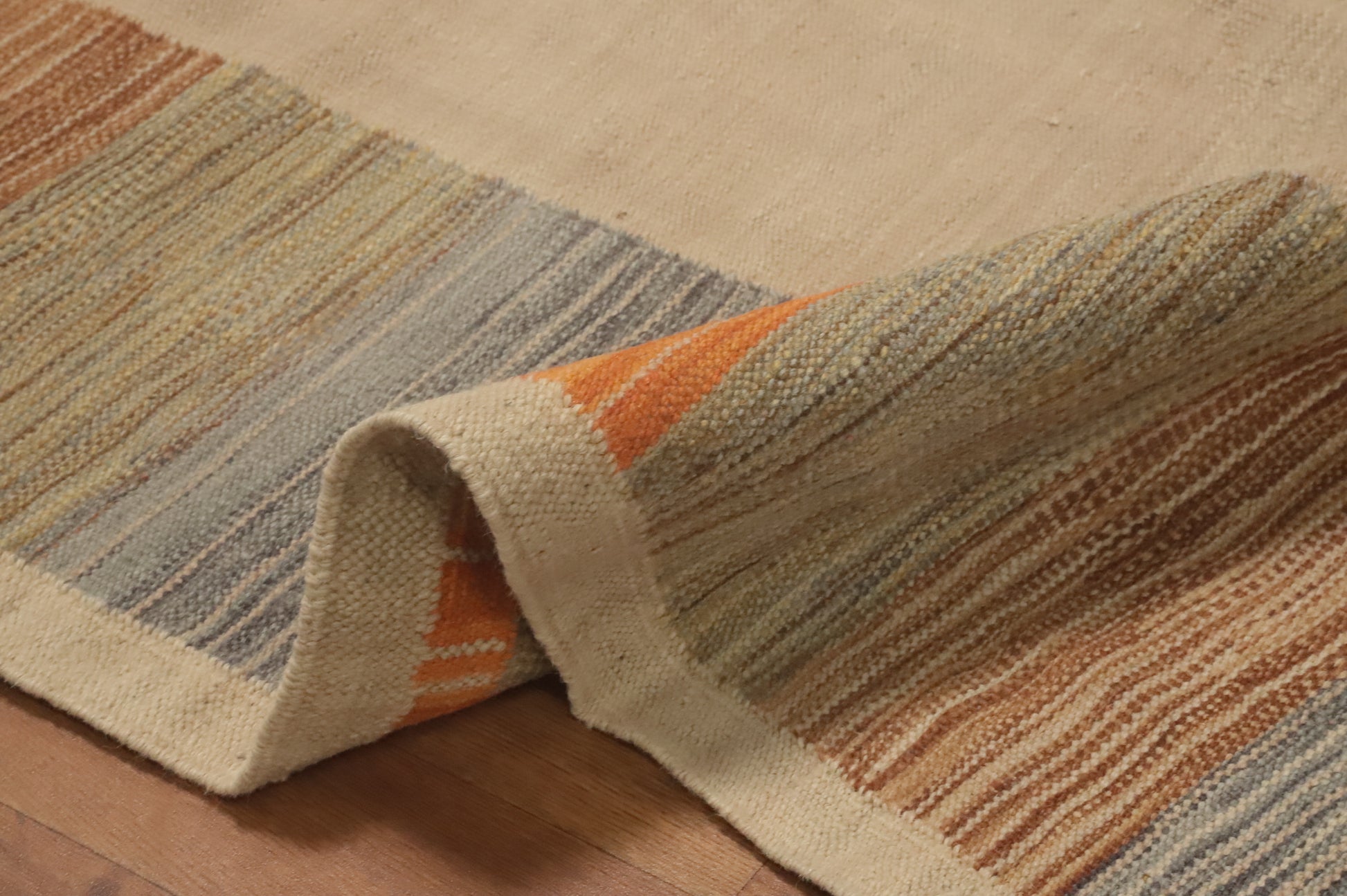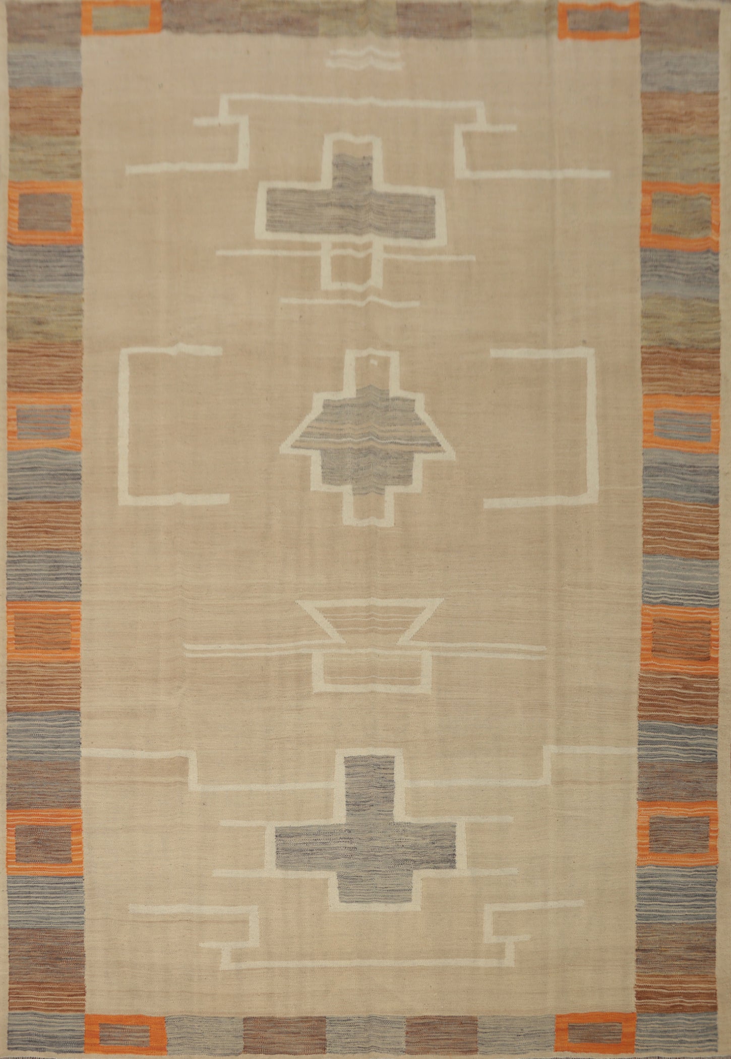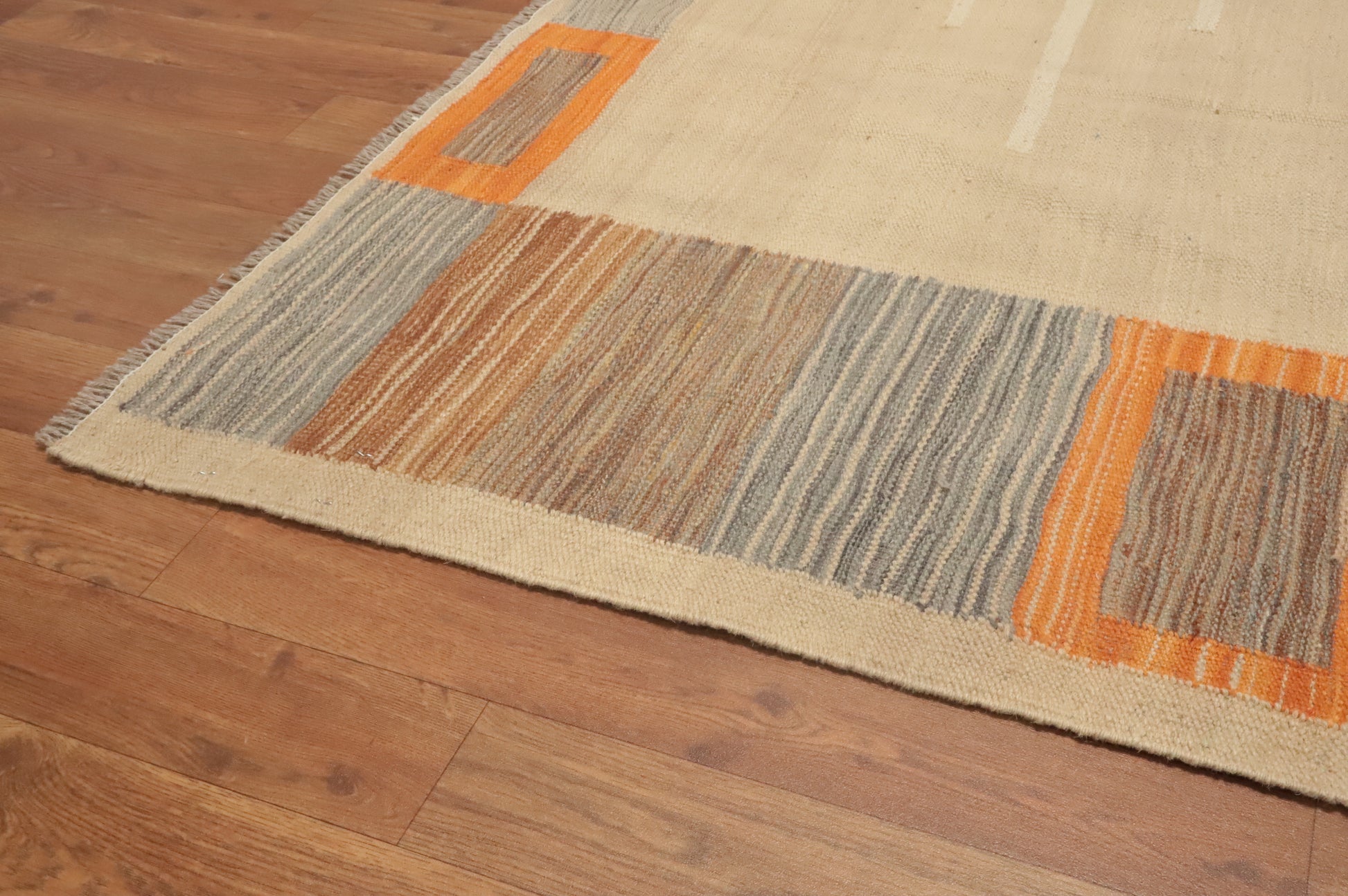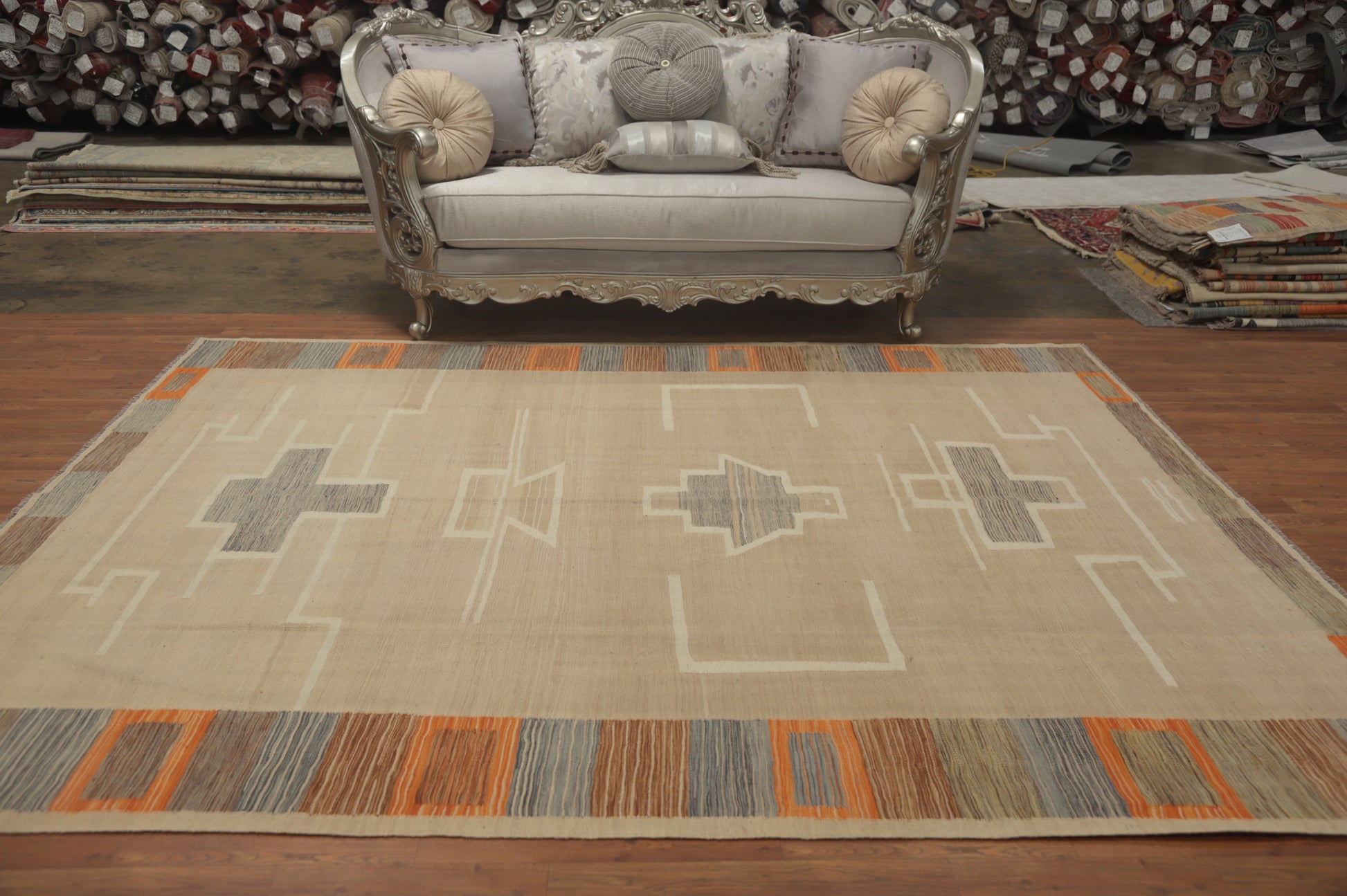 A Beautiful Genuine Pakistan Kilim rug is Hand Woven by skillful weavers in Pakistan with 100% Wool Material. This rug is in New, First Quality condition. dimensions are 9' 7'' X 7' 9'' in foot and 292 X 236 in centimeter. the primary color is Beige & Ivories.
