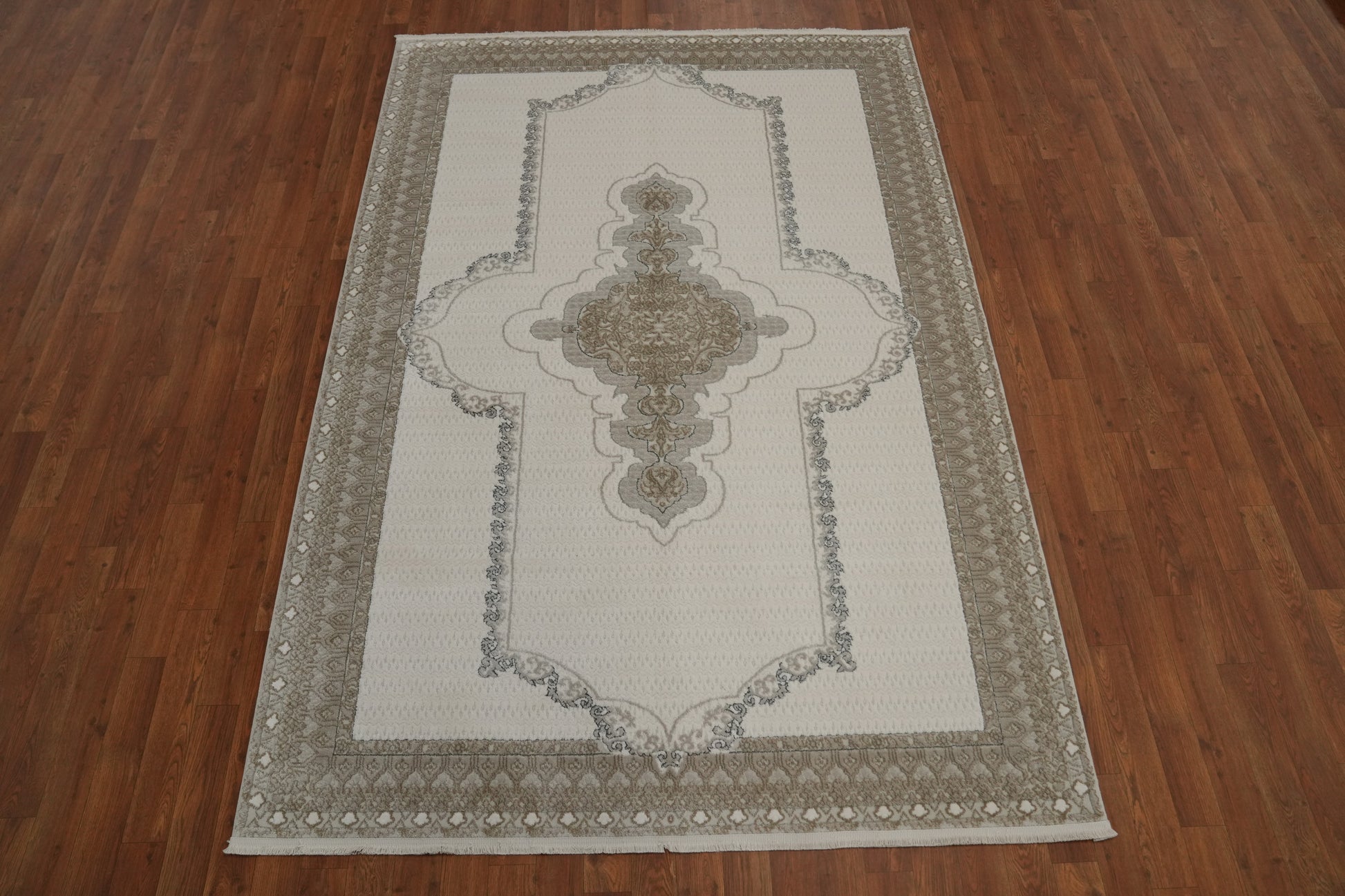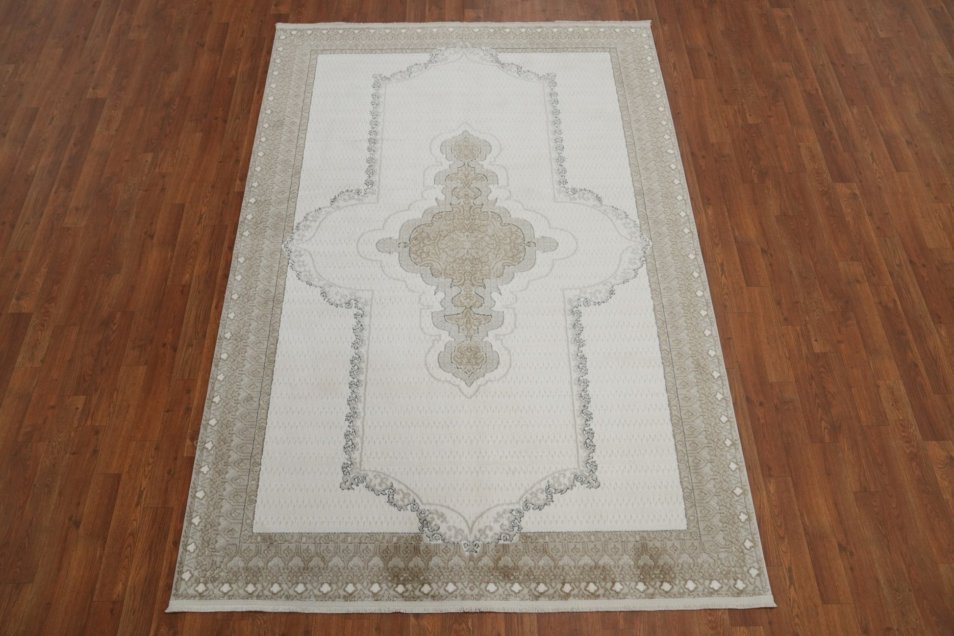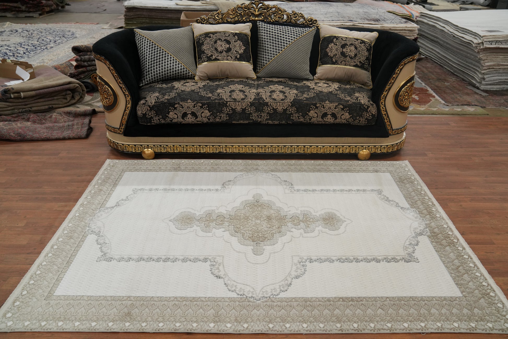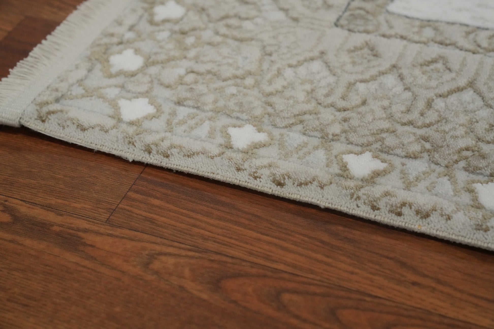 A Beautiful Genuine Turkey Tabriz rug is Machine Made by skillful weavers in Turkey with Polyester Material. This rug is in New, First Quality condition. dimensions are 7' 5'' X 5' 2'' in foot and 226 X 157 in centimeter. the primary color is Beige & Ivories.