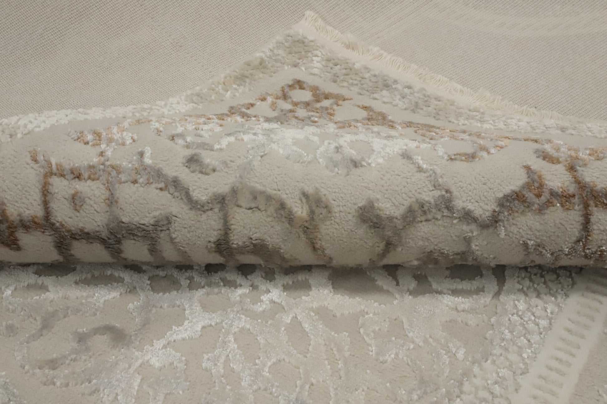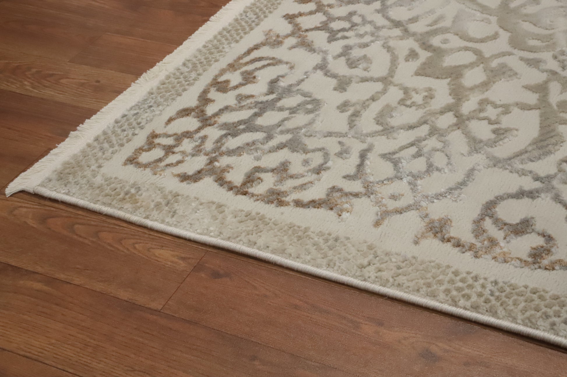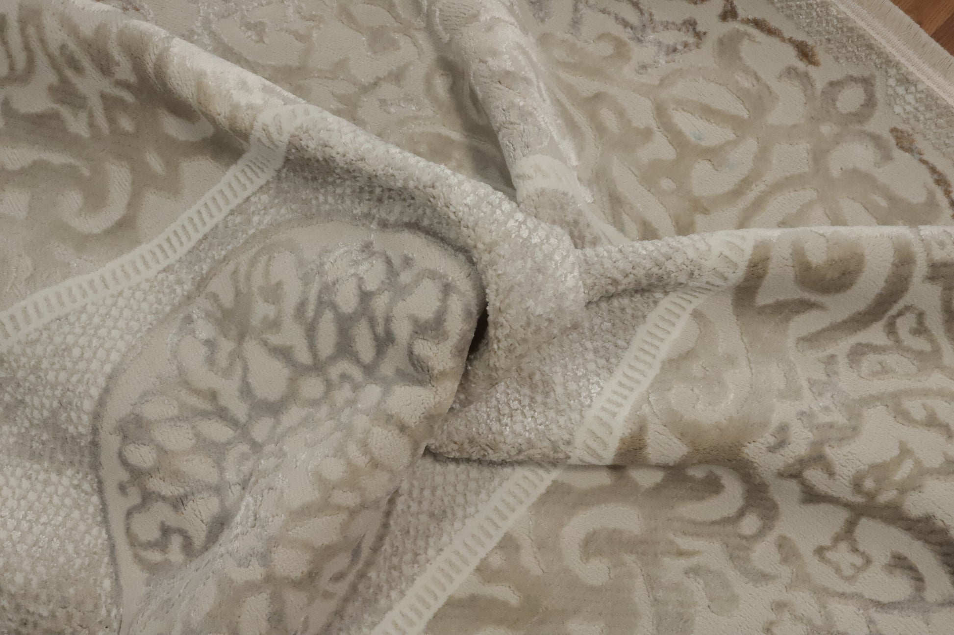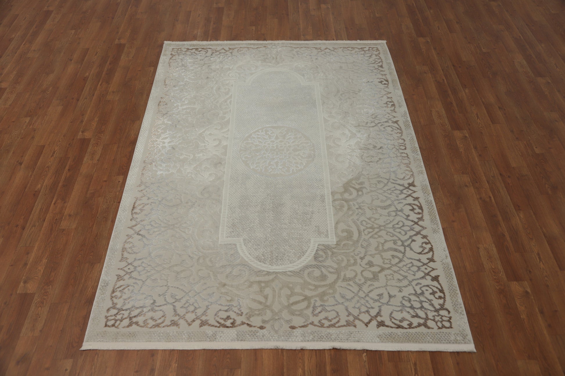 A Beautiful Genuine Turkey Tabriz rug is Machine Made by skillful weavers in Turkey with Polyester Material. This rug is in New, First Quality condition. dimensions are 7' 5'' X 5' 2'' in foot and 226 X 157 in centimeter. the primary color is Beige & Ivories.