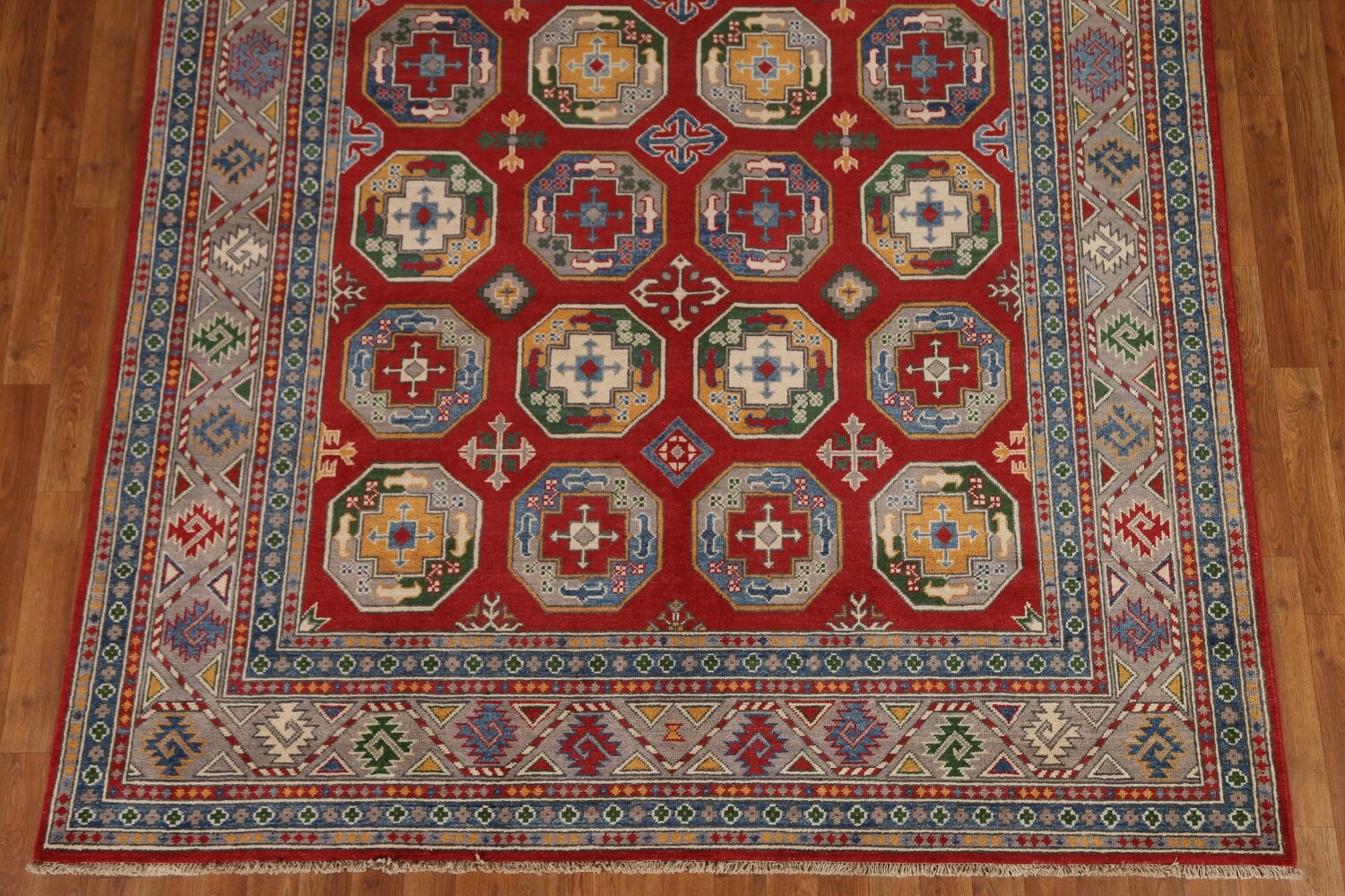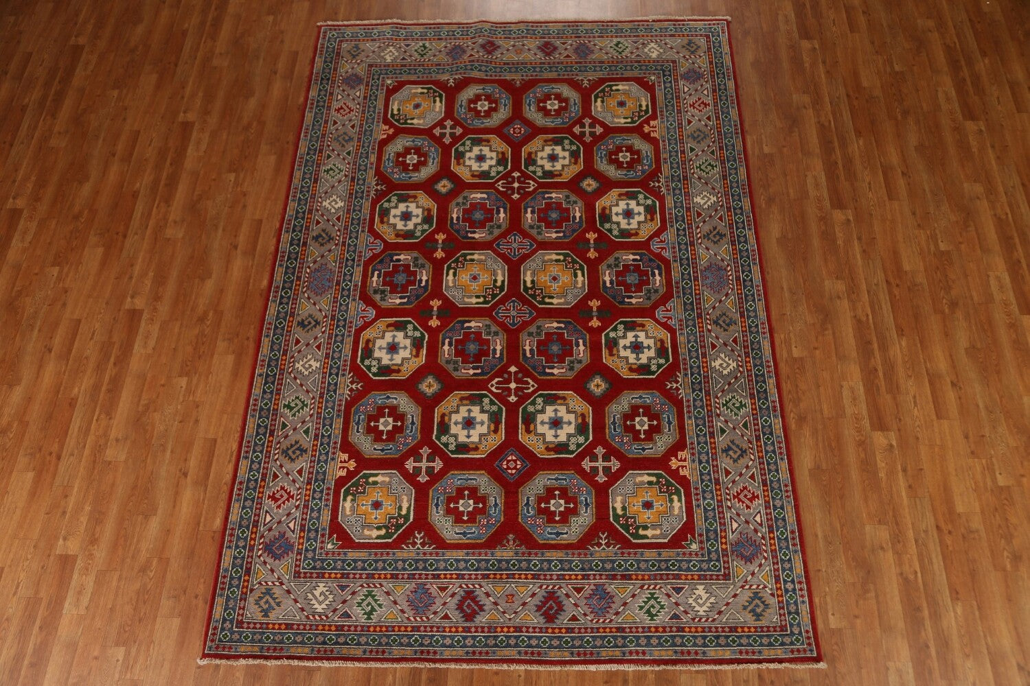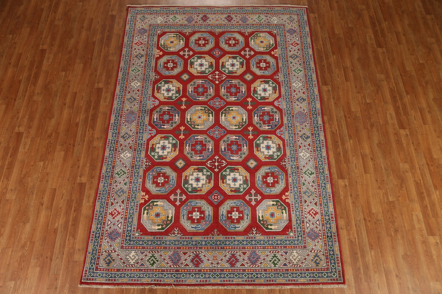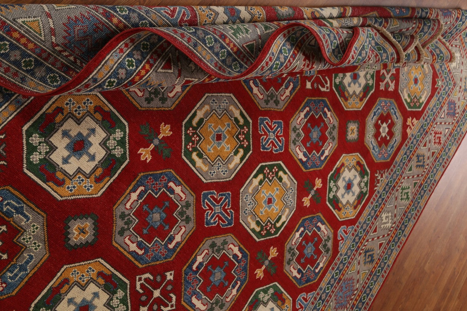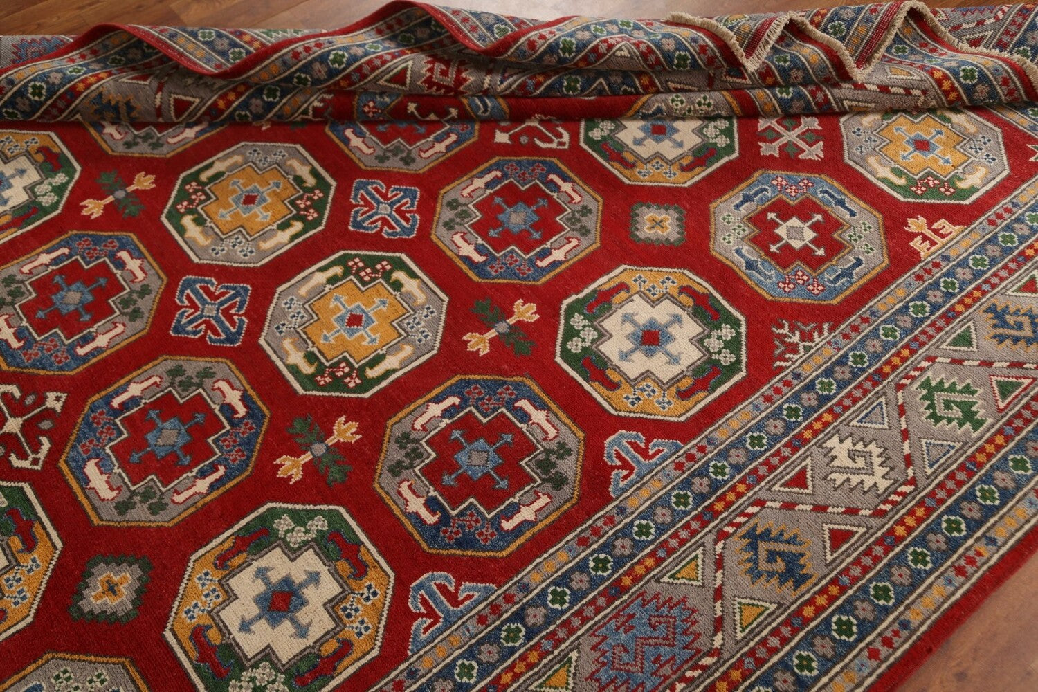 A Beautiful Genuine Pakistan Kazak rug is Hand Knotted by skillful weavers in Pakistan with 100% Wool Material. This rug is in New, First Quality condition. dimensions are 9' 9'' X 6' 8'' in foot and 297 X 203 in centimeter. the primary color is Red.
