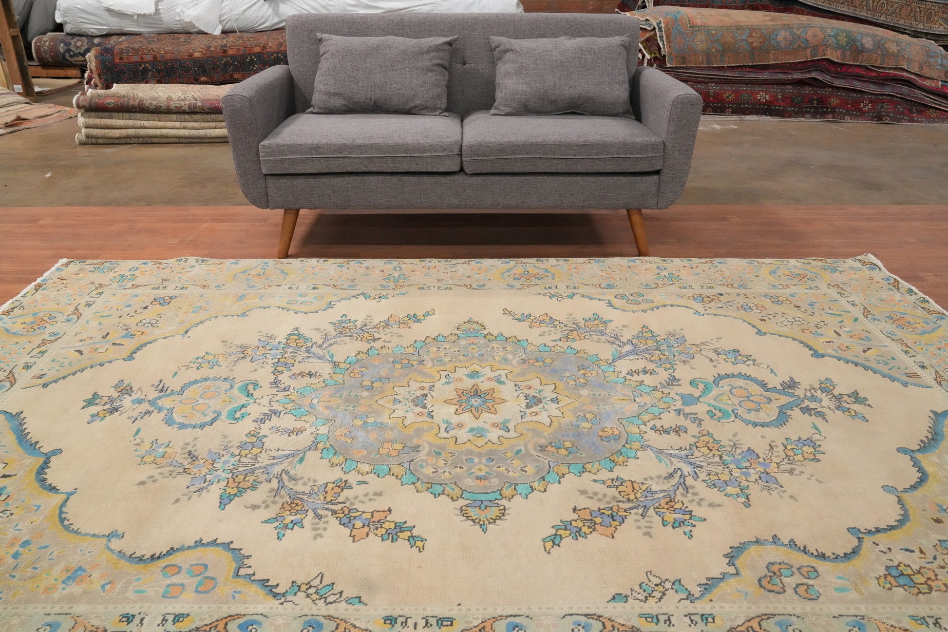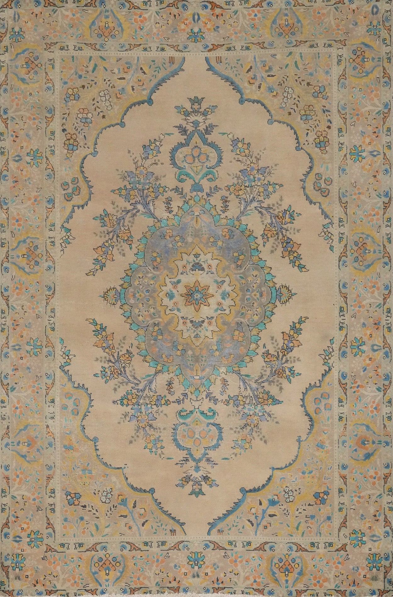 A Beautiful Genuine Persia ( Persia ) Tabriz rug is Hand Knotted by skillful weavers in Persia ( Persia ) with 100% Wool Material. This rug is in Very Good (Evenly Low Pile) condition. dimensions are 9' 10'' X 6' 6'' in foot and 300 X 198 in centimeter. the primary color is Beige & Ivories.