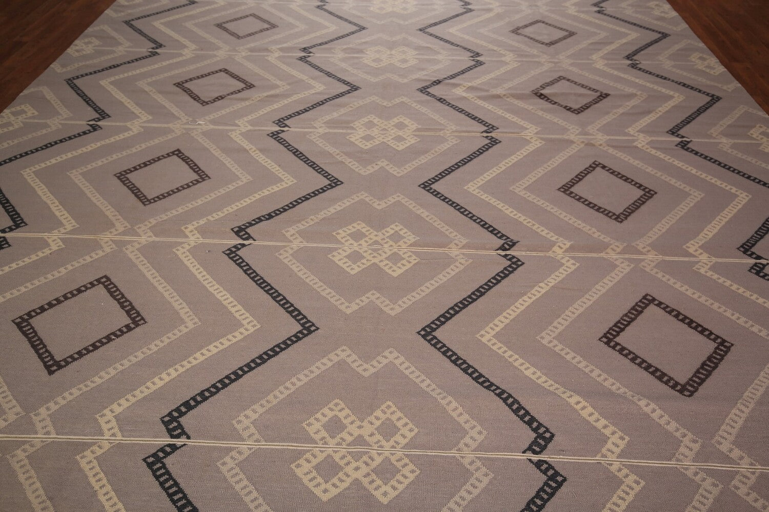 A Beautiful Genuine India Durrie-Kilim rug is Hand Woven by skillful weavers in India with Cotton Material. This rug is in New, First Quality condition. dimensions are 18' 9'' X 10' 5'' in foot and 572 X 318 in centimeter. the primary color is Greys & Charcoal.