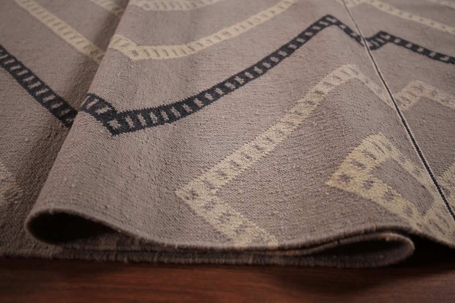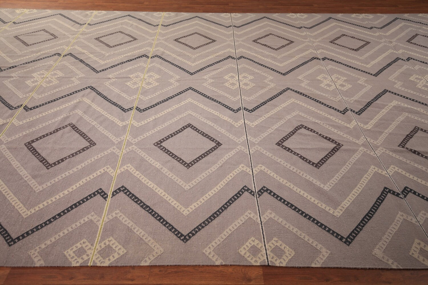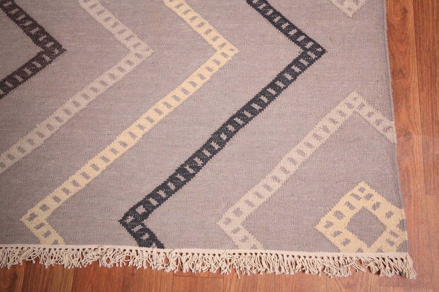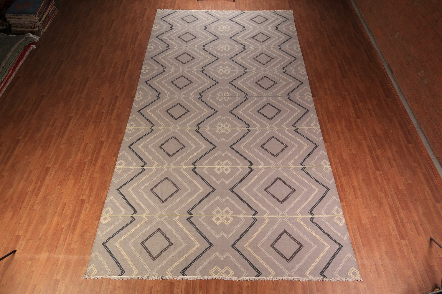 A Beautiful Genuine India Durrie-Kilim rug is Hand Woven by skillful weavers in India with Cotton Material. This rug is in New, First Quality condition. dimensions are 19' 2'' X 10' 5'' in foot and 584 X 318 in centimeter. the primary color is Greys & Charcoal.