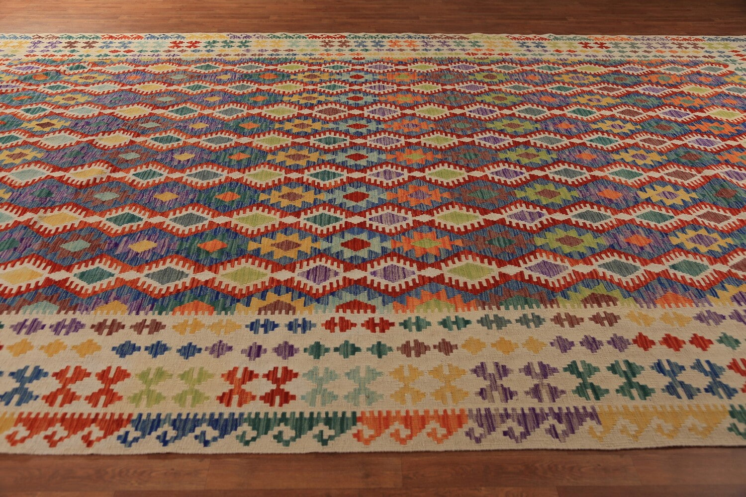 A Beautiful Genuine Pakistan Kilim rug is Hand Woven by skillful weavers in Pakistan with 100% Wool Material. This rug is in New, First Quality condition. dimensions are 15' 11'' X 10' 1'' in foot and 485 X 307 in centimeter. the primary color is Multi-Colored.