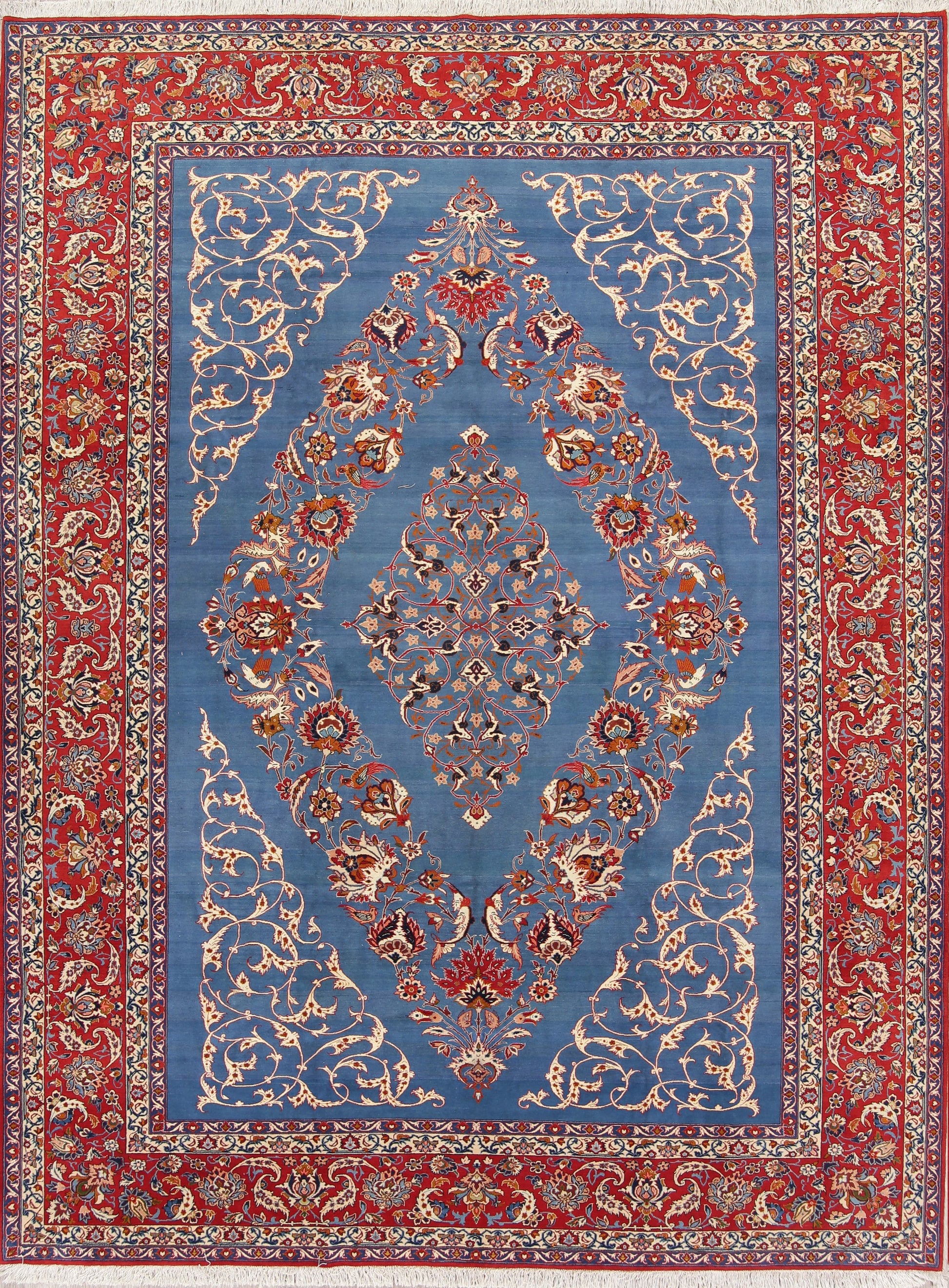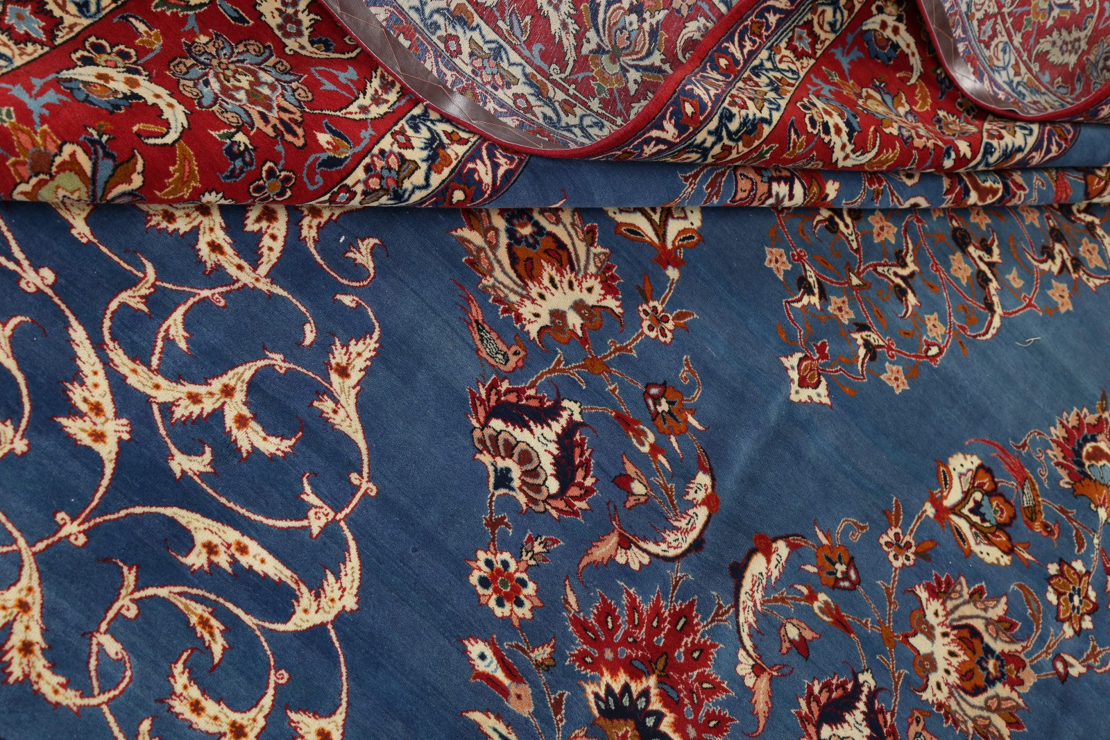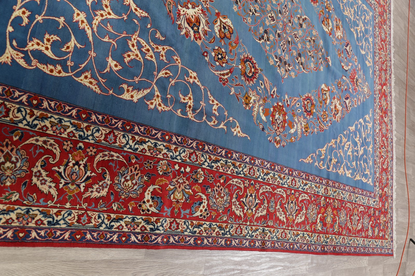 A Beautiful Genuine Persia ( Persia ) Kashan rug is Hand Knotted by skillful weavers in Persia ( Persia ) with 100% Wool Material. This rug is in Very Good (Abrash-100% Vegetable Dye) condition. dimensions are 13' 10'' X 10' 4'' in foot and 422 X 315 in centimeter. the primary color is Navy Blue & Blues.