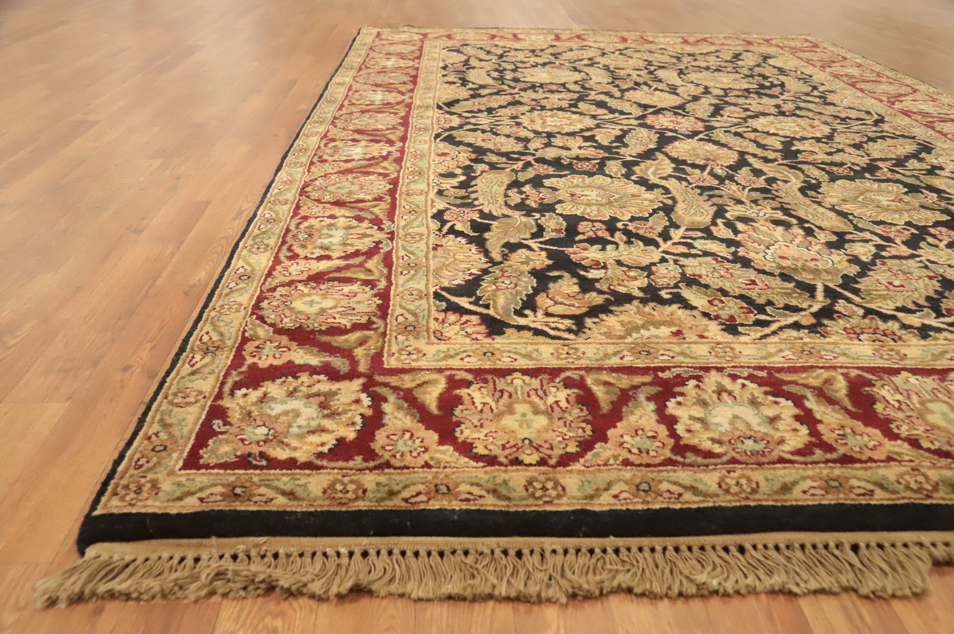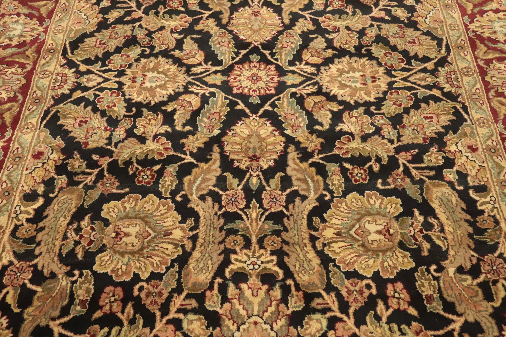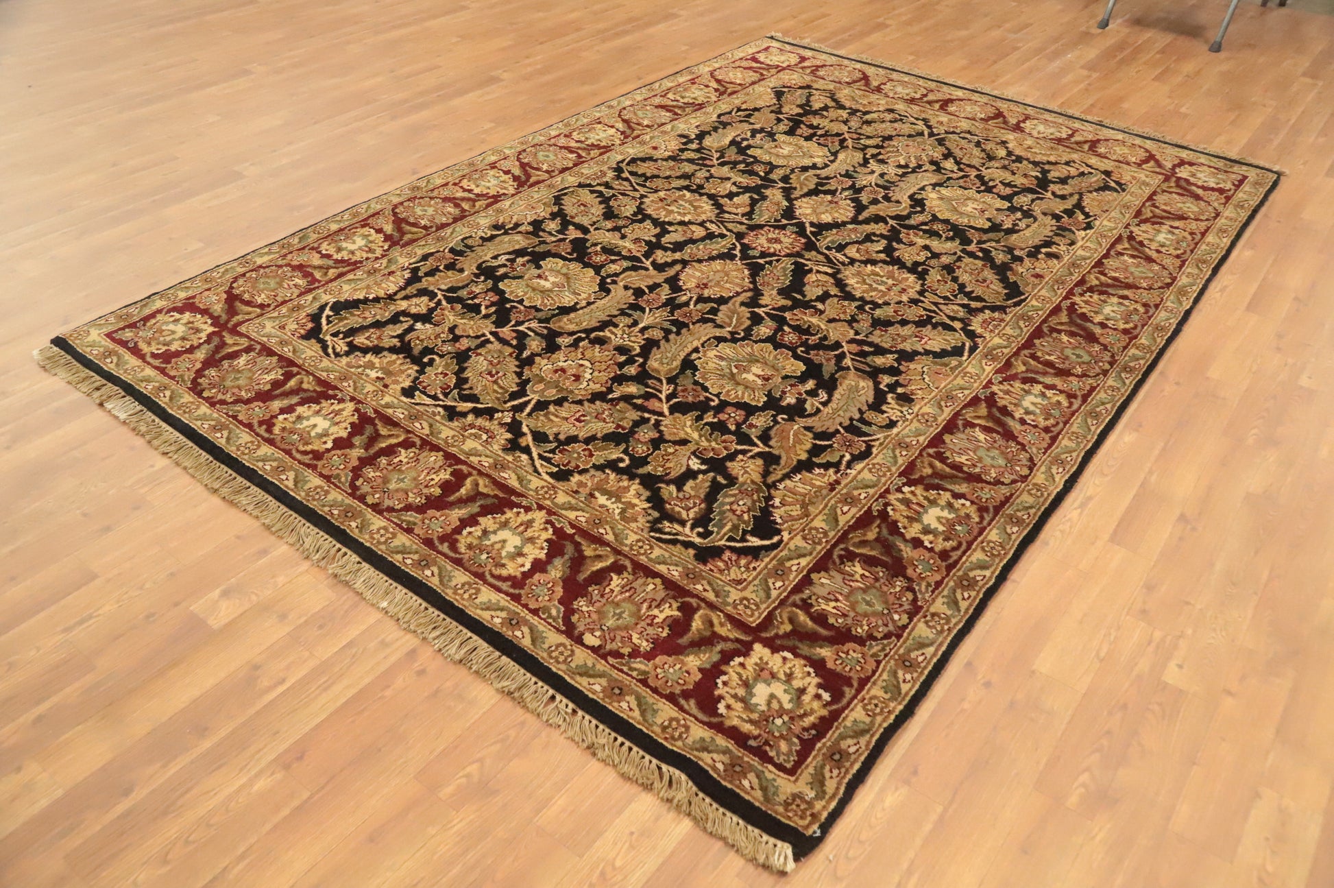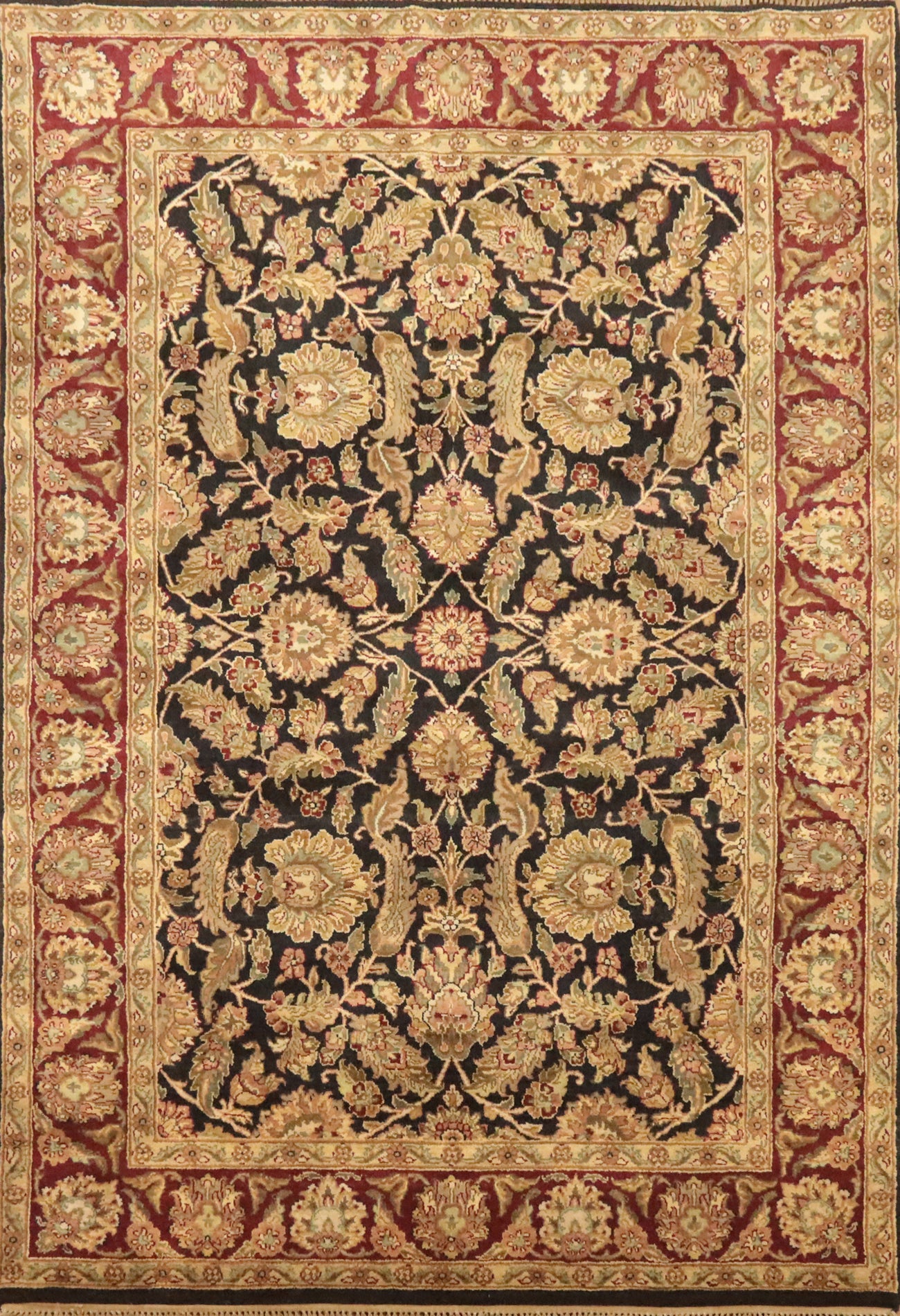 A Beautiful Genuine India Agra rug is Hand Knotted by skillful weavers in India with 100% Wool Material. This rug is in New, First Quality condition. dimensions are 8' 10'' X 5' 11'' in foot and 269 X 180 in centimeter. the primary color is Black.