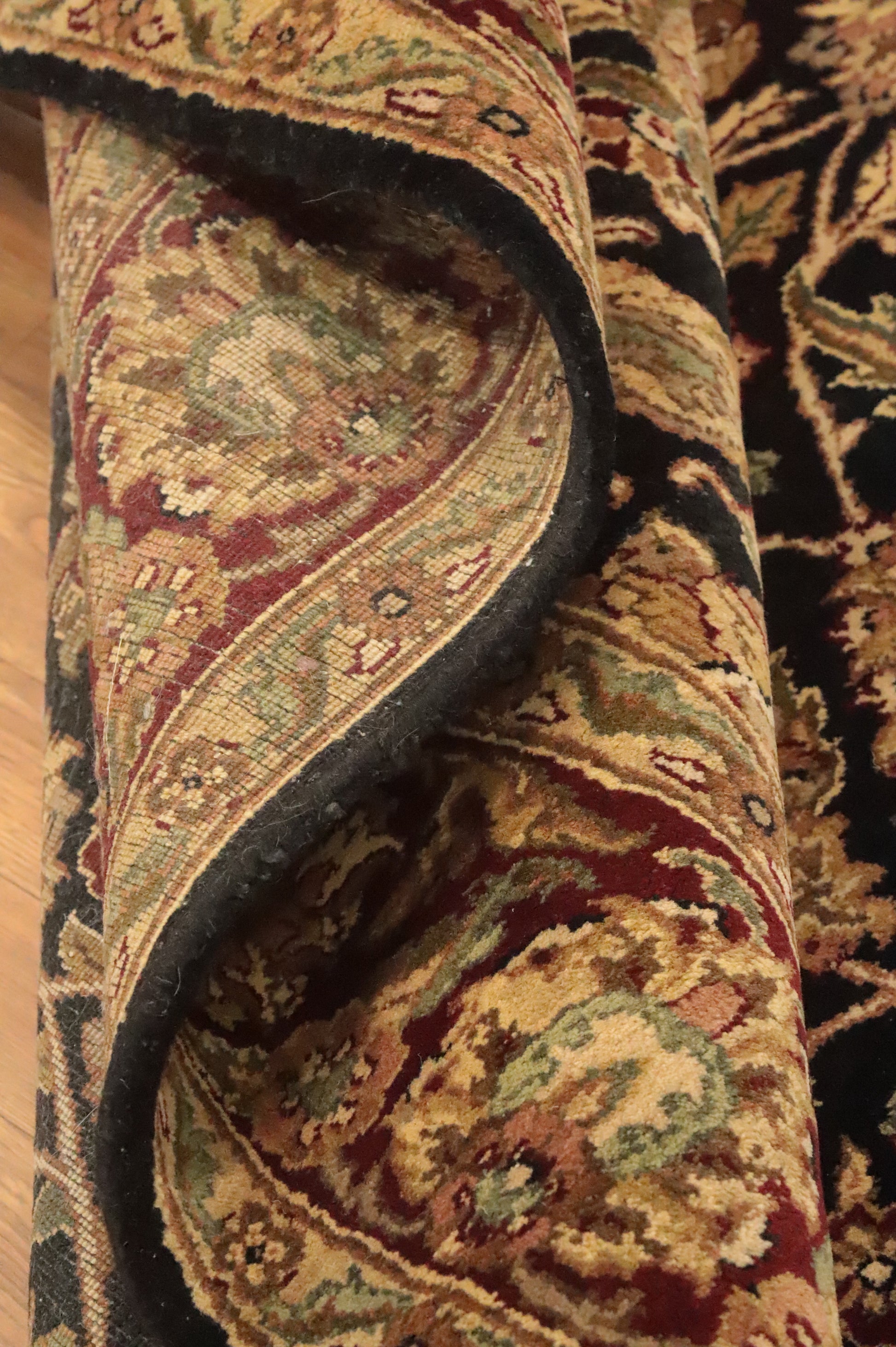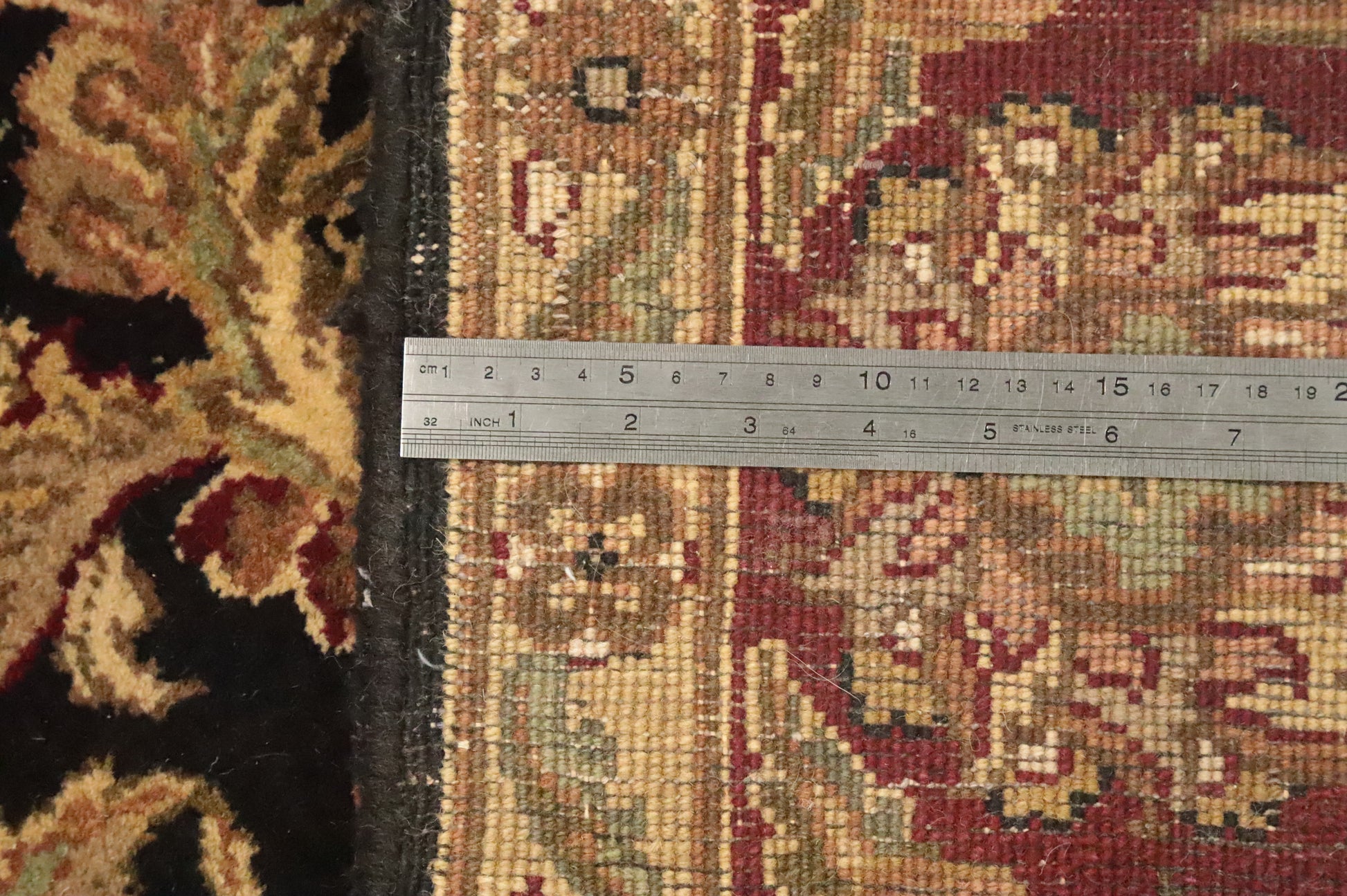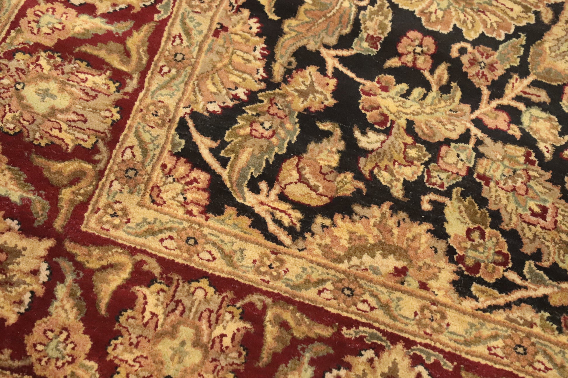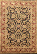 A Beautiful Genuine India Agra rug is Hand Knotted by skillful weavers in India with 100% Wool Material. This rug is in New, First Quality condition. dimensions are 8' 10'' X 5' 11'' in foot and 269 X 180 in centimeter. the primary color is Black.