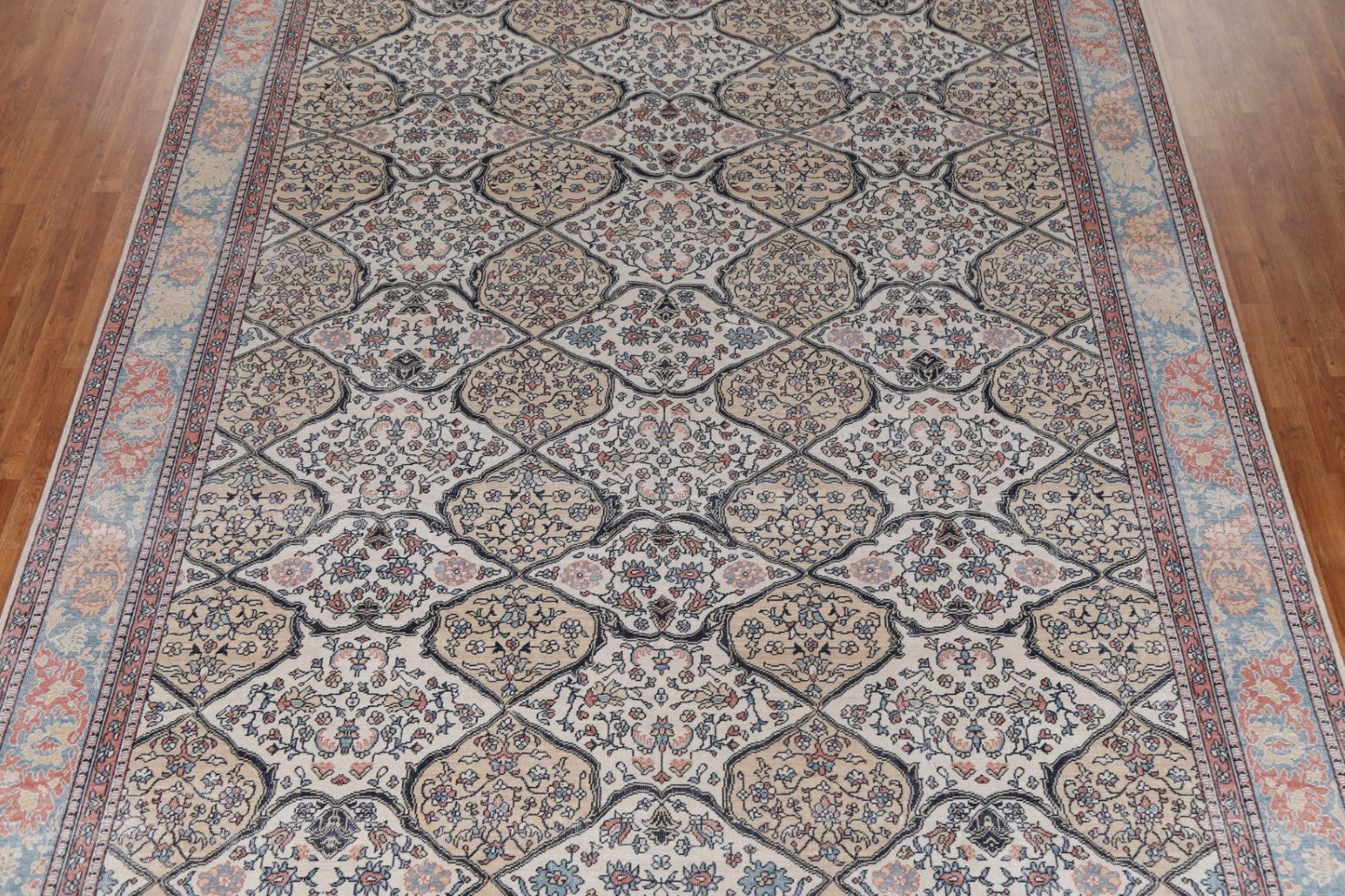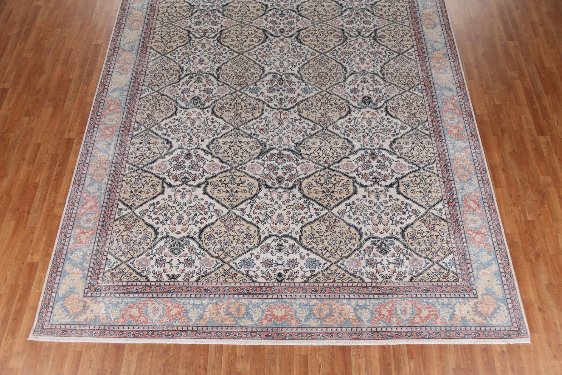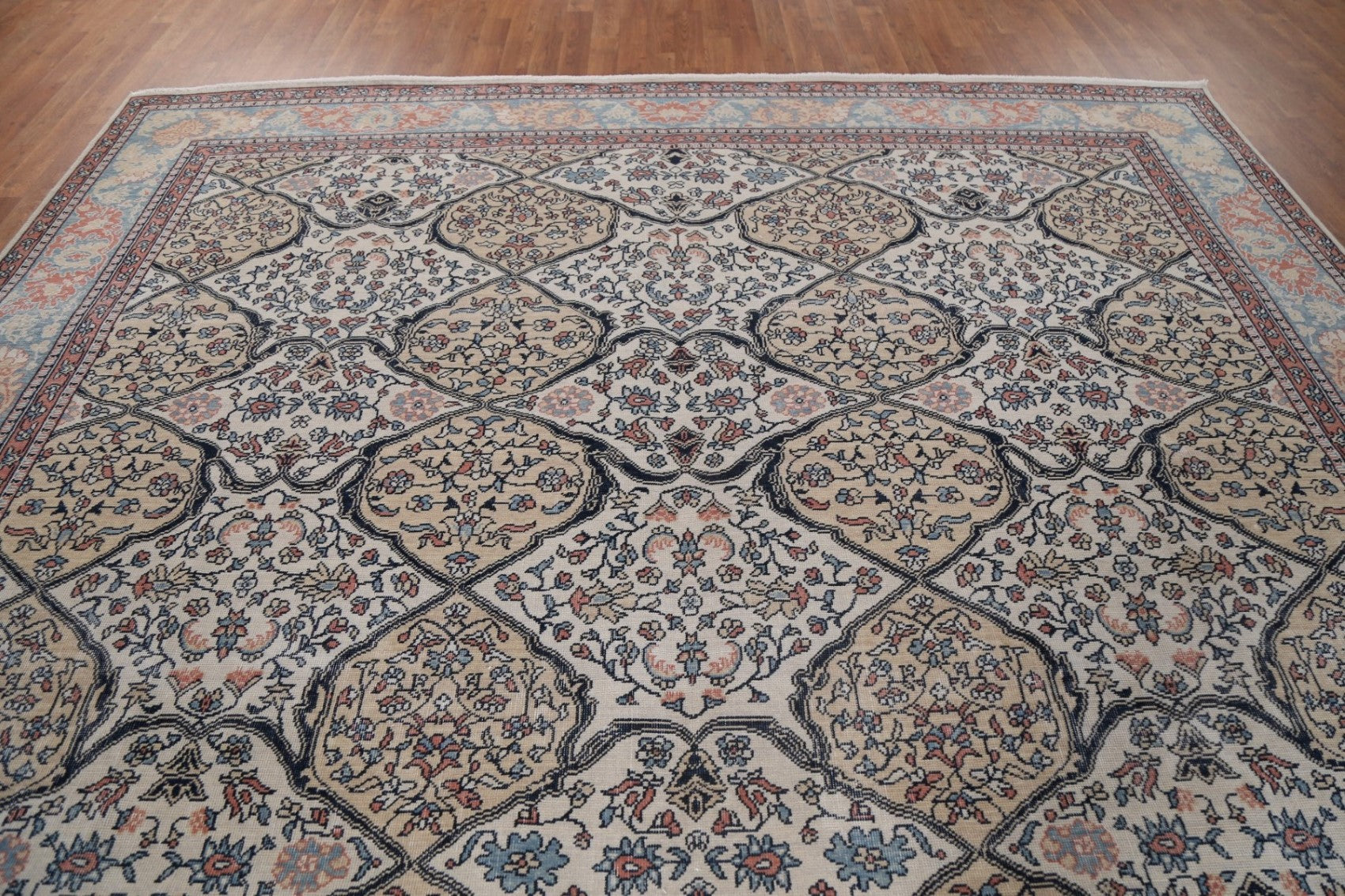 A Beautiful Genuine Turkey Bakhtiari rug is Hand Knotted by skillful weavers in Turkey with 100% Wool Material. This rug is in New, First Quality condition. dimensions are 12' 11'' X 9' 10'' in foot and 394 X 300 in centimeter. the primary color is Beige & Ivories.
