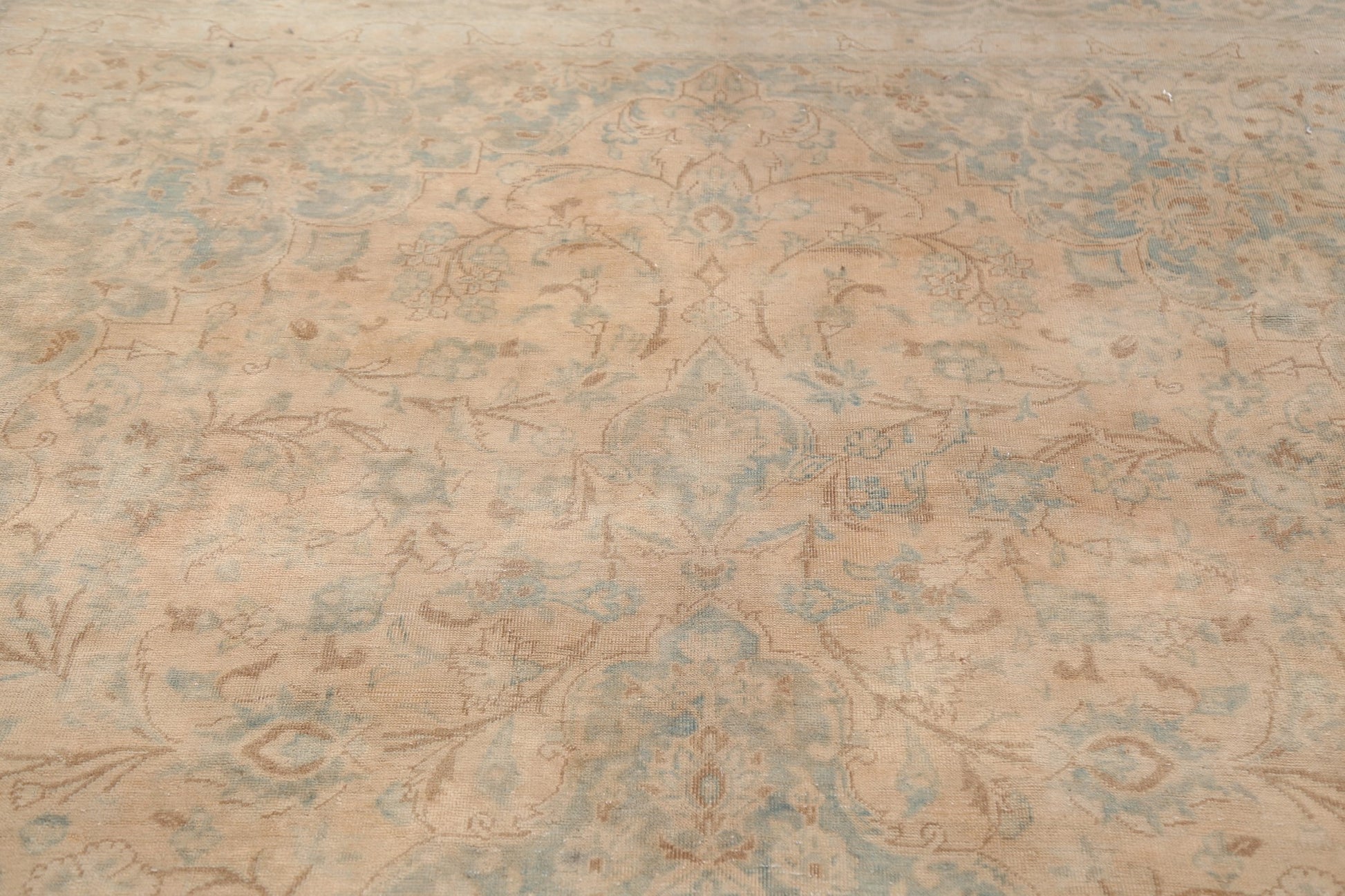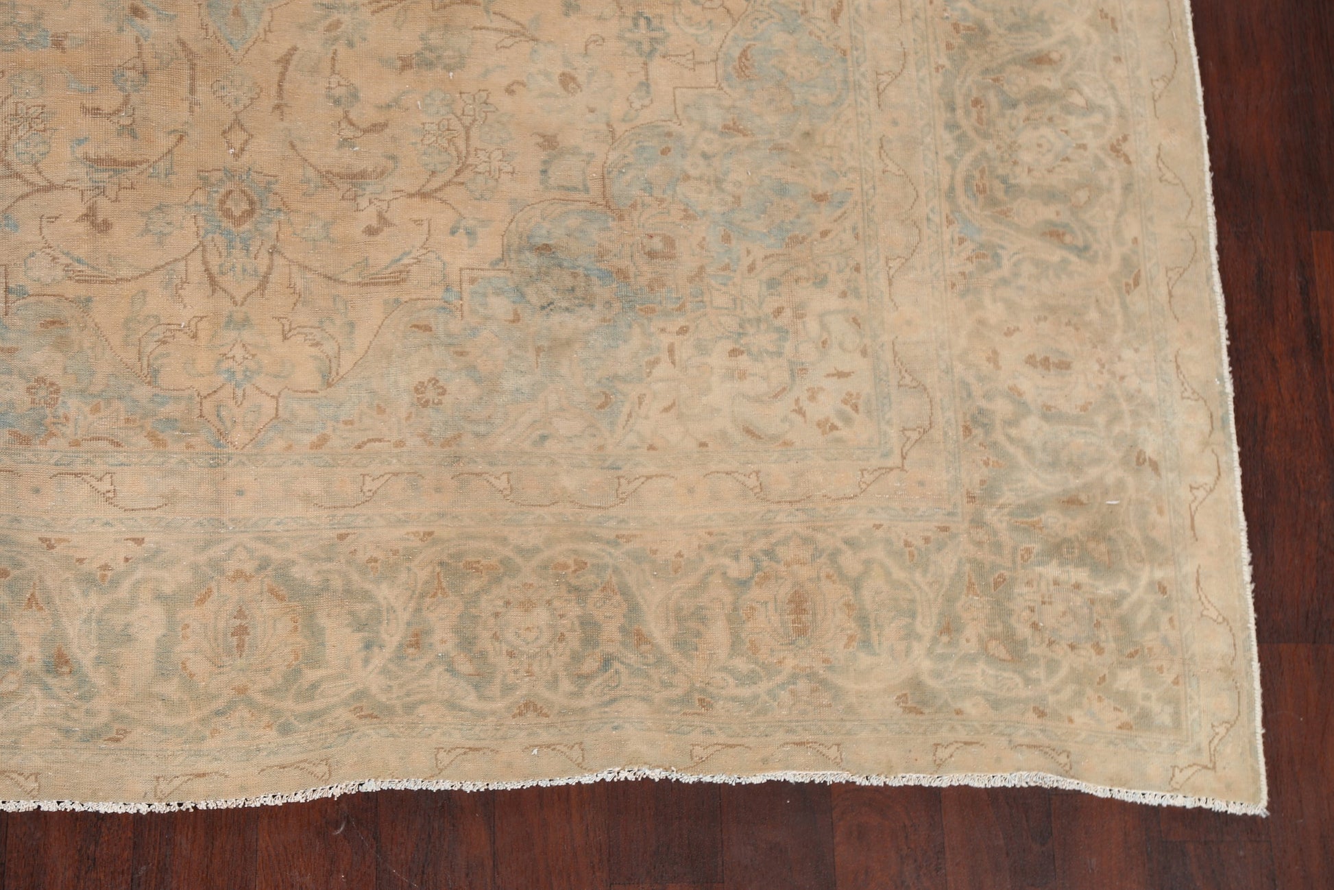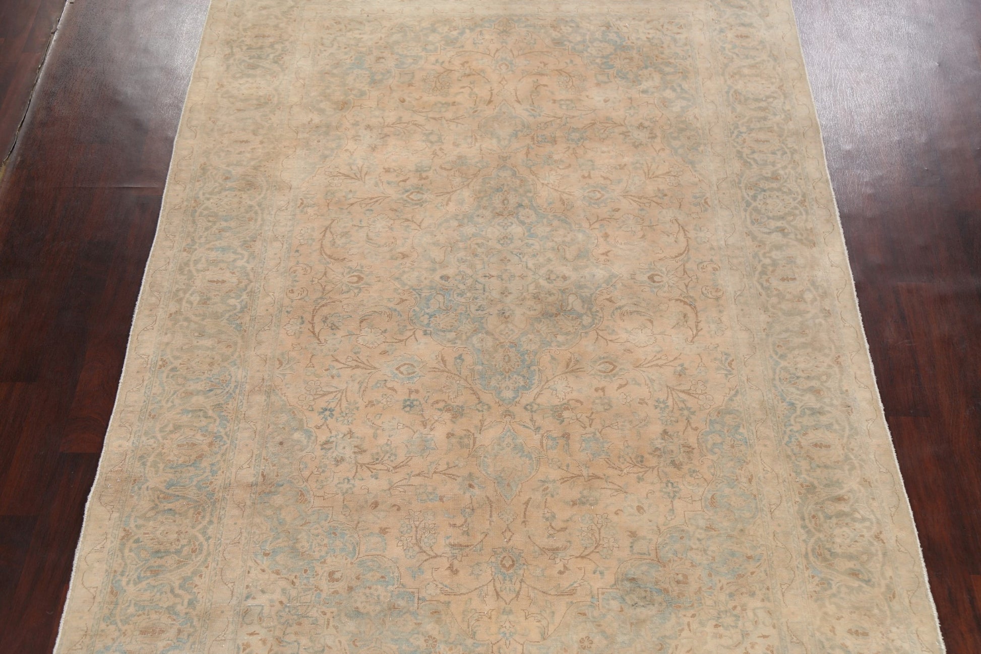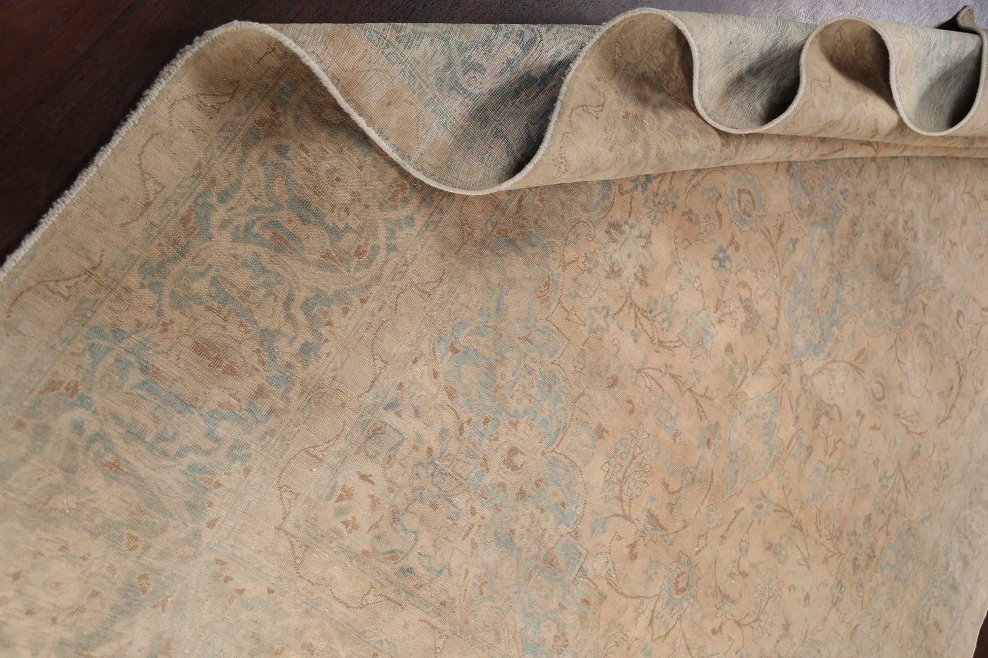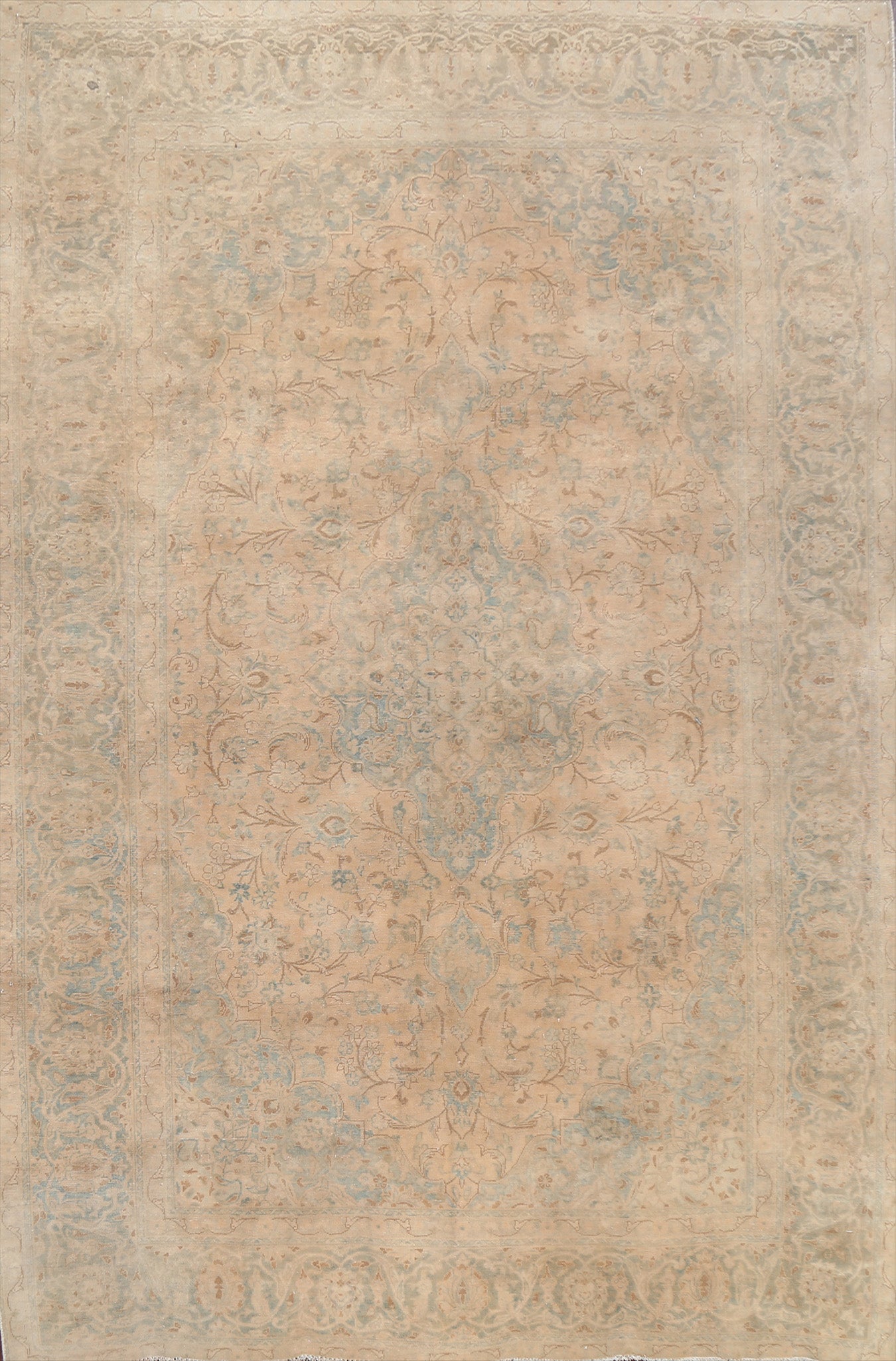 A Beautiful Genuine Persia ( Persia ) Kashan rug is Hand Knotted by skillful weavers in Persia ( Persia ) with 100% Wool Material. This rug is in Very Good (Evenly Low Pile) condition. dimensions are 11' 0'' X 7' 9'' in foot and 335 X 236 in centimeter. the primary color is Beige & Ivories.