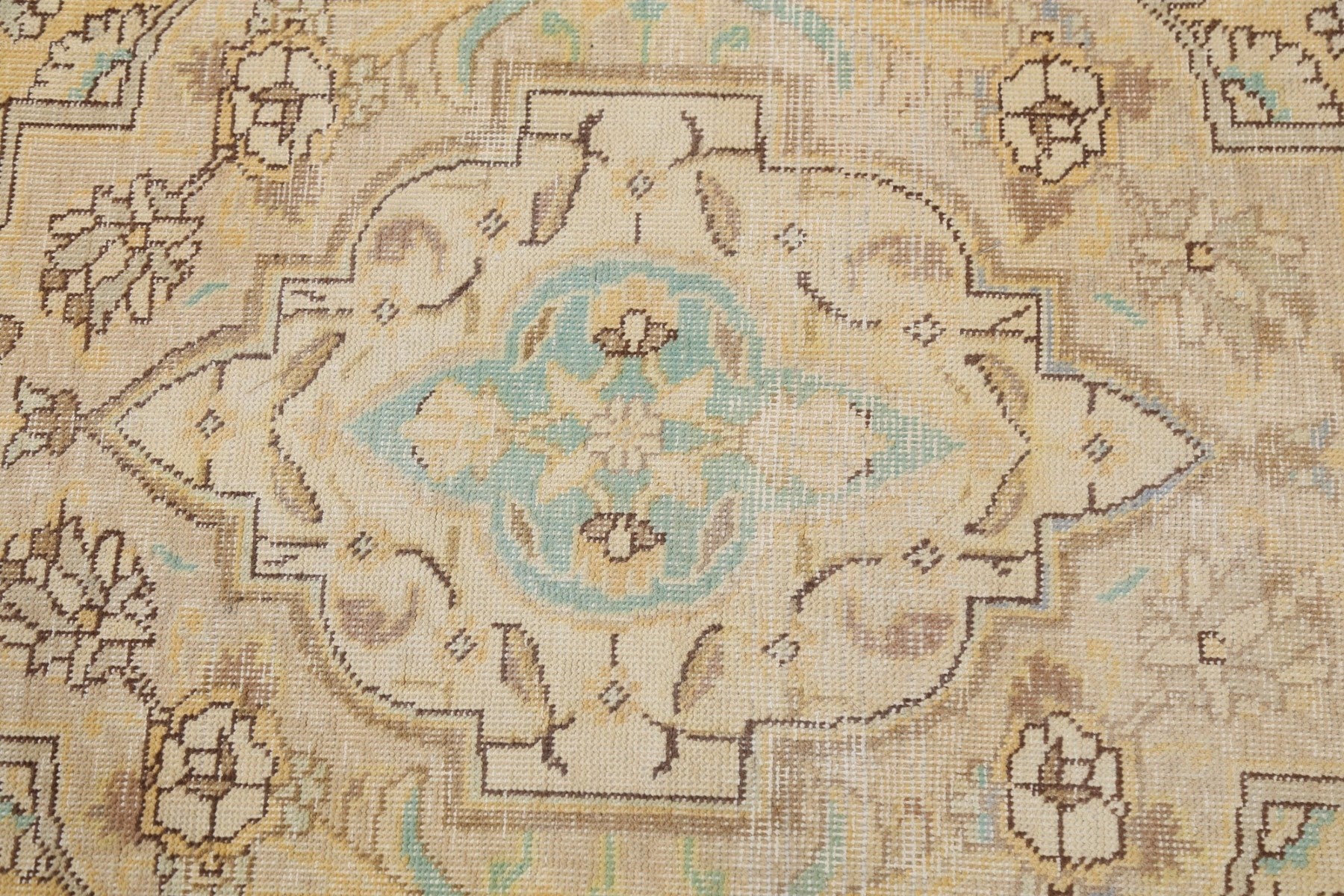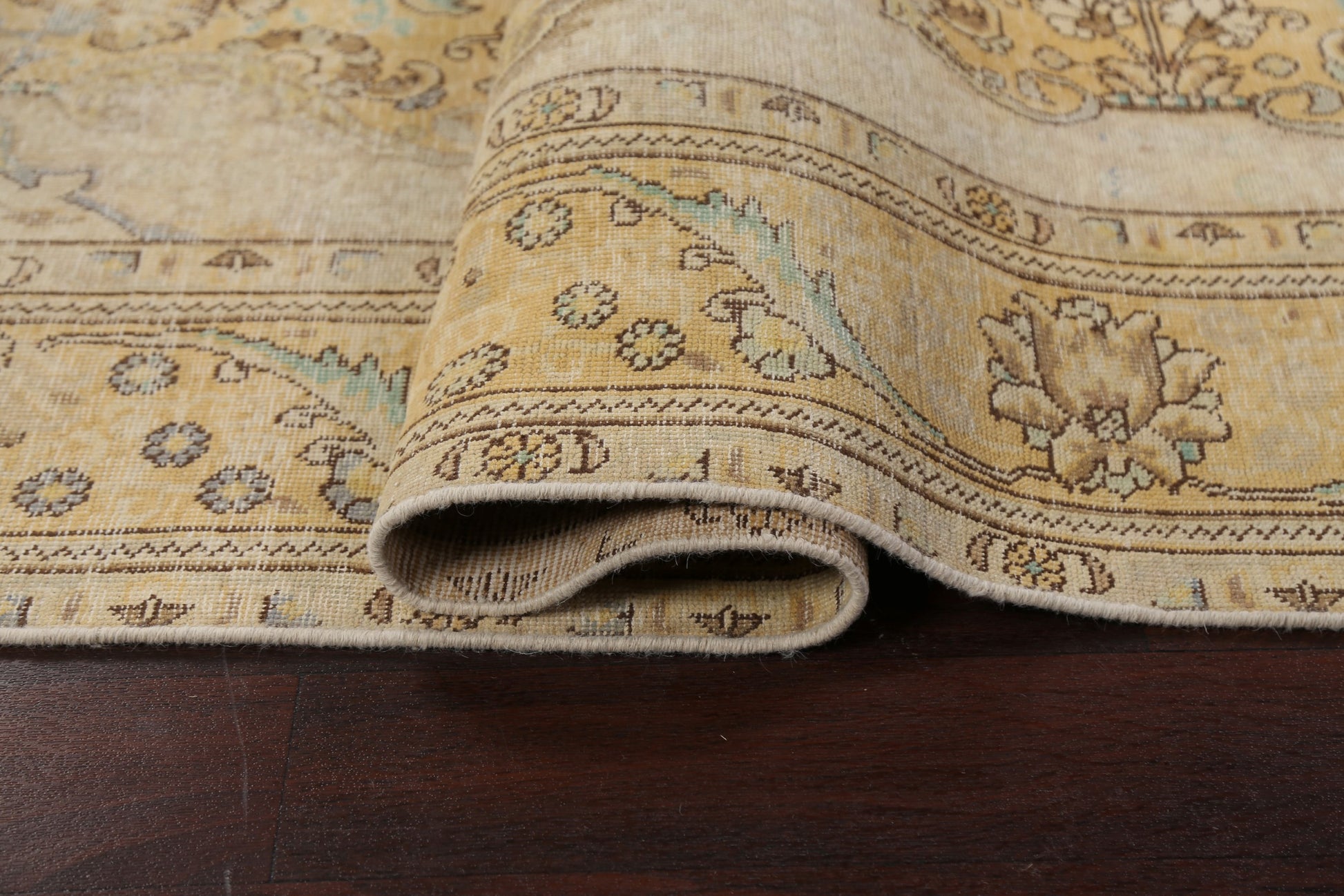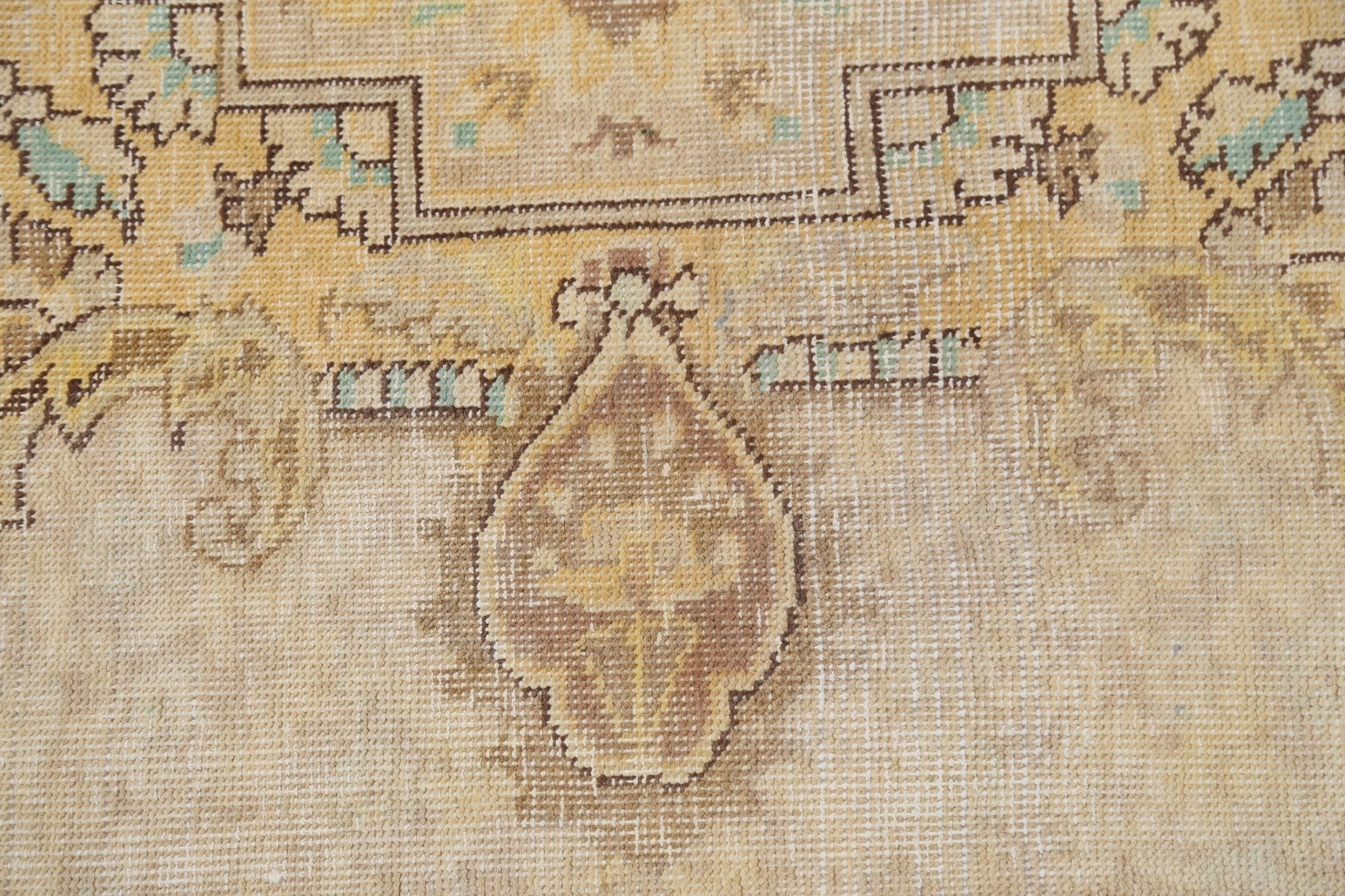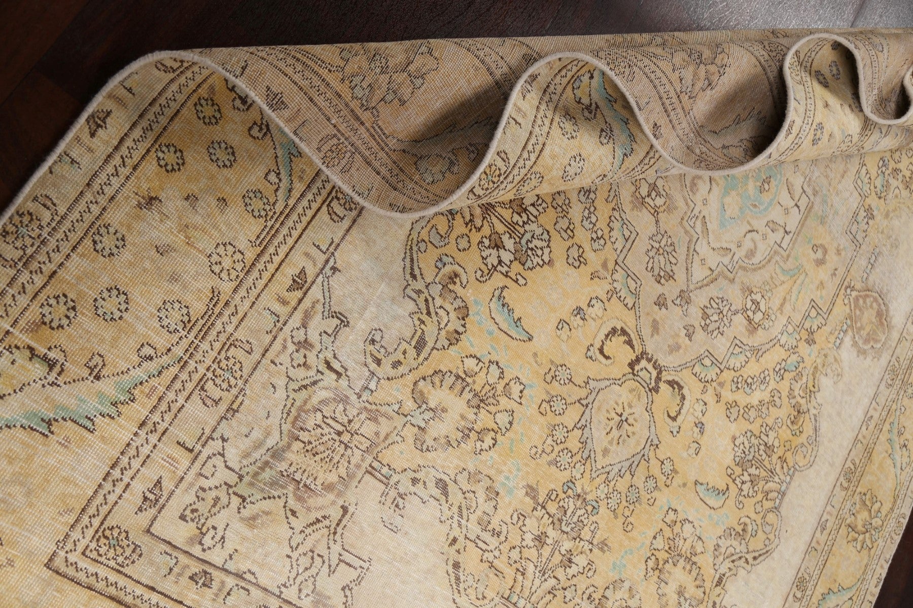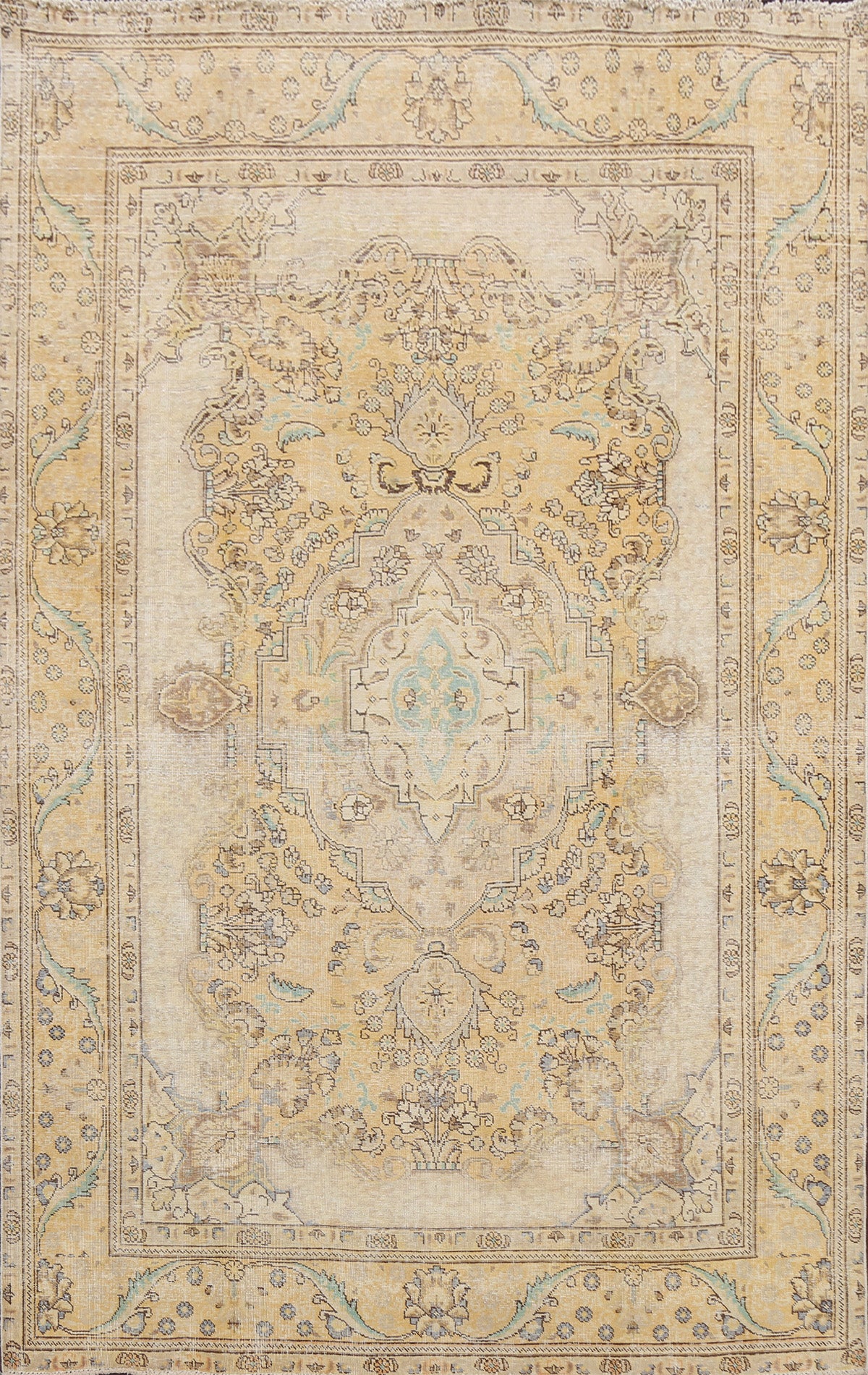 A Beautiful Genuine Persia ( Persia ) Tabriz rug is Hand Knotted by skillful weavers in Persia ( Persia ) with 100% Wool Material. This rug is in Very Good (Evenly Low Pile) condition. dimensions are 9' 4'' X 6' 4'' in foot and 284 X 193 in centimeter. the primary color is Yellow & Gold.