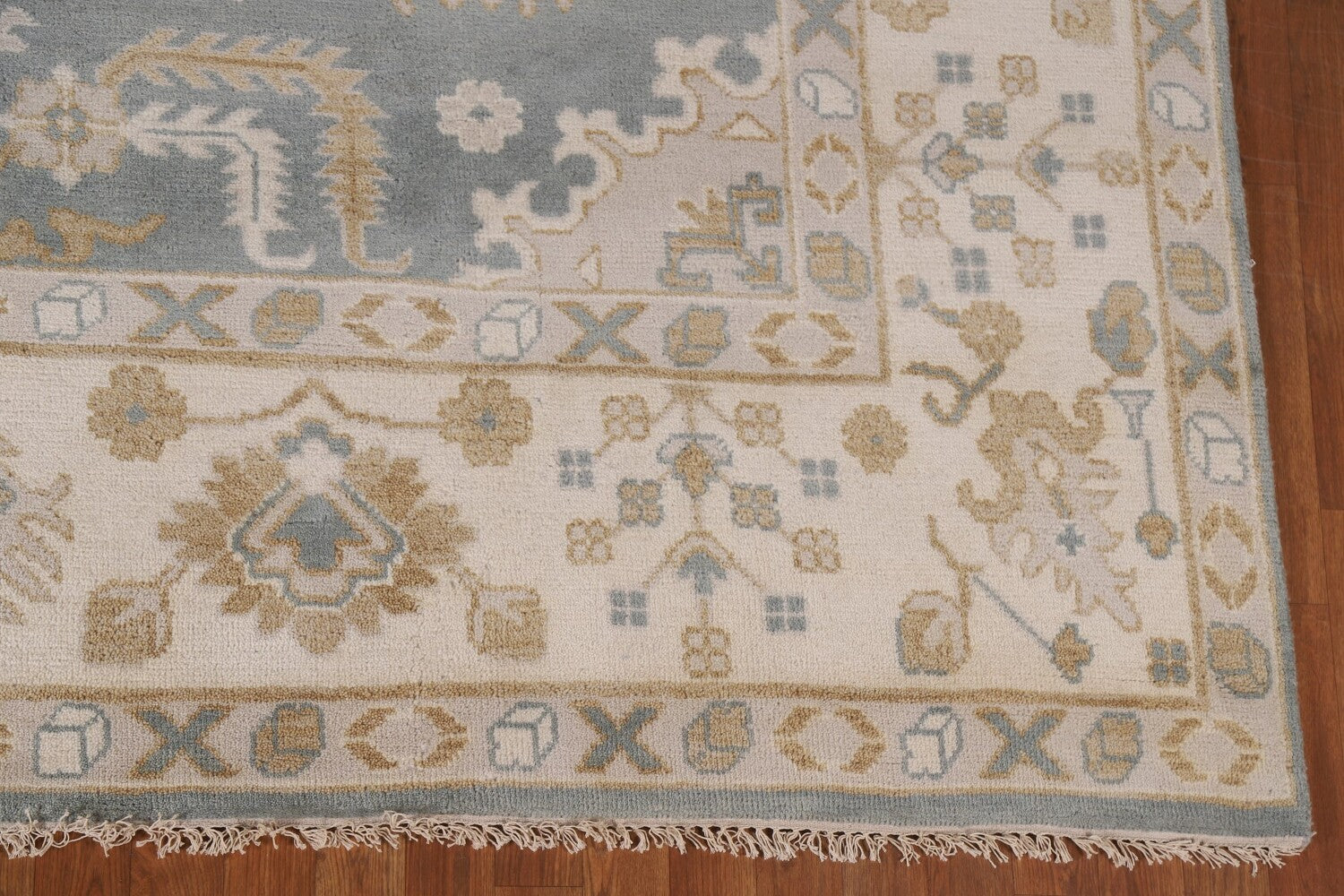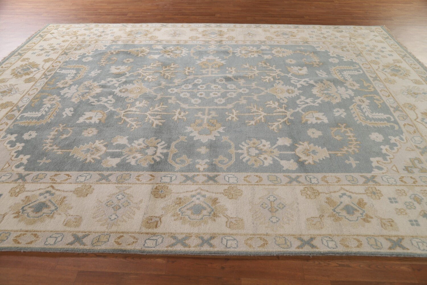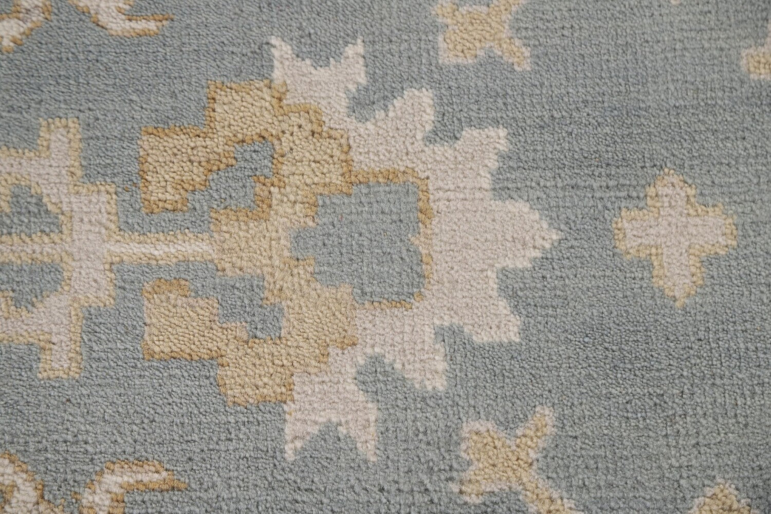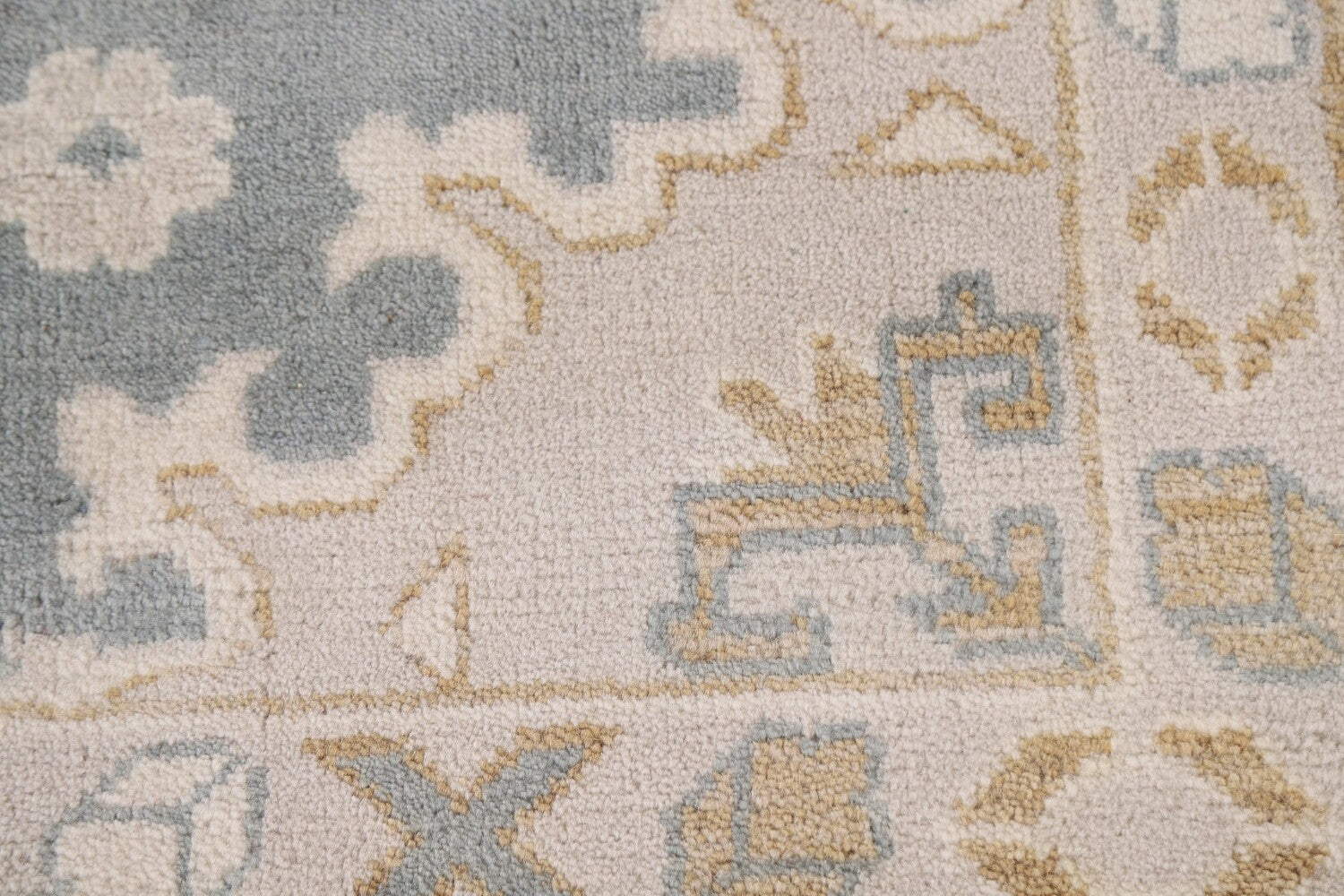 A Beautiful Genuine India Oushak rug is Hand Knotted by skillful weavers in India with 100% Wool Material. This rug is in New, First Quality condition. dimensions are 11' 8'' X 8' 11'' in foot and 356 X 272 in centimeter. the primary color is Greys & Charcoal.