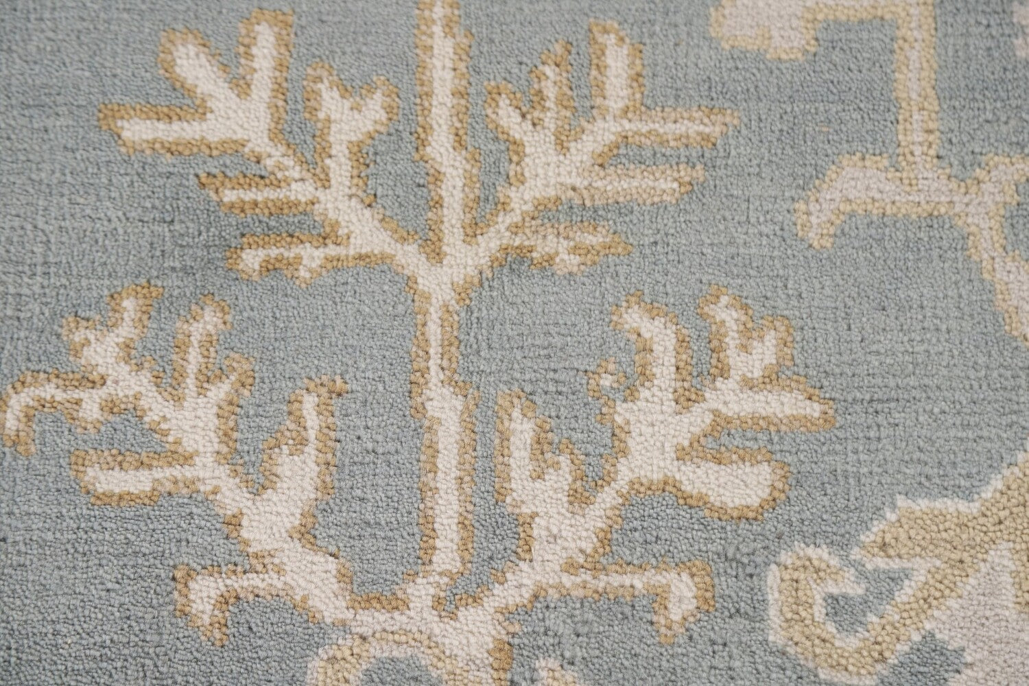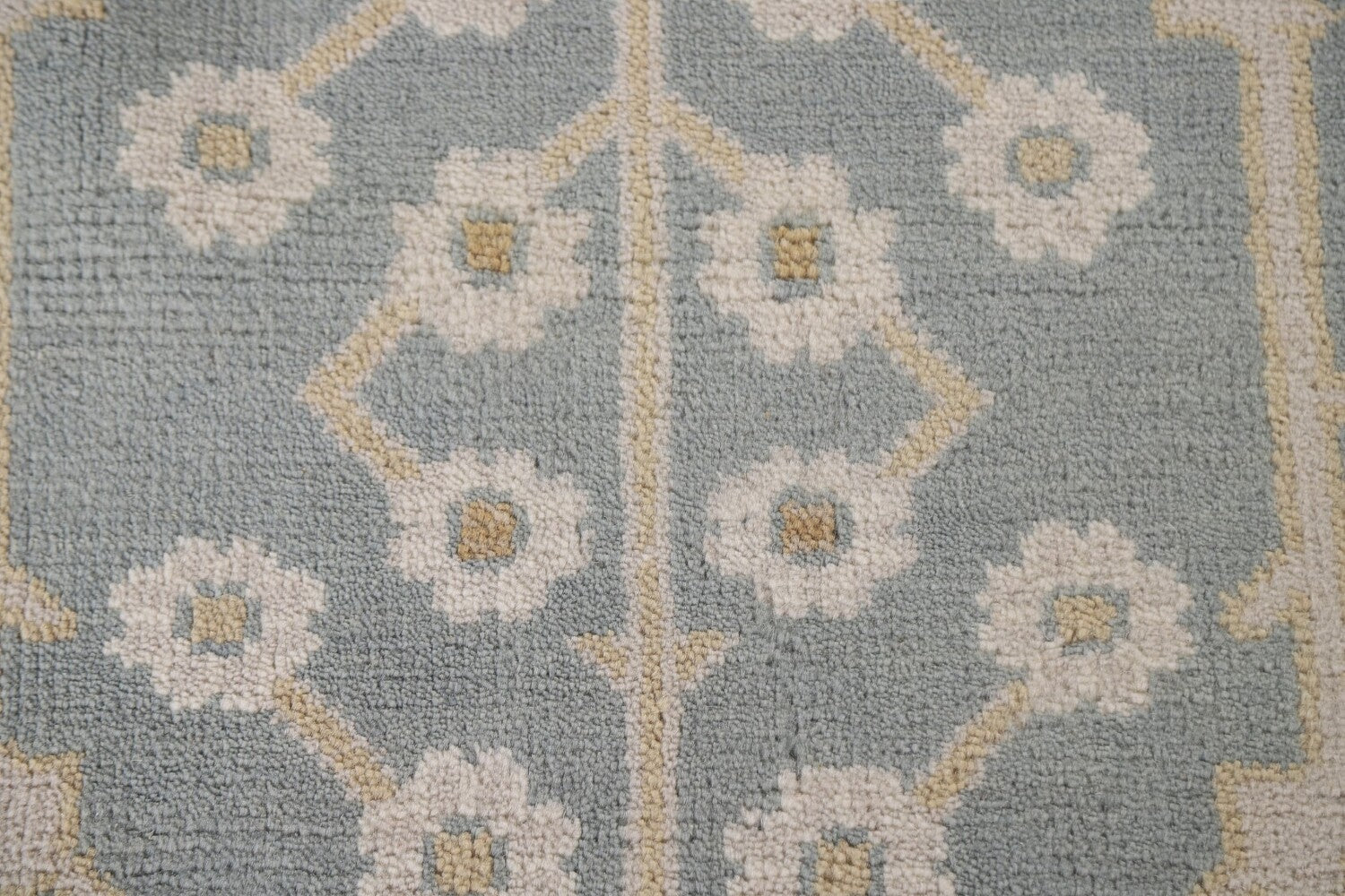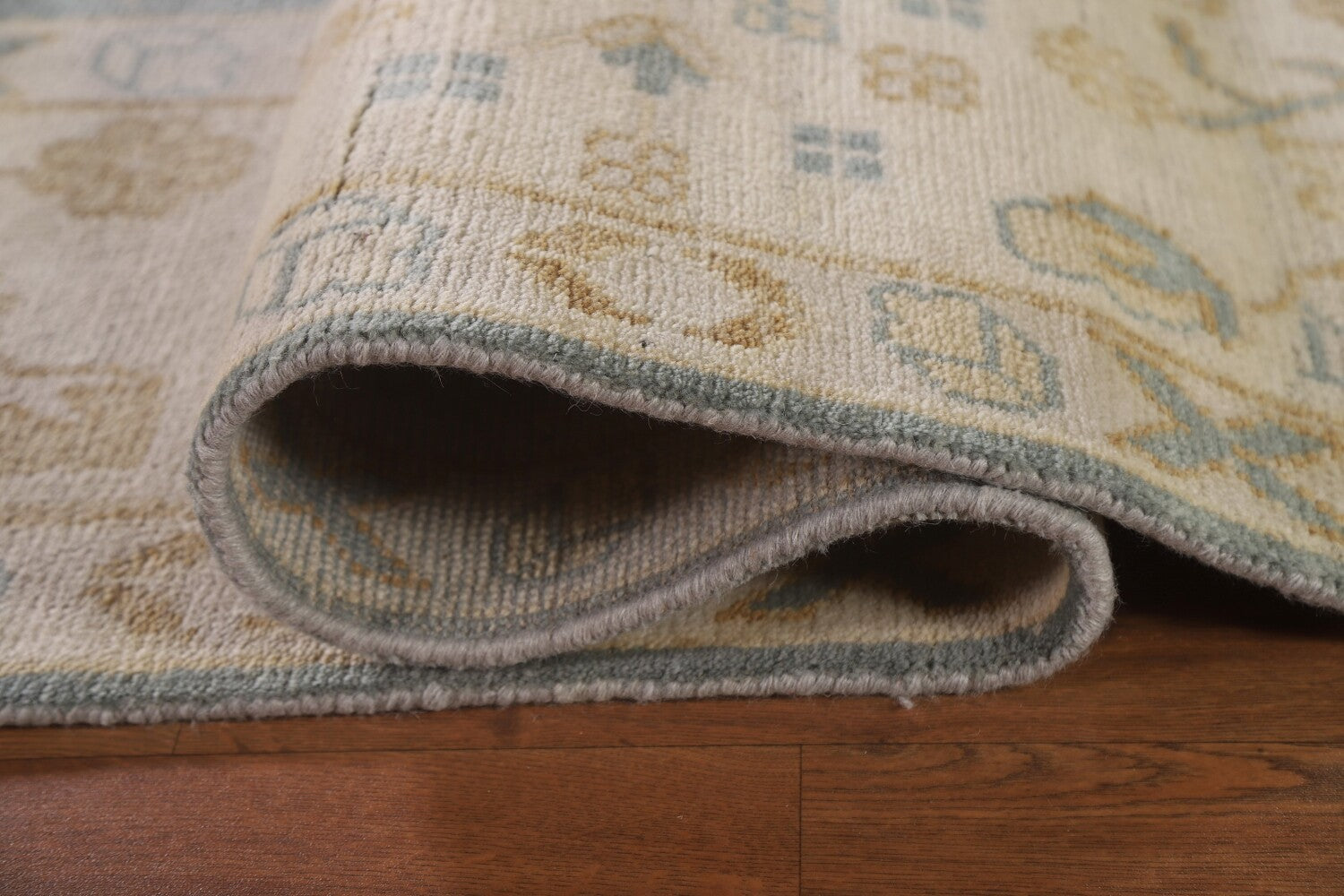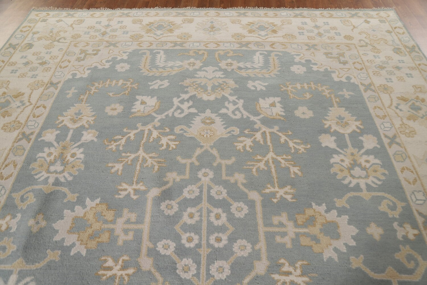 A Beautiful Genuine India Oushak rug is Hand Knotted by skillful weavers in India with 100% Wool Material. This rug is in New, First Quality condition. dimensions are 11' 8'' X 8' 11'' in foot and 356 X 272 in centimeter. the primary color is Greys & Charcoal.