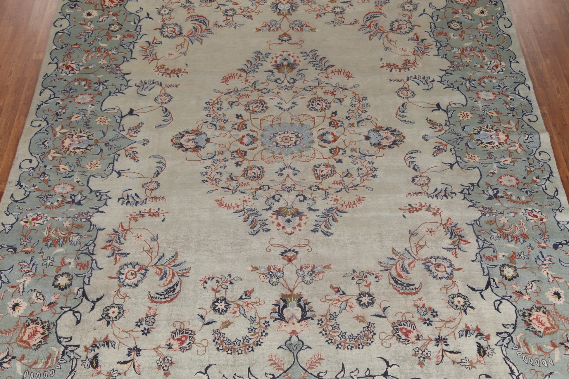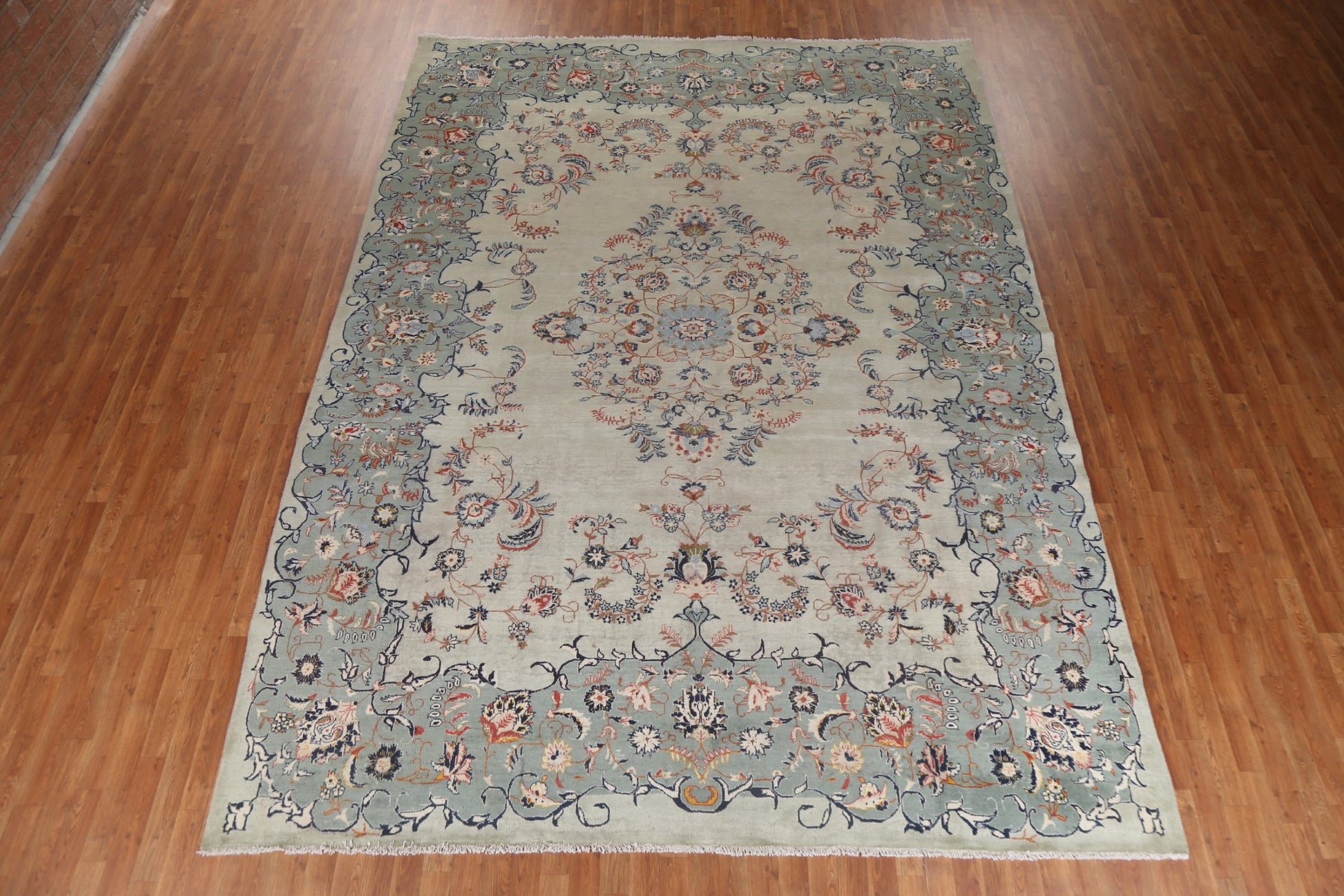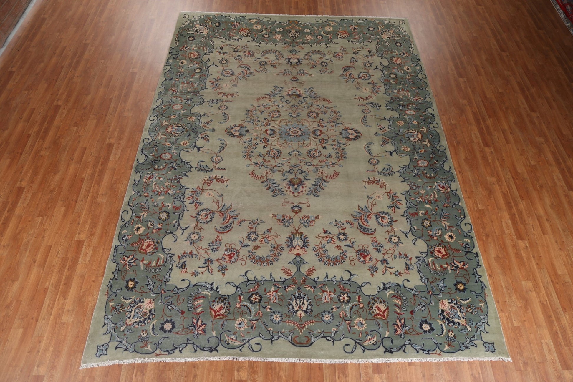 A Beautiful Genuine Persia ( Persia ) Kashan rug is Hand Knotted by skillful weavers in Persia ( Persia ) with 100% Wool Material. This rug is in Good (Low Pile) condition. dimensions are 13' 0'' X 9' 5'' in foot and 396 X 287 in centimeter. the primary color is Green.