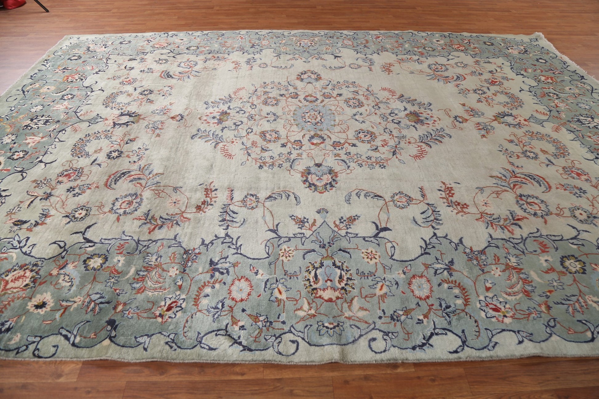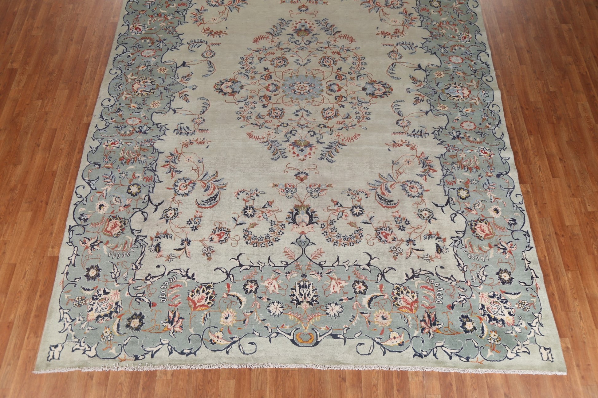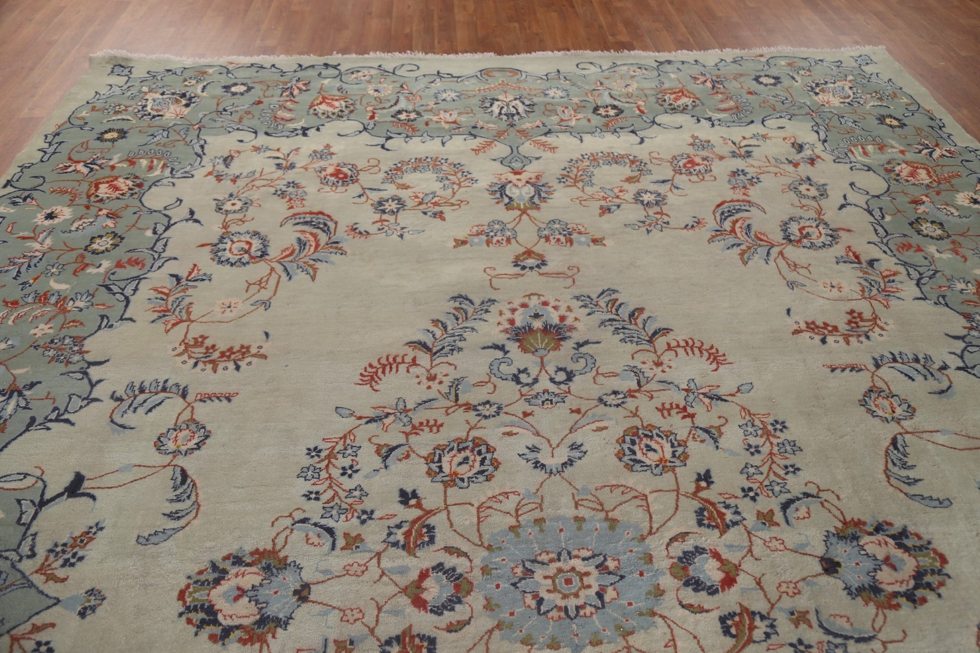 A Beautiful Genuine Persia ( Persia ) Kashan rug is Hand Knotted by skillful weavers in Persia ( Persia ) with 100% Wool Material. This rug is in Good (Low Pile) condition. dimensions are 13' 0'' X 9' 5'' in foot and 396 X 287 in centimeter. the primary color is Green.