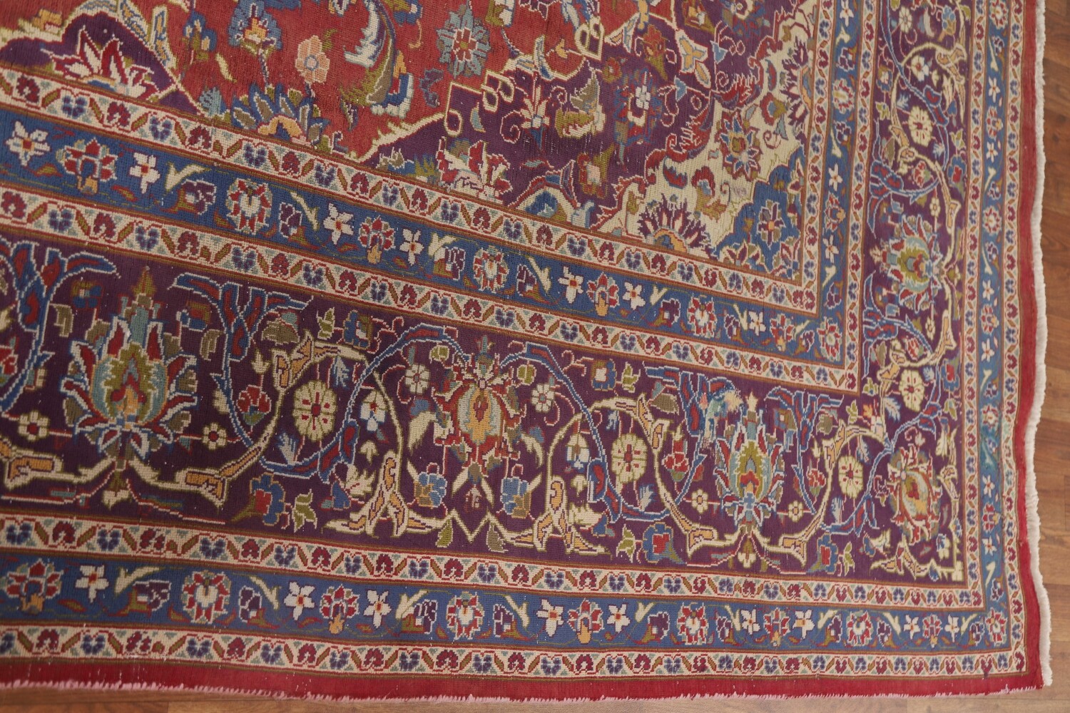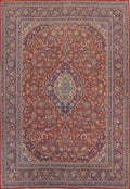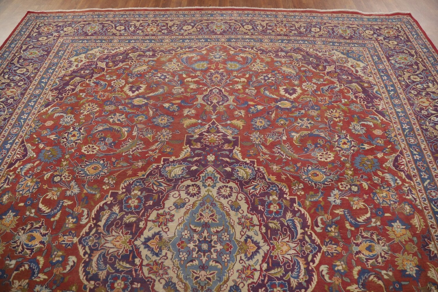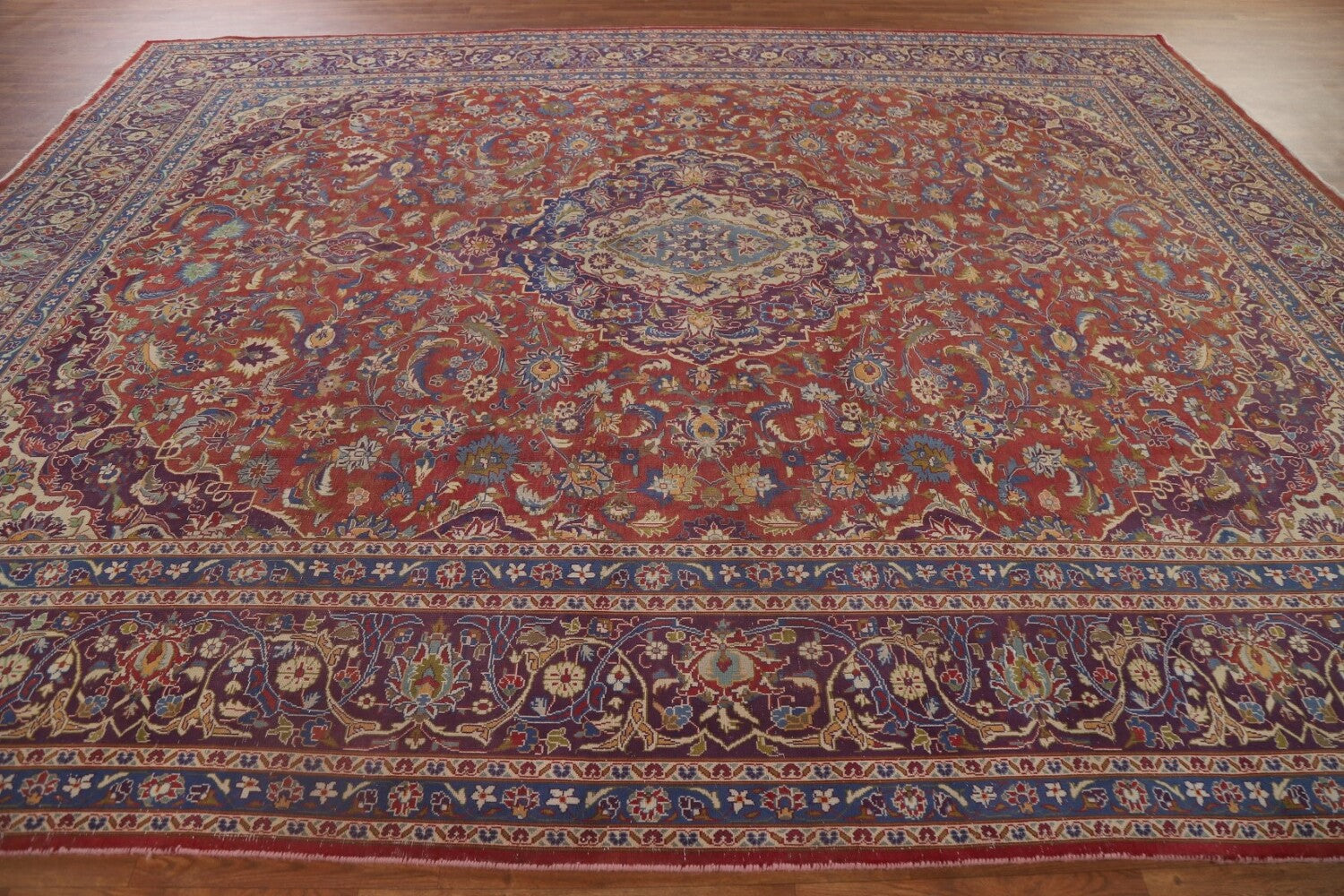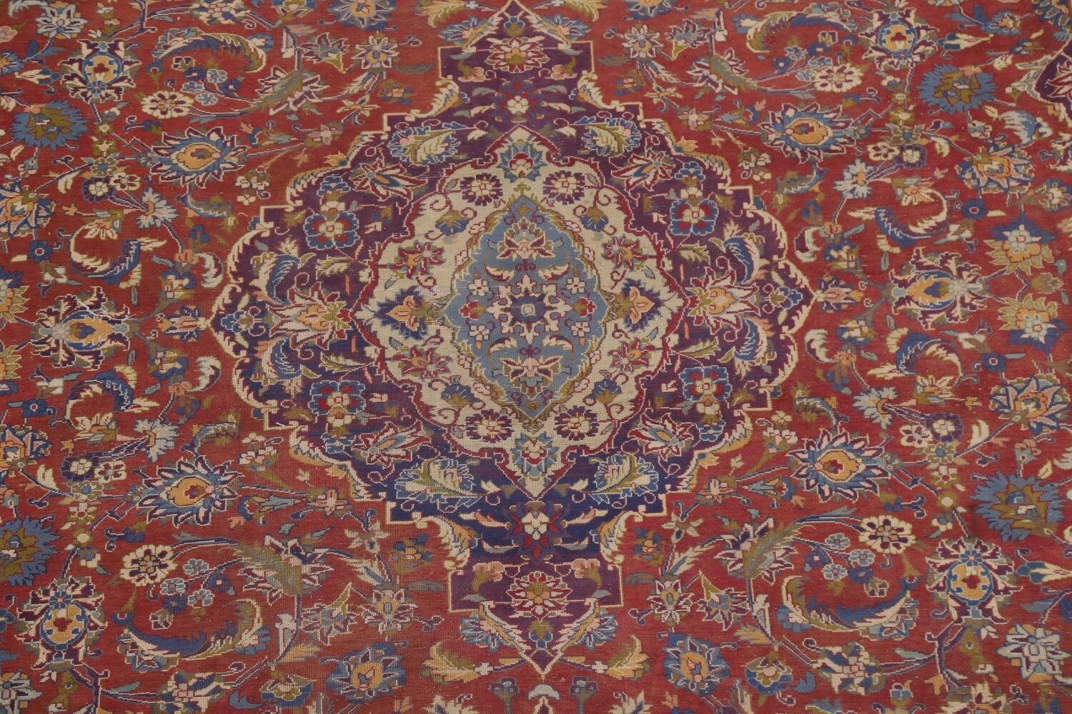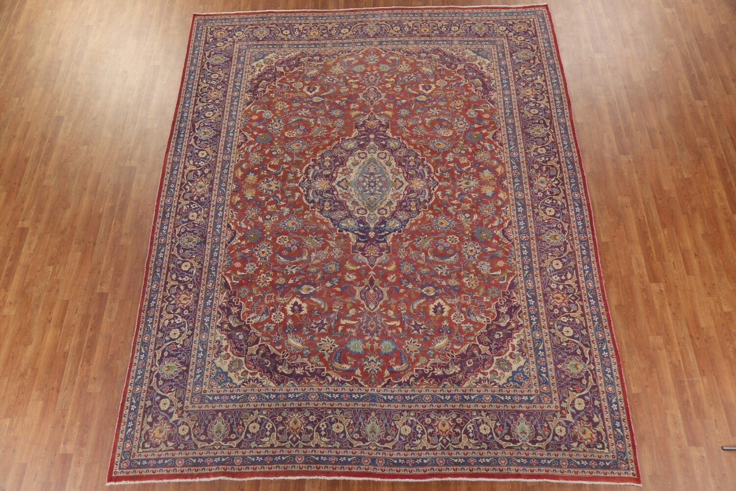 A Beautiful Genuine Persia ( Persia ) Kashan rug is Hand Knotted by skillful weavers in Persia ( Persia ) with 100% Wool Material. This rug is in Very Good (Evenly Low Pile) condition. dimensions are 12' 2'' X 9' 9'' in foot and 371 X 297 in centimeter. the primary color is Oranges & Rust.