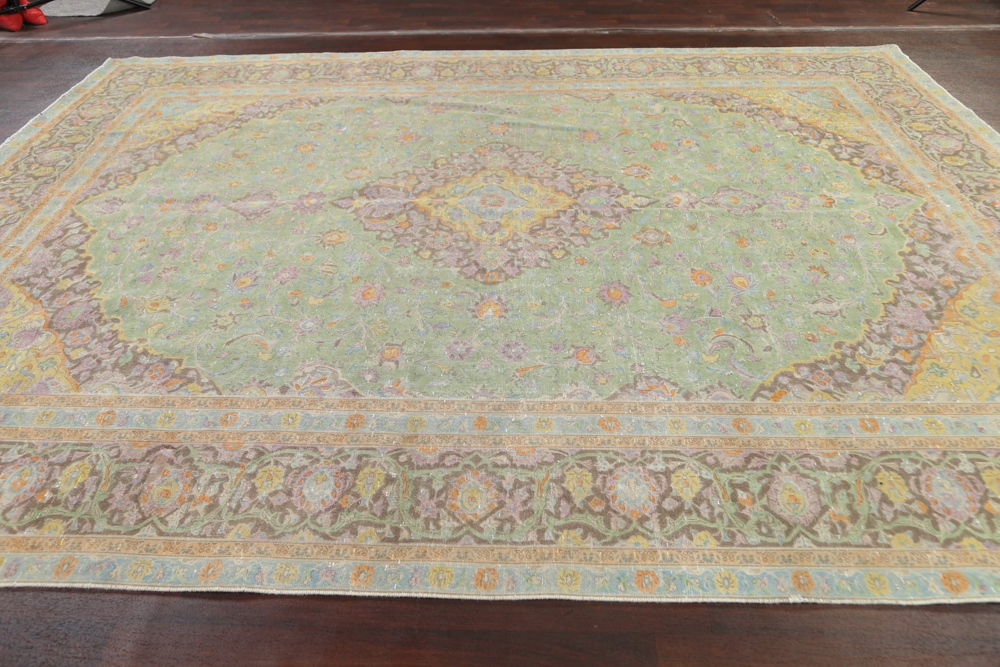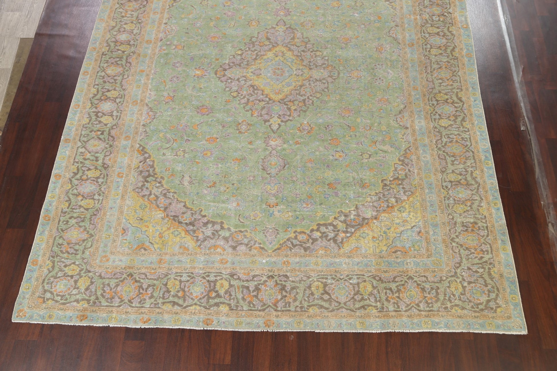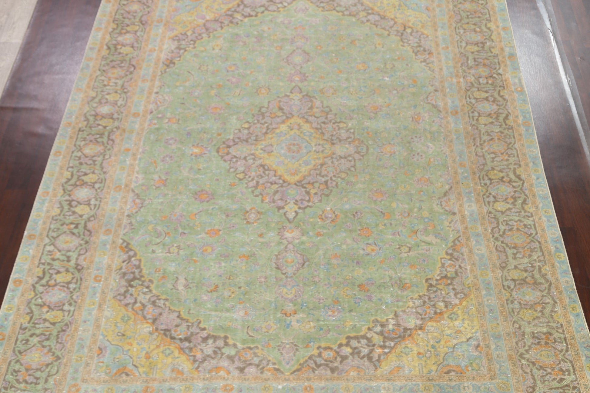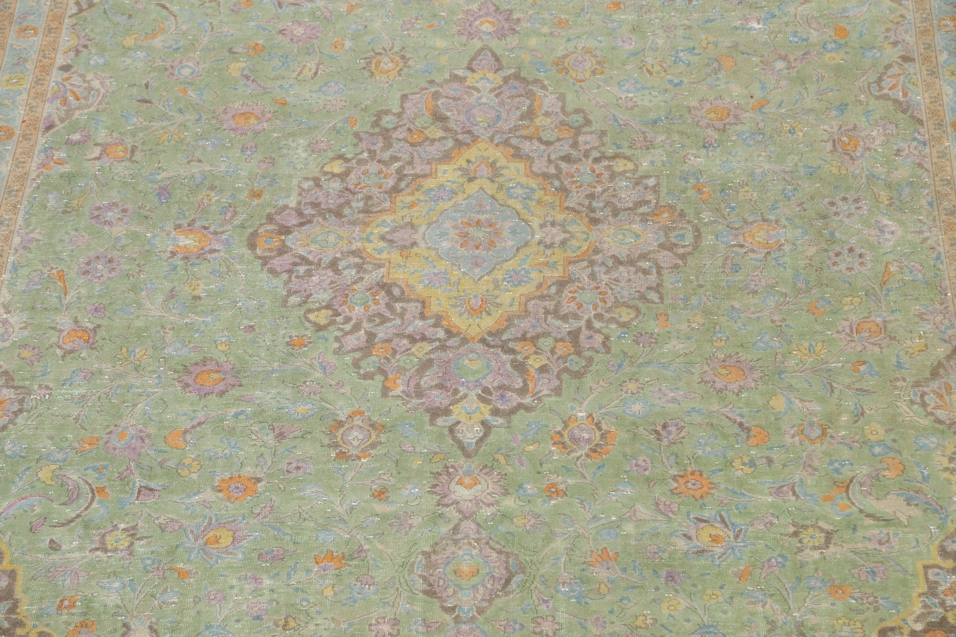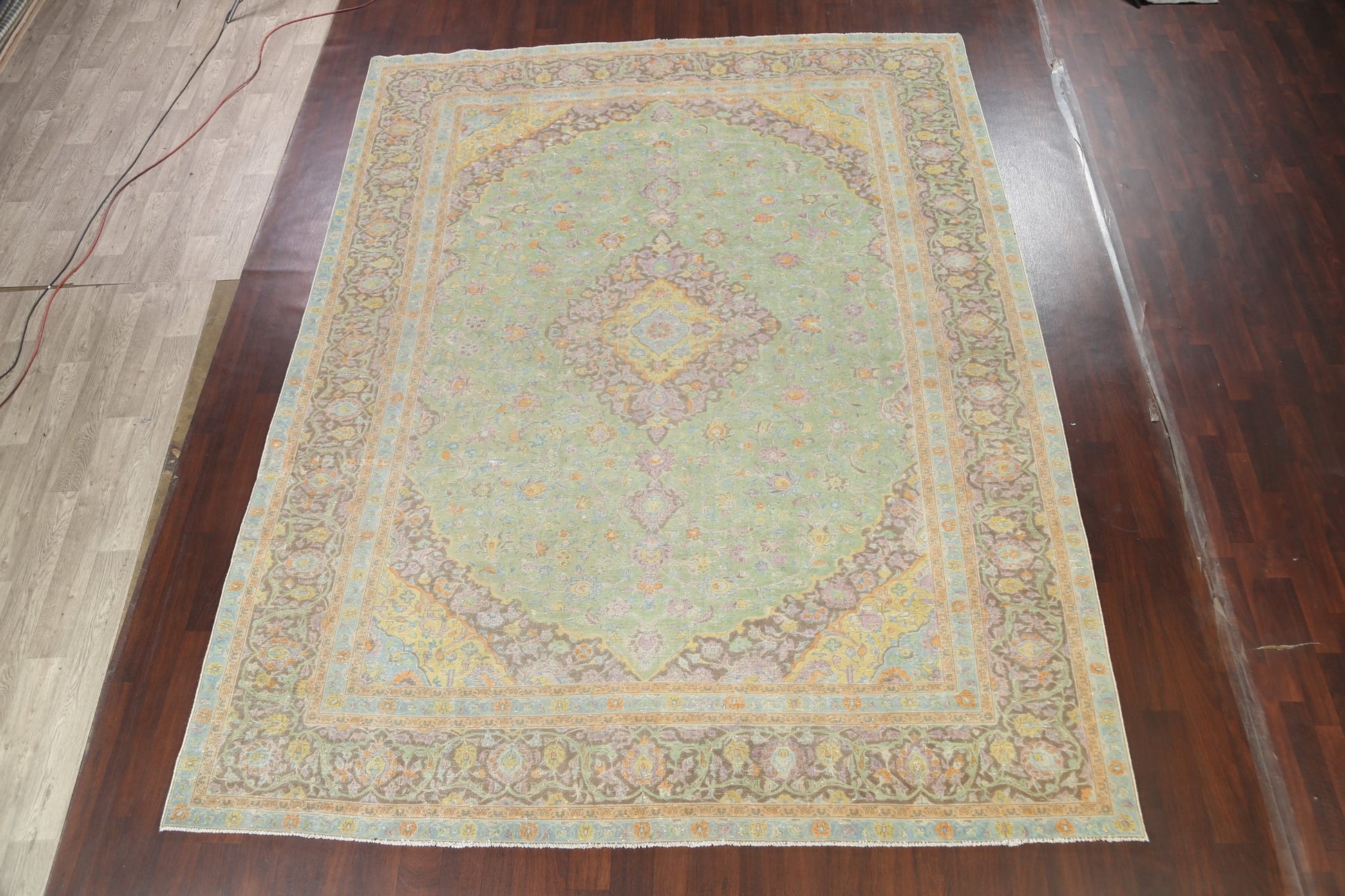 A Beautiful Genuine Persia ( Persia ) Kashan rug is Hand Knotted by skillful weavers in Persia ( Persia ) with 100% Wool Material. This rug is in Very Good (Evenly Low Pile-Repair) condition. dimensions are 12' 8'' X 9' 9'' in foot and 386 X 297 in centimeter. the primary color is Green.
